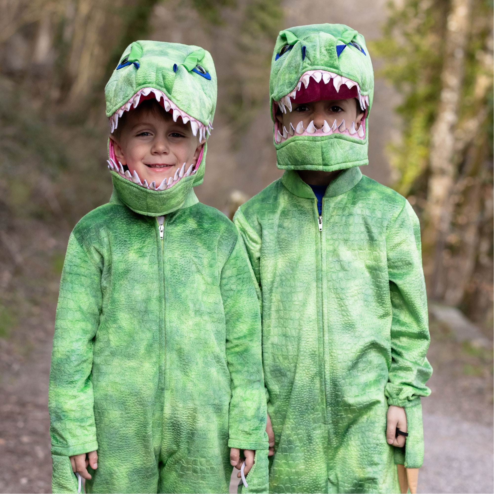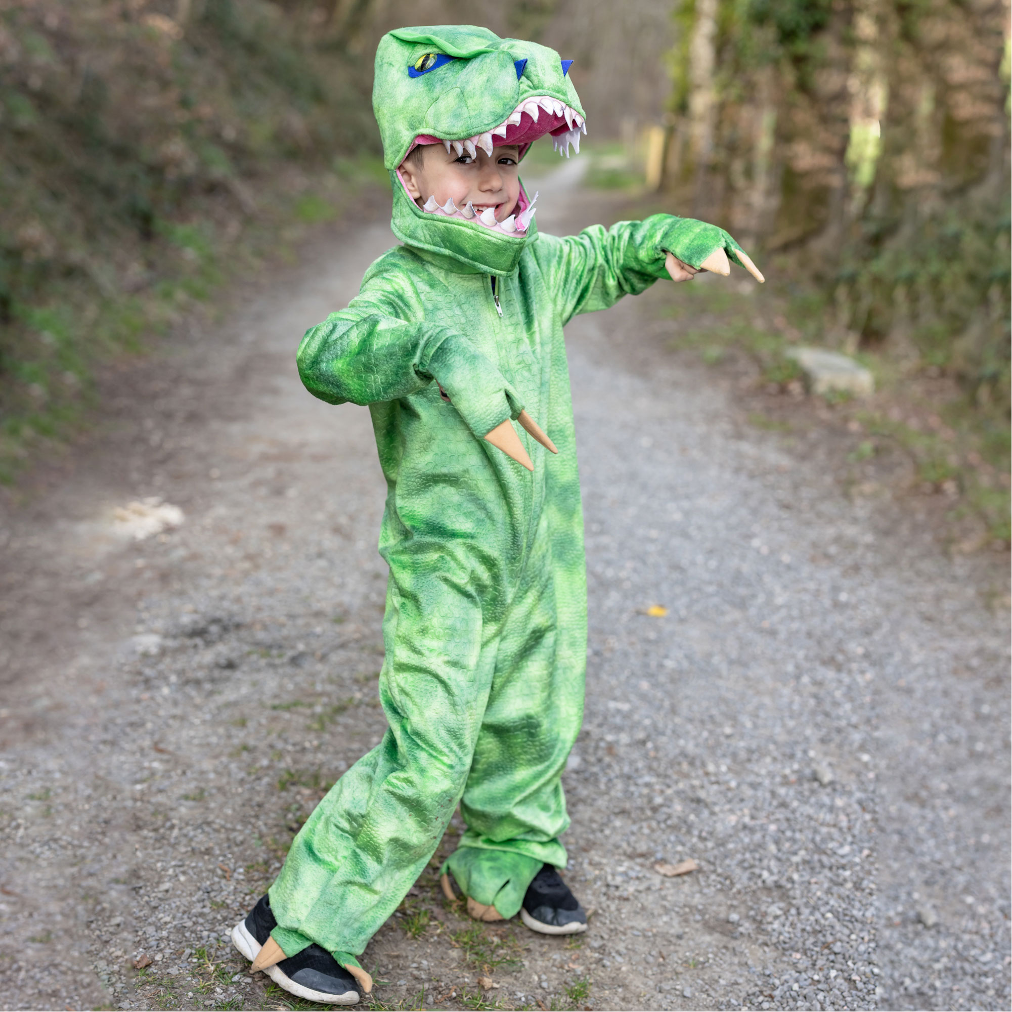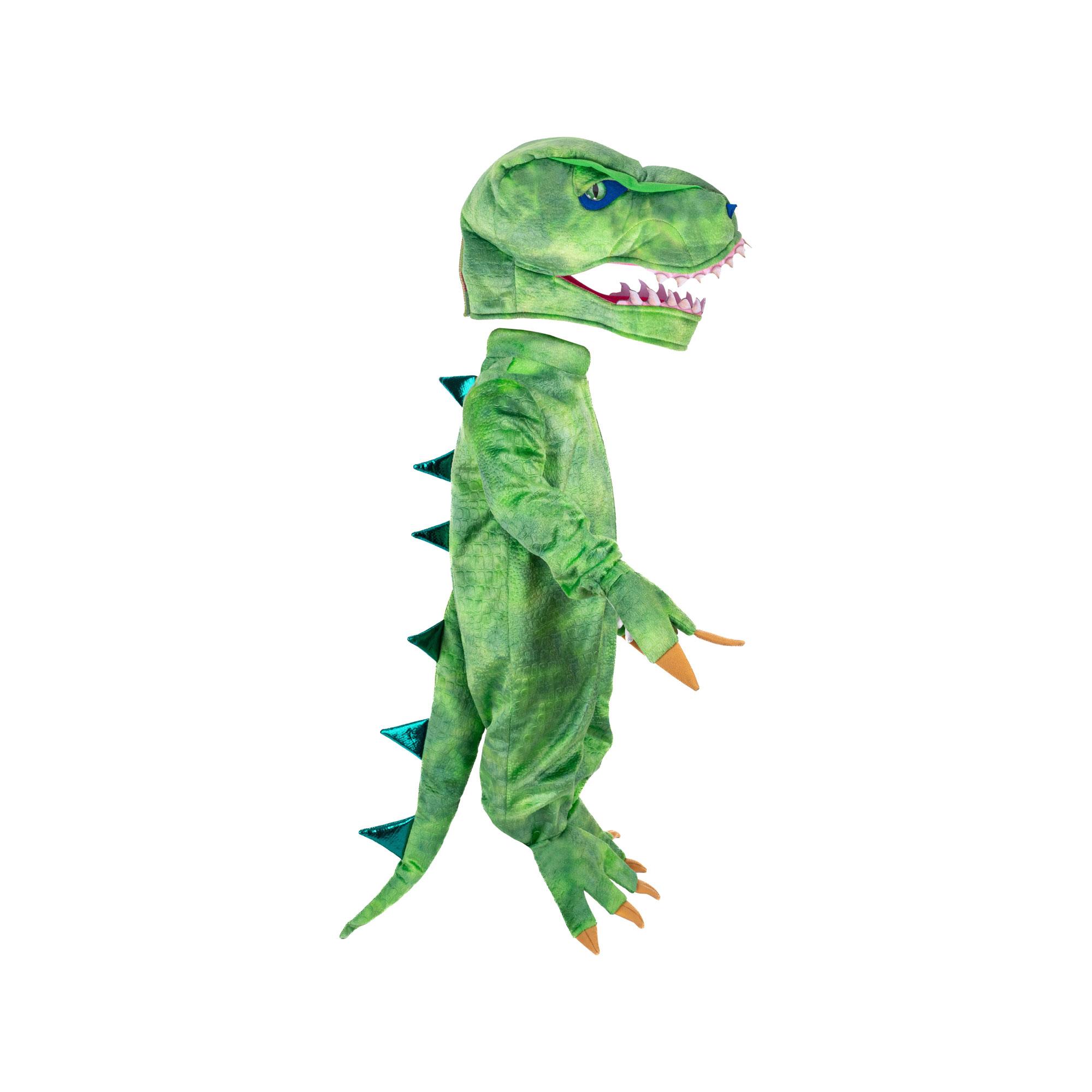 - One-piece costume, front zip fastening, tail detail, metallic green spikes, matching plush T-Rex head with stuffed details