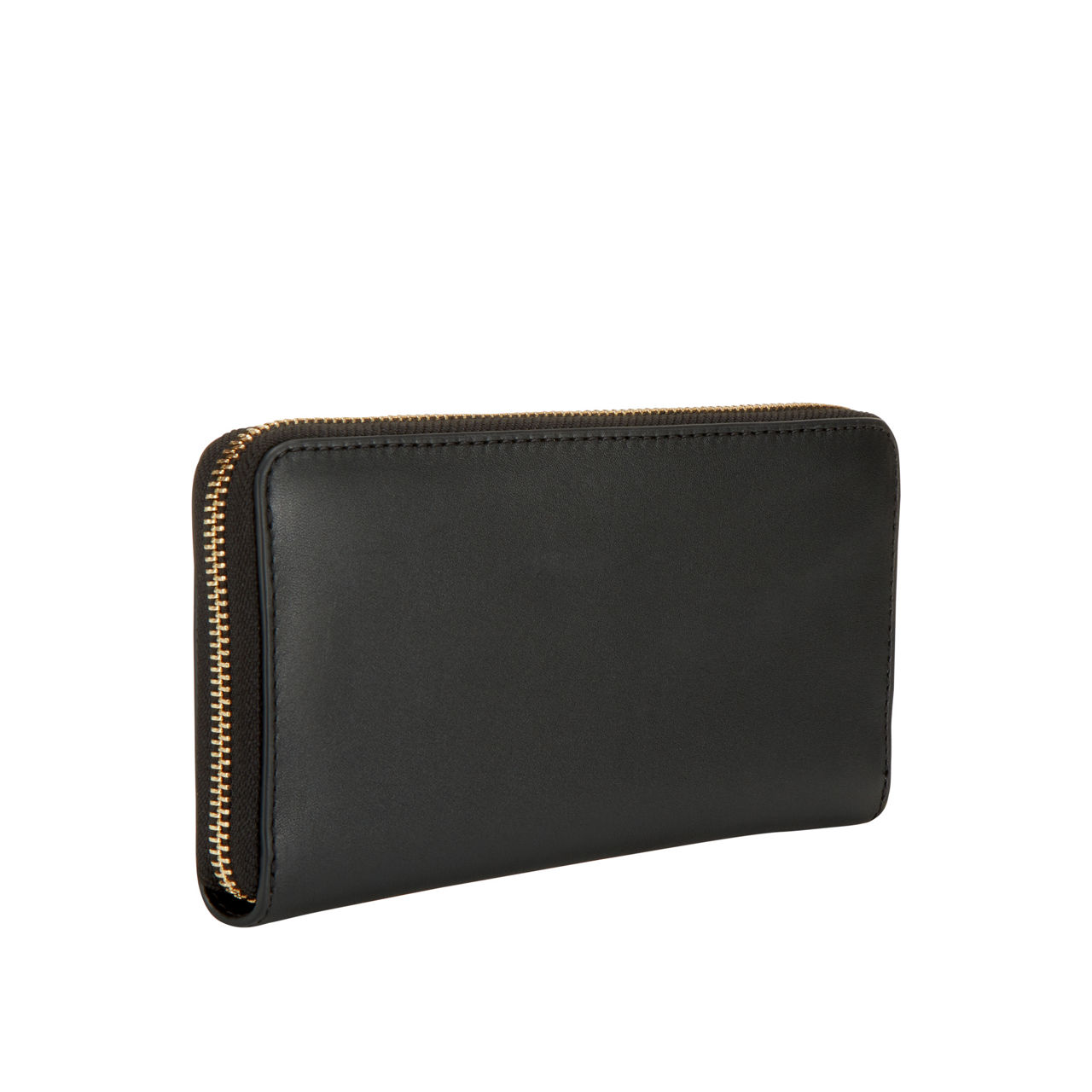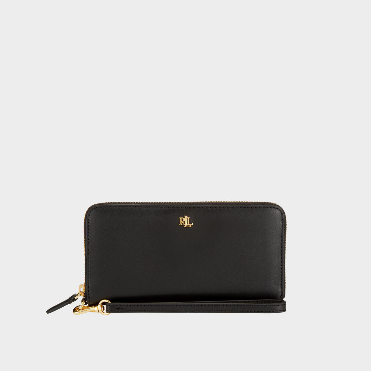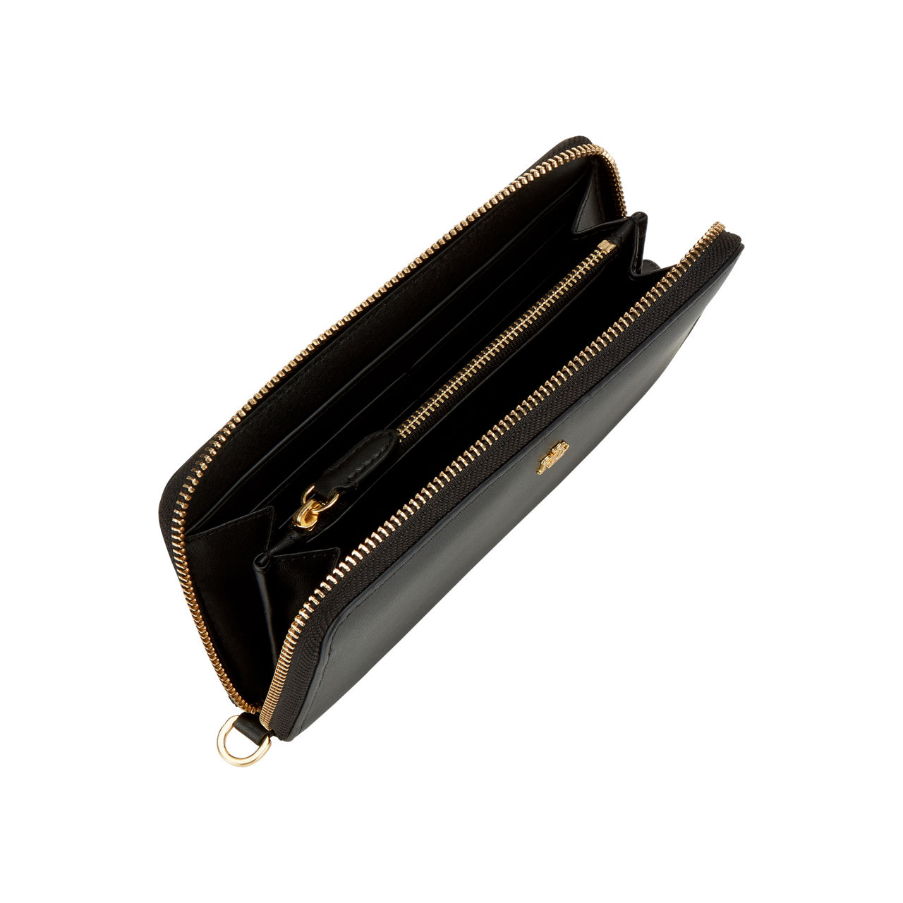 - Zip-around fastening, logo detail, gold-tone hardware, detachable wristlet, tonal stitching, smooth leather finish