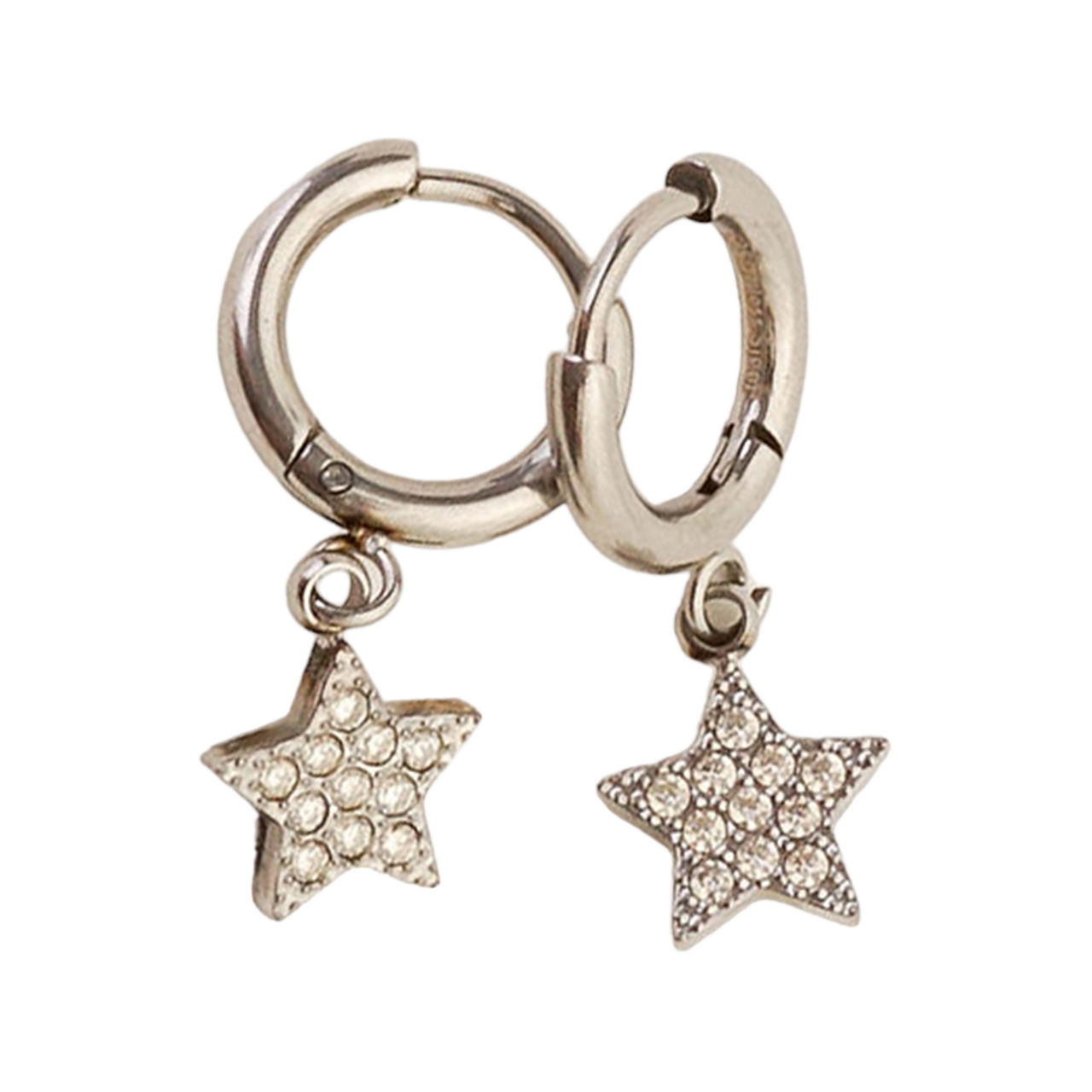 - Huggie style, embellished star charm, hinged clasp fastening, hypoallergenic, silver-plated, presented in a gift box
