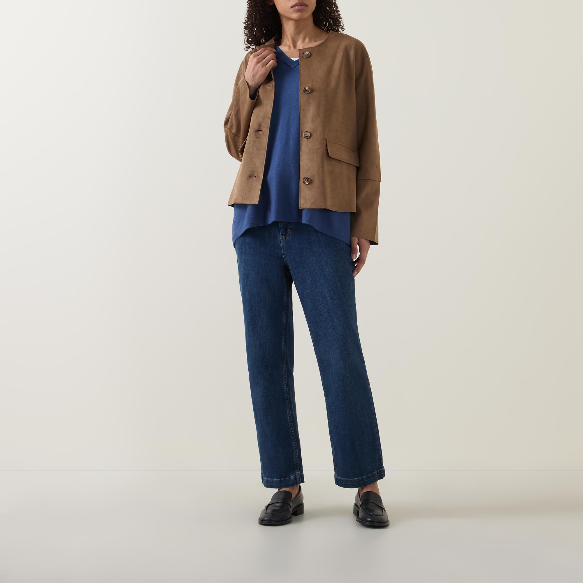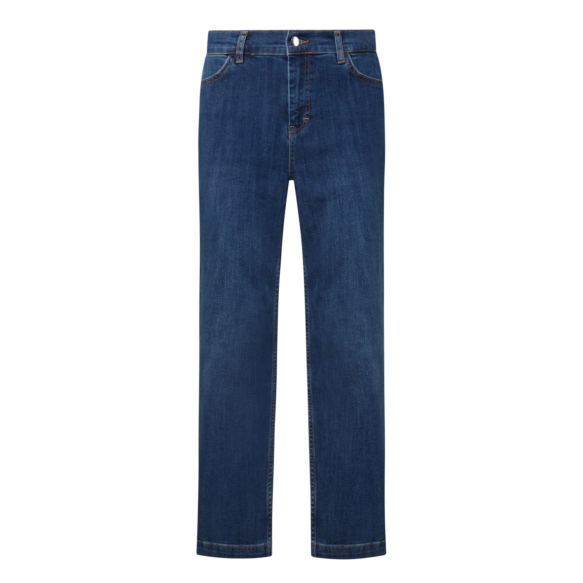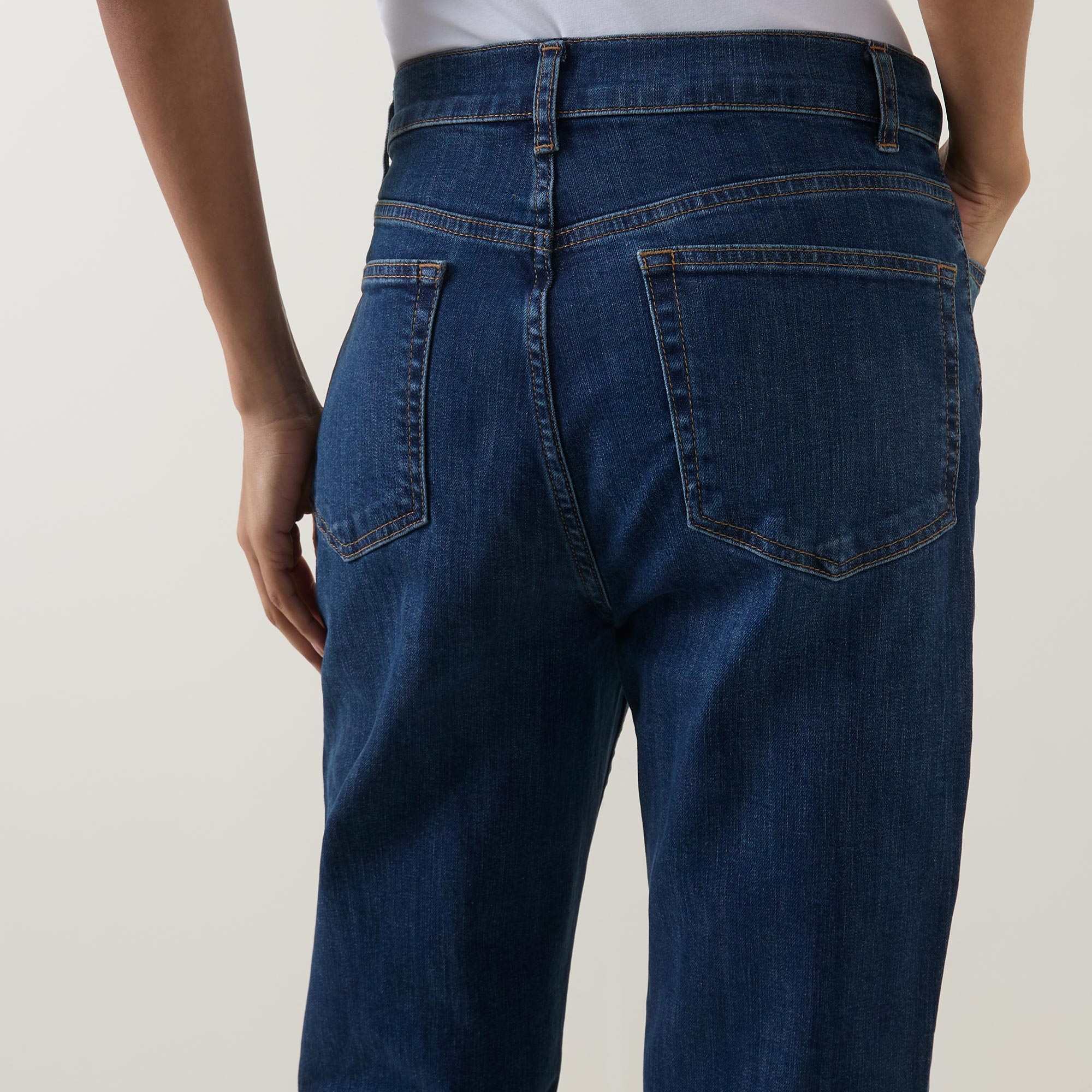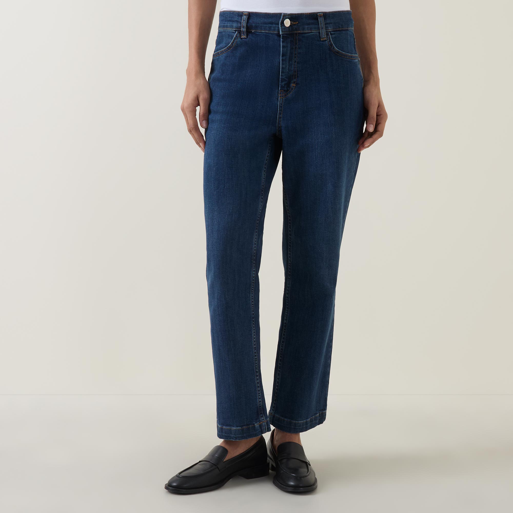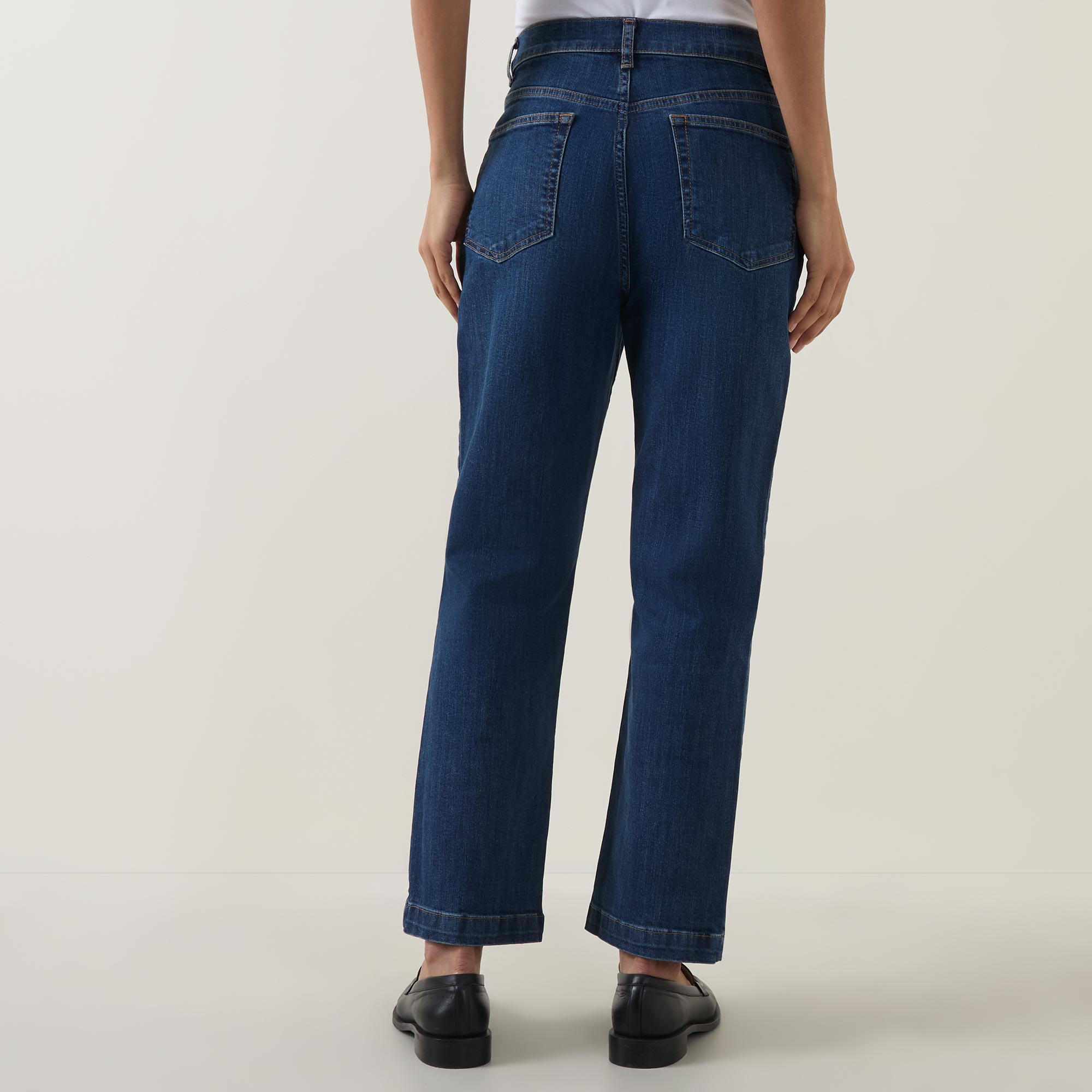 • Mid rise, straight leg, cropped length, bootcut silhouette, belt loops, concealed fly and button fastening, clean hems, tobacco stitching, mid wash