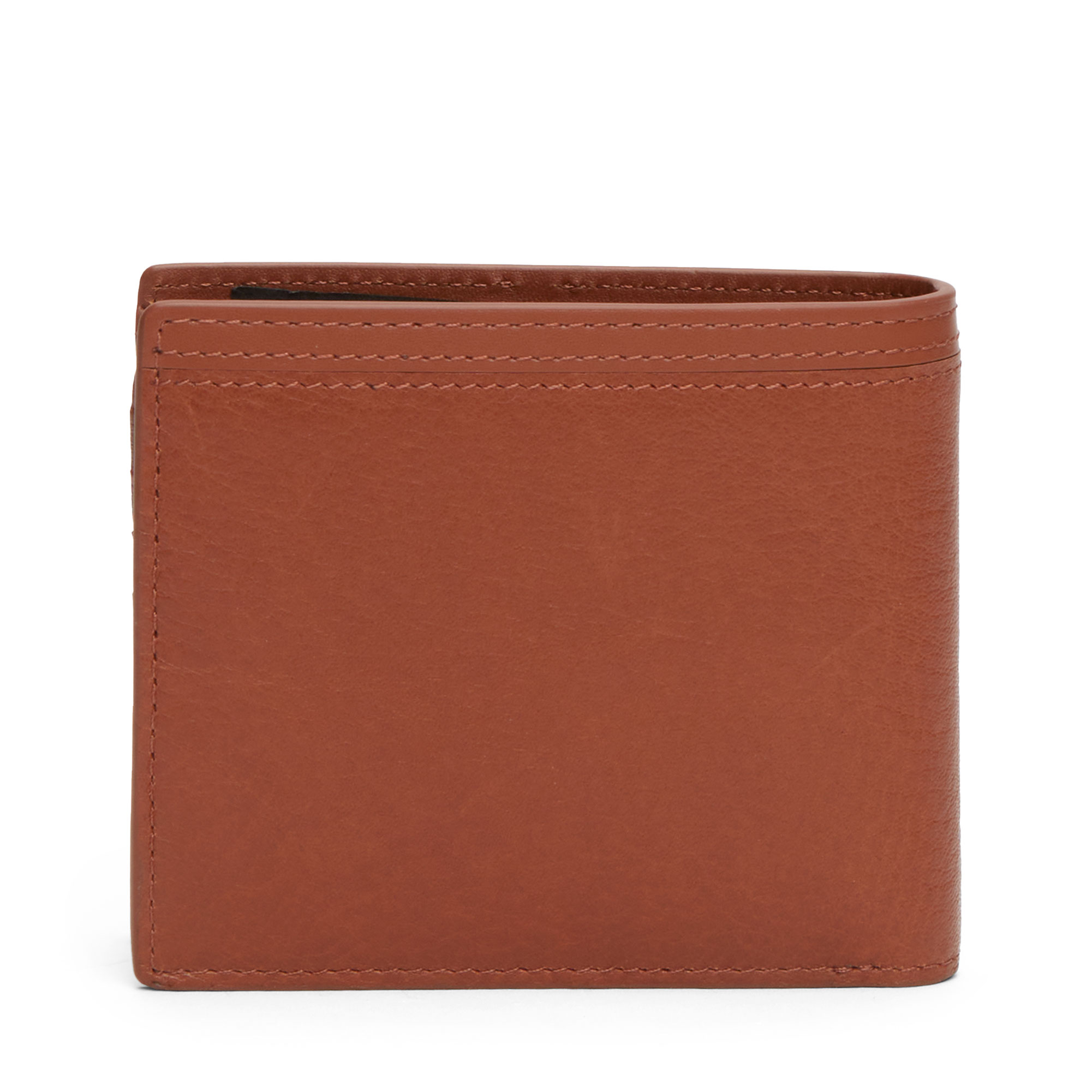 - Leather, pebble grain finish, bifold design, signature tape detail, debossed logo, metallic logo, branding details