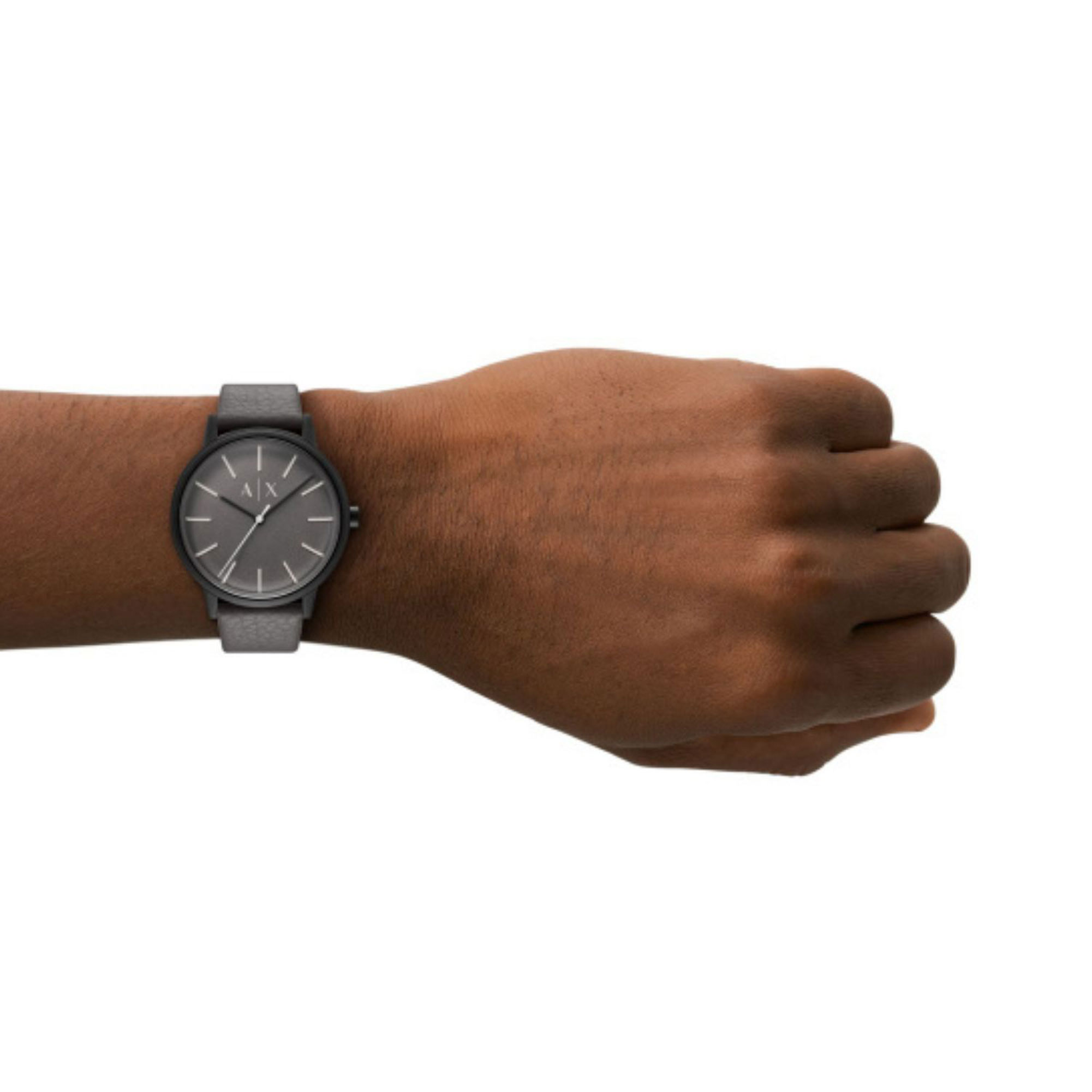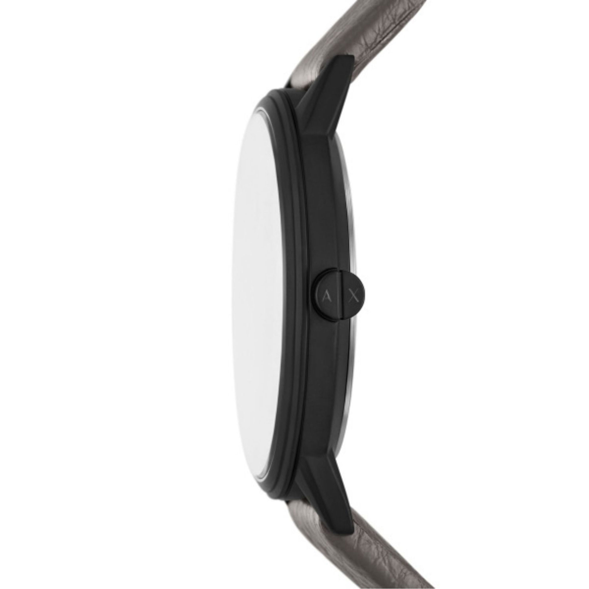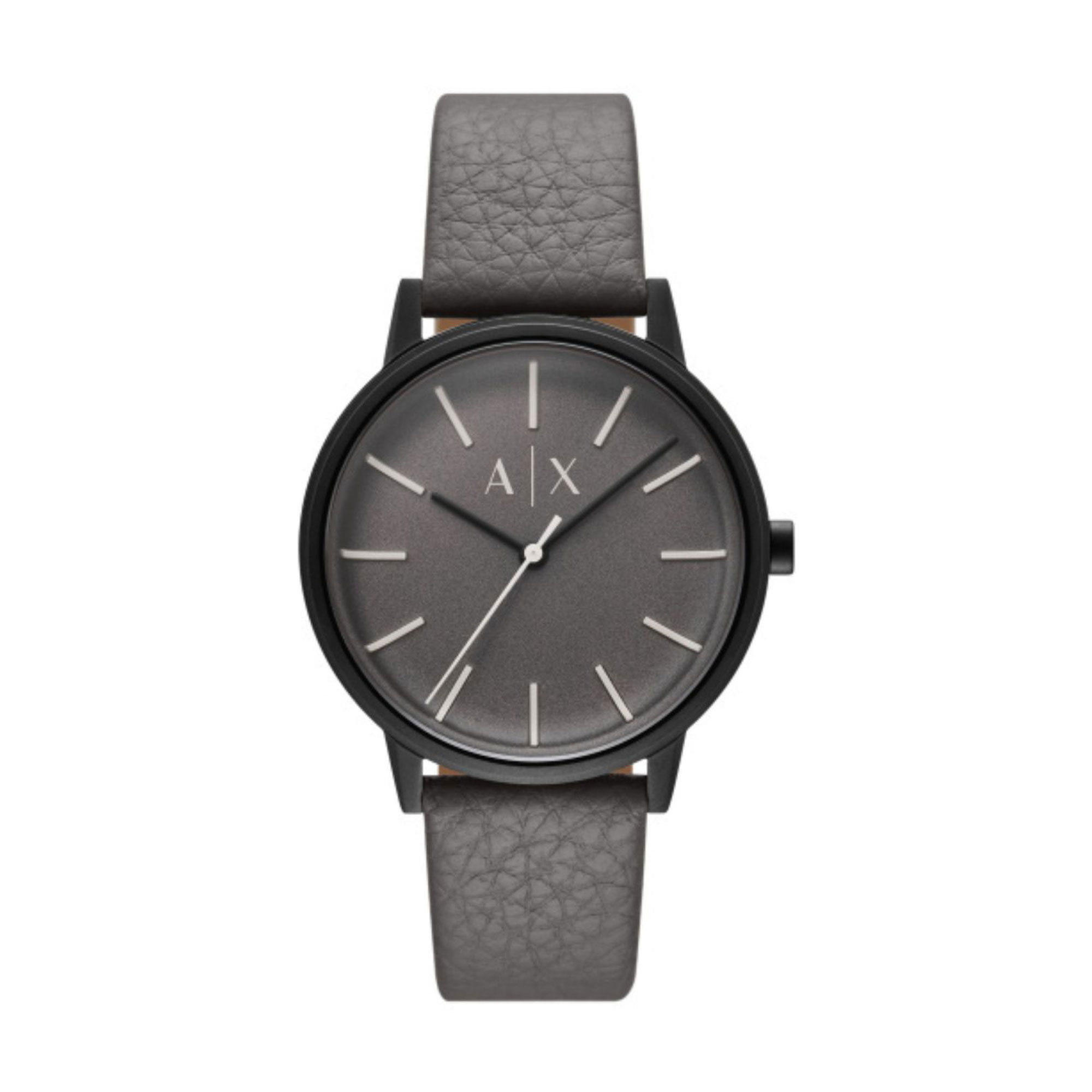 The Armani Exchange AX2764 is a men's watch featuring a matte black stainless steel case, grey sunray dial and soft grey leather strap. Powered by a quartz movement and water resistant to 50 m, this minimalist timepiece offers modern styling and all-day comfort.