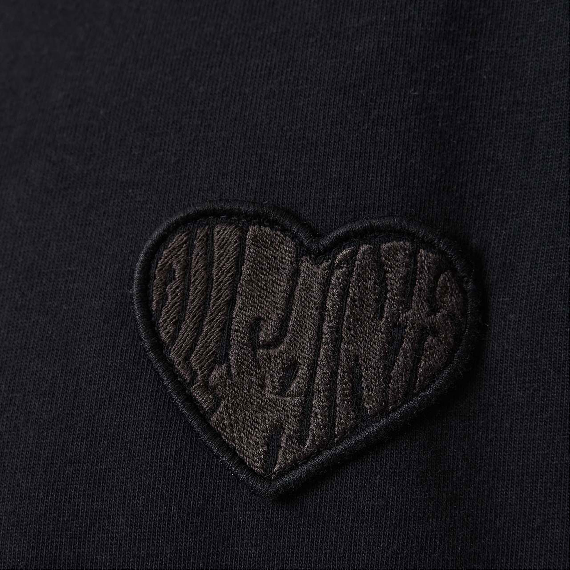 - Thicker rib neckband with twin needle stitch, twin needle stitch to hem and cuffs, logo detail heart patch in tonal colourway on left front chest