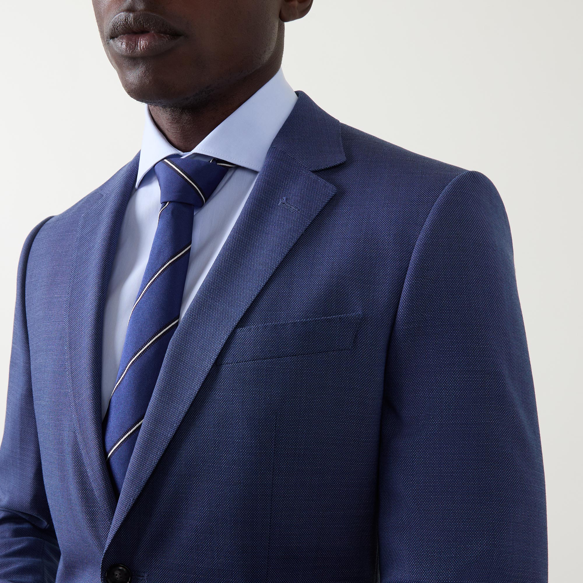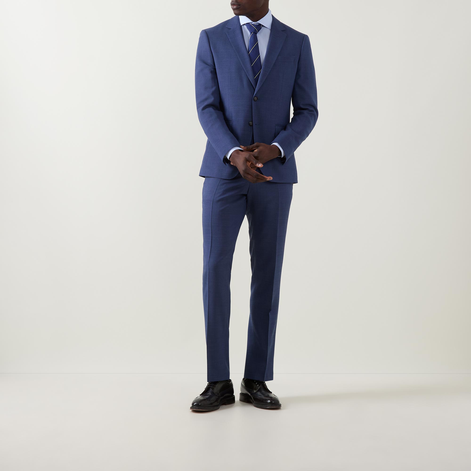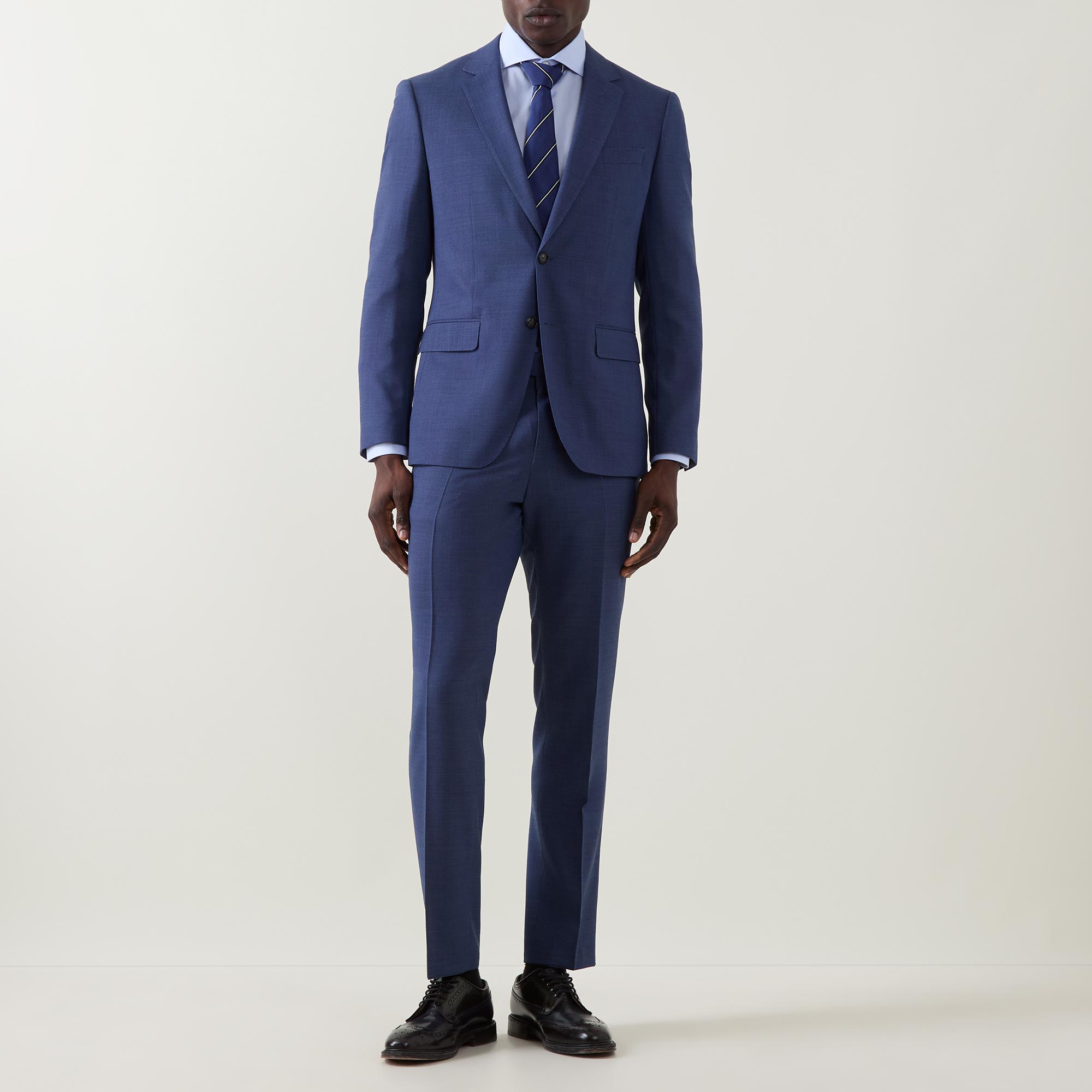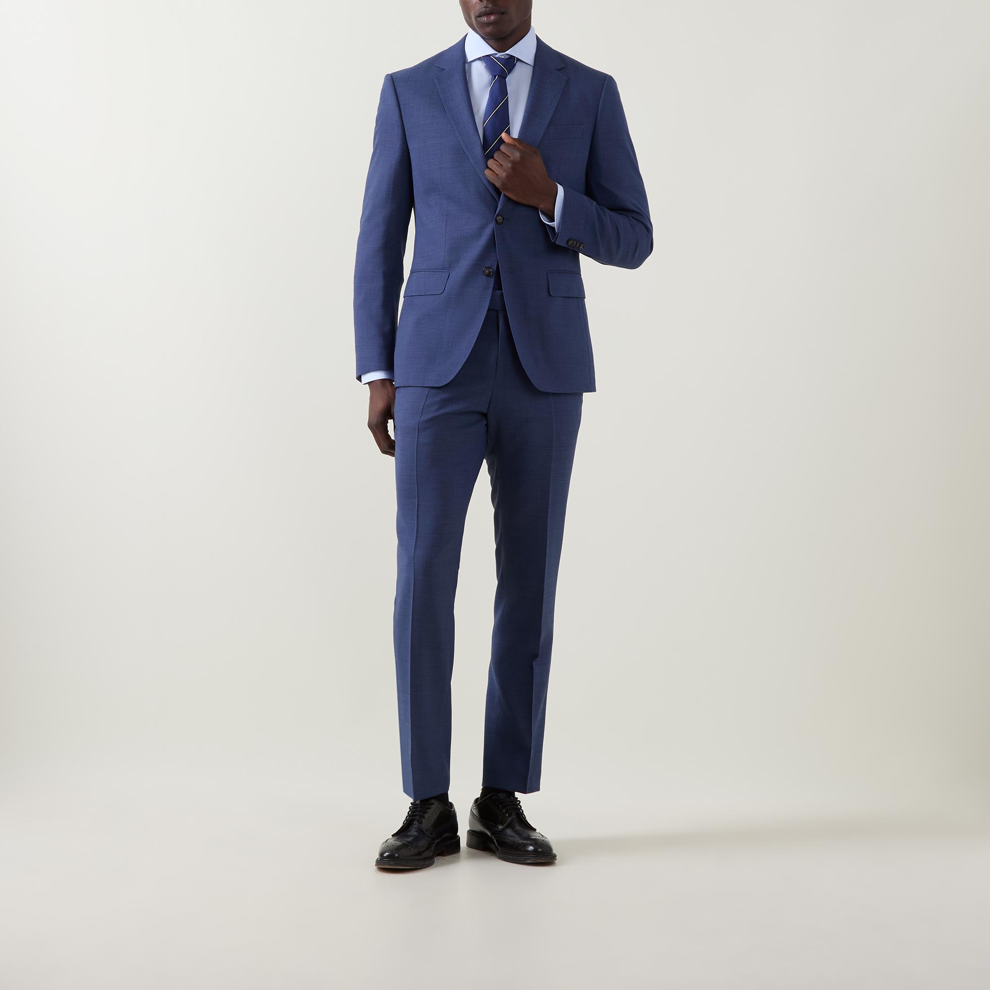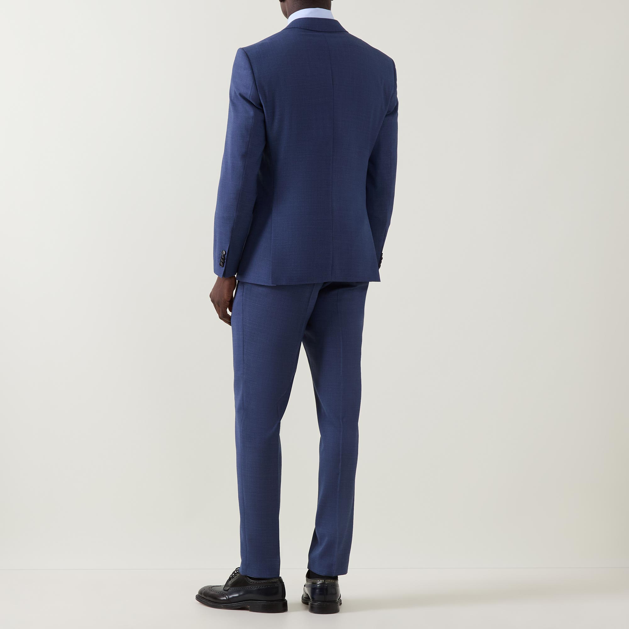 • Jacket: Single-breasted front, long sleeves, notched lapel collar, button fastening, chest welt pocket, two side flap pockets, buttoned cuffs. Trousers: Concealed zip-fly and hook-and-bar fastening, belt loops, mid-rise, slim-cut leg, pressed creases, smooth fabric