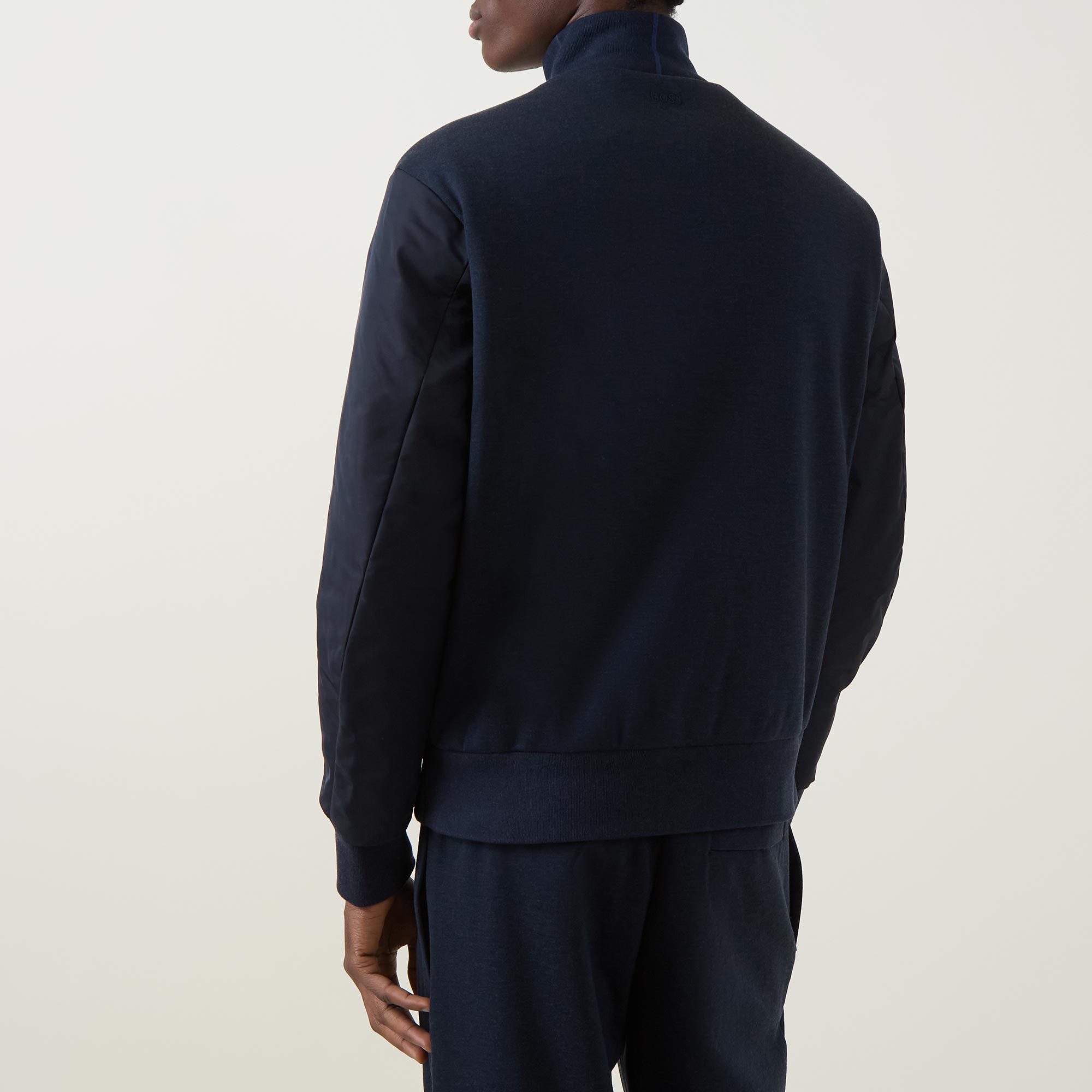 - Stand collar, long sleeves, two-way front zip fastening, two side entry pockets with zip fastenings, straight hem, ribbed trims, distinctive logo detail on the chest