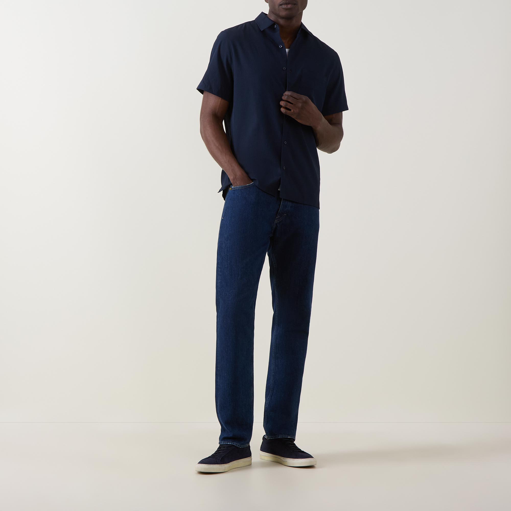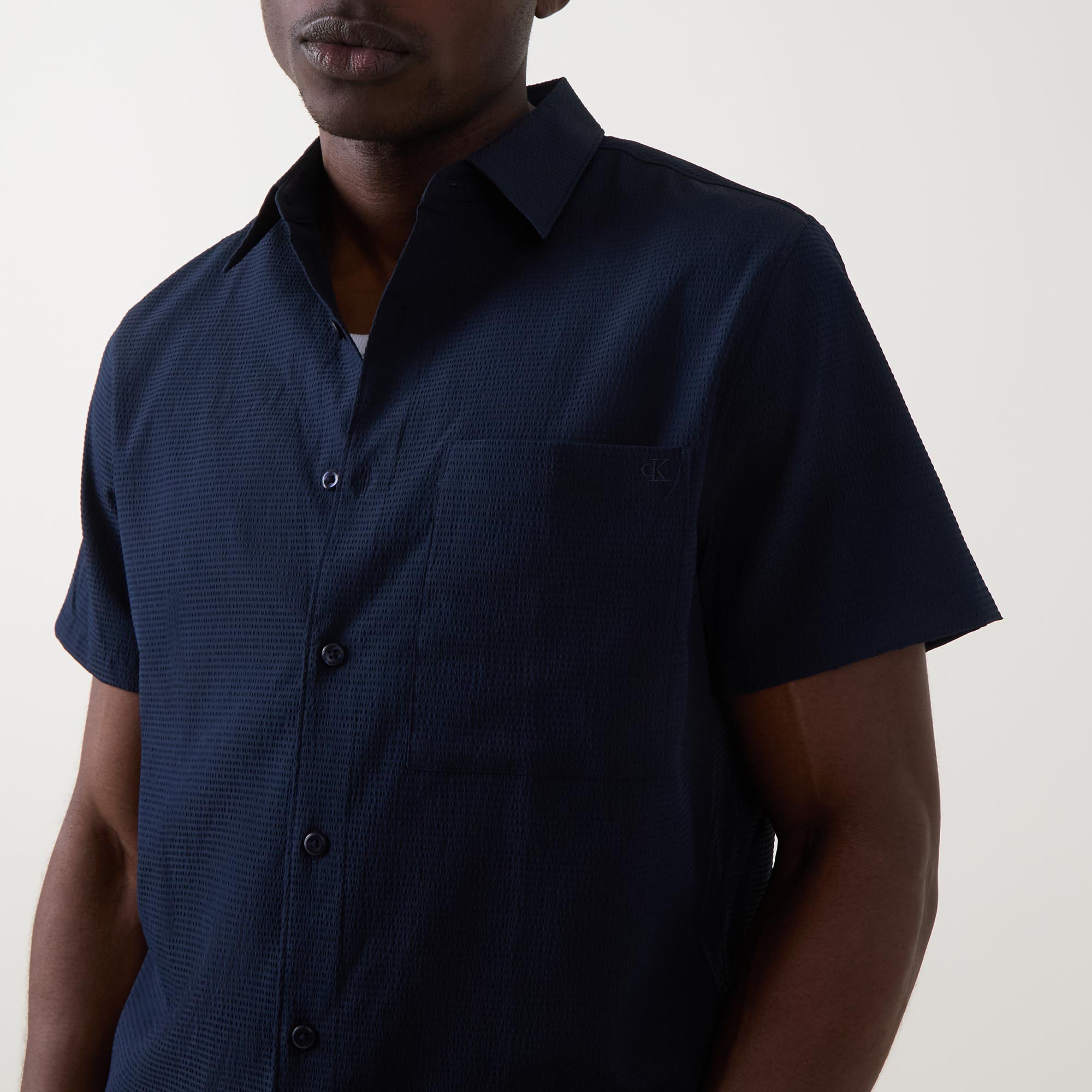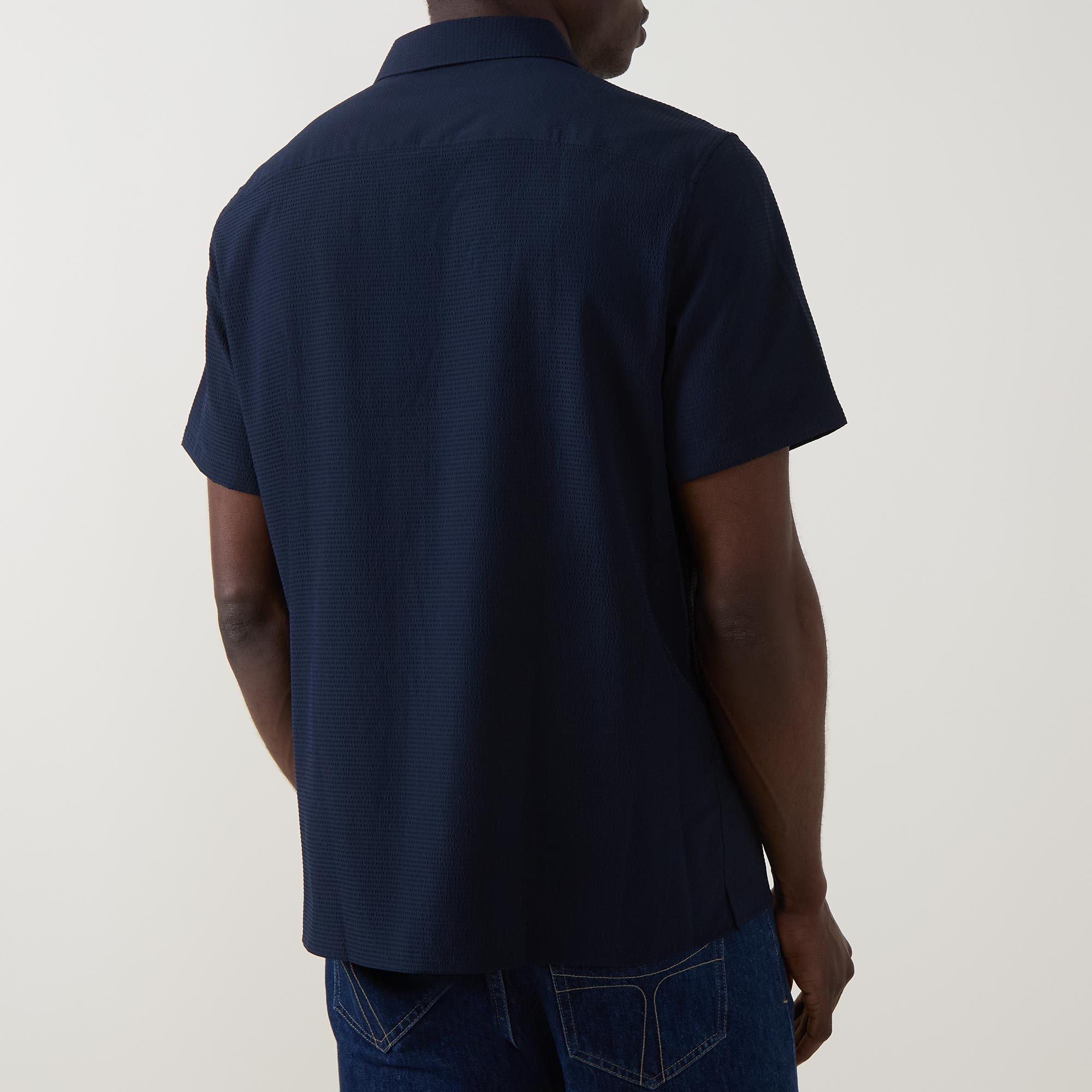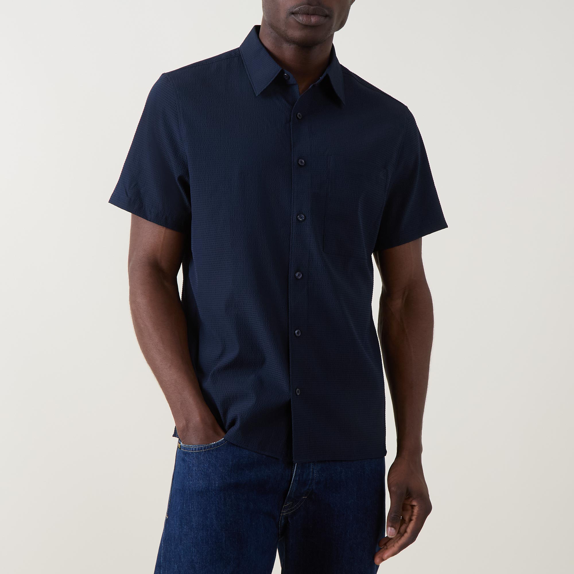 - Short sleeves, seersucker texture, spread collar, button fastenings, vented hem, regular fit