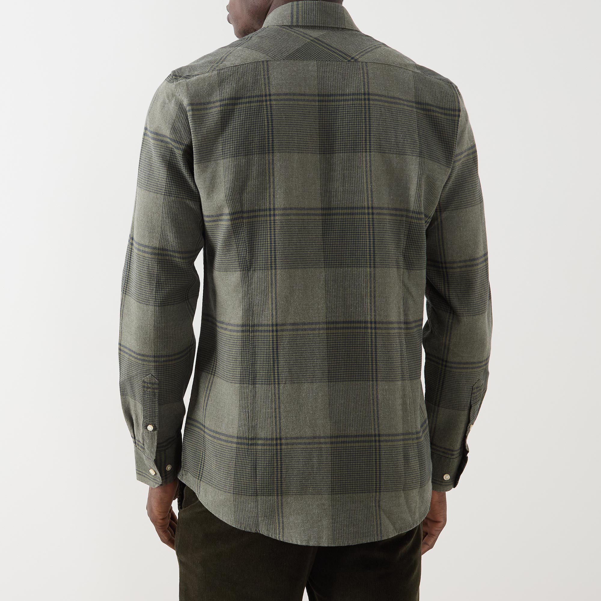 - Check pattern, long sleeves, chest pocket, button fastenings, logo tag, curved hemline