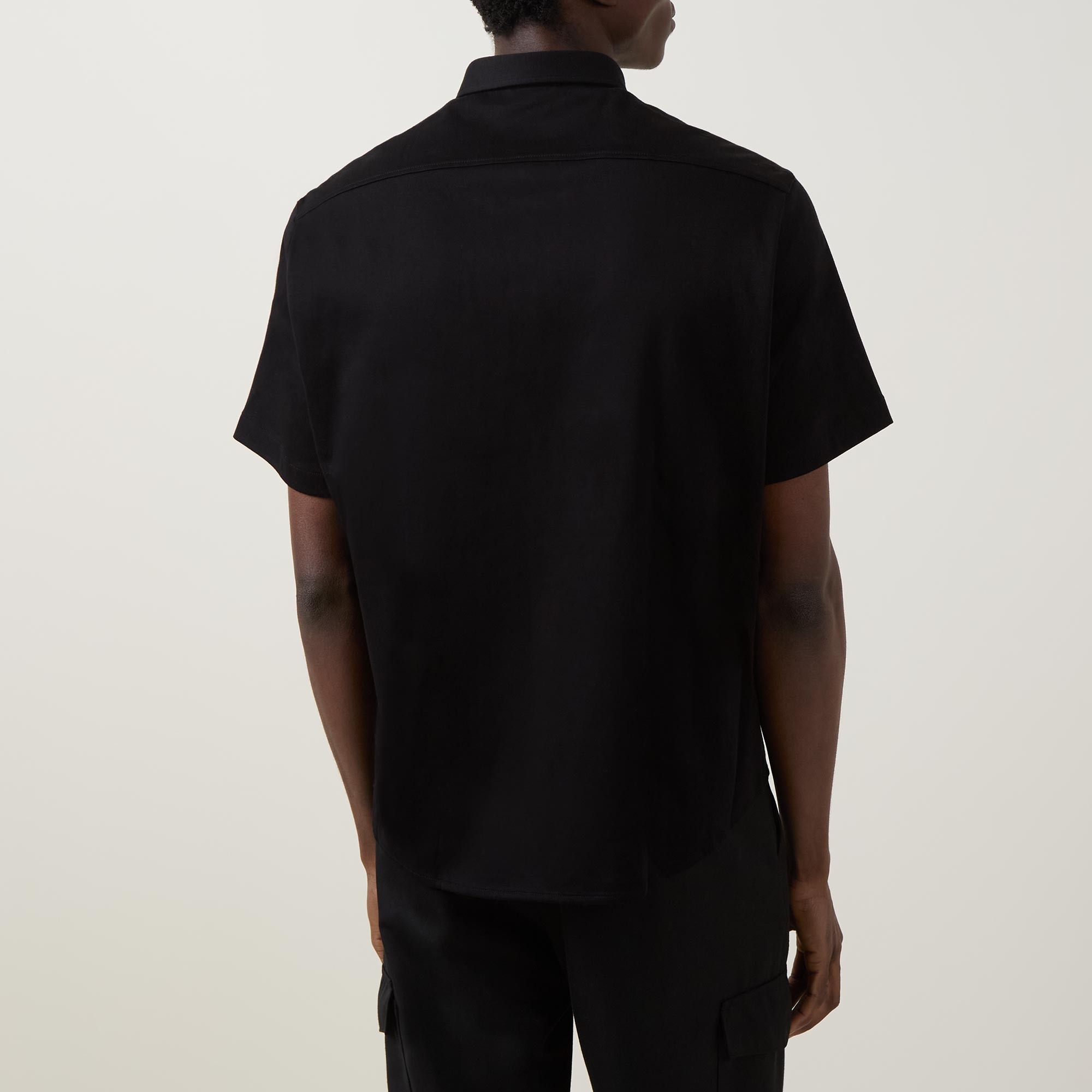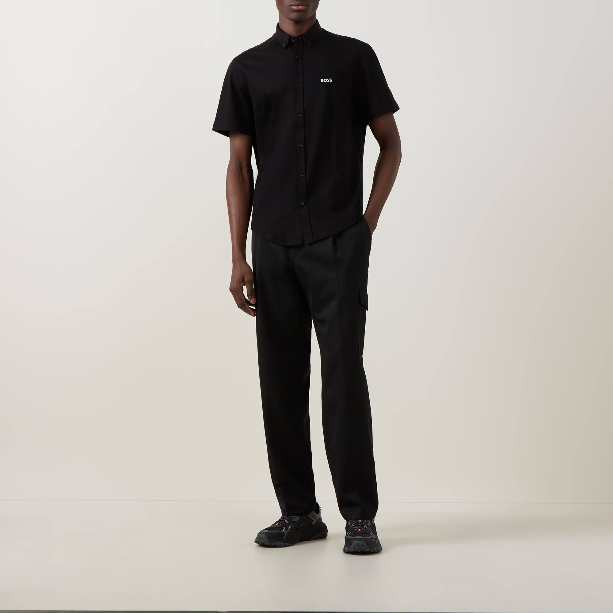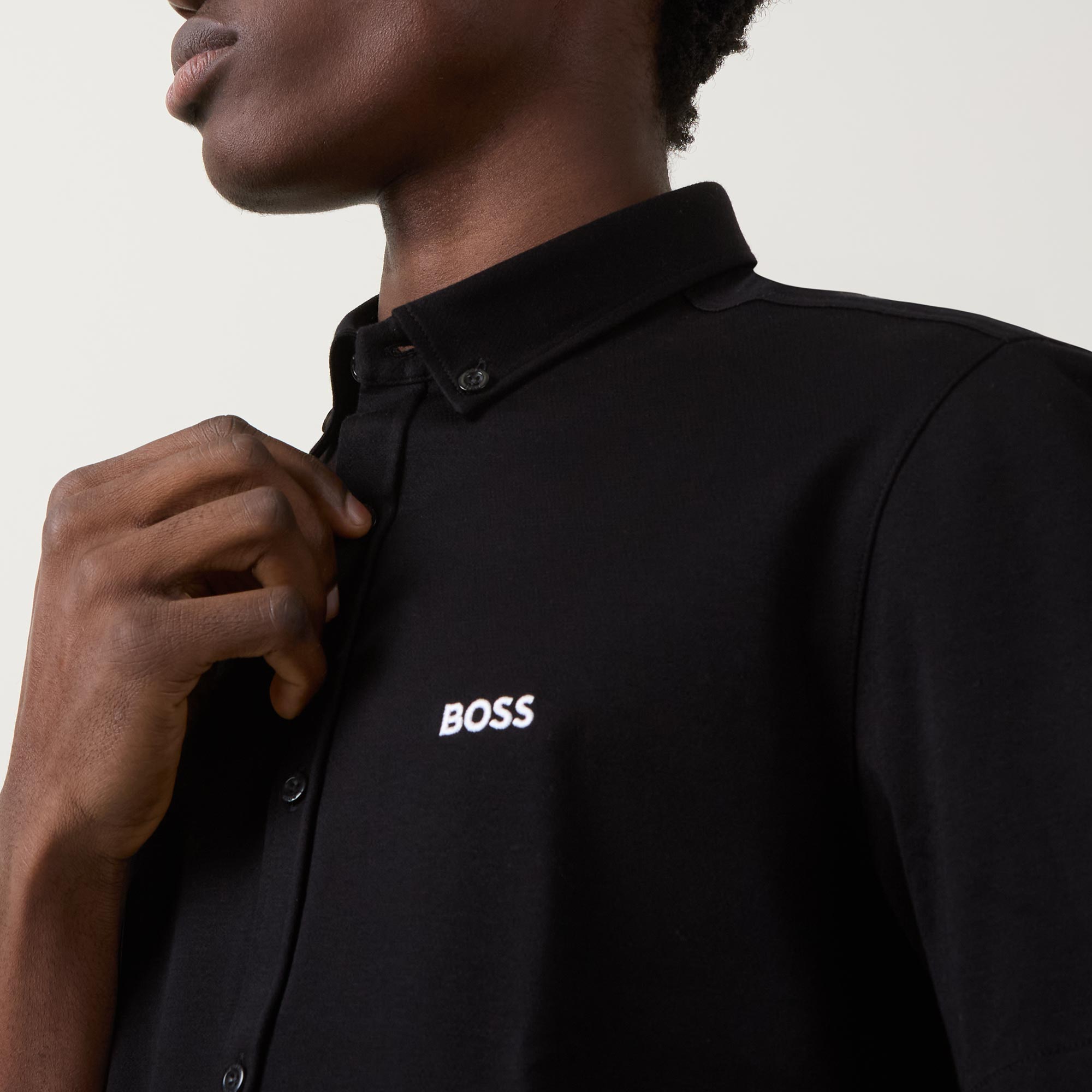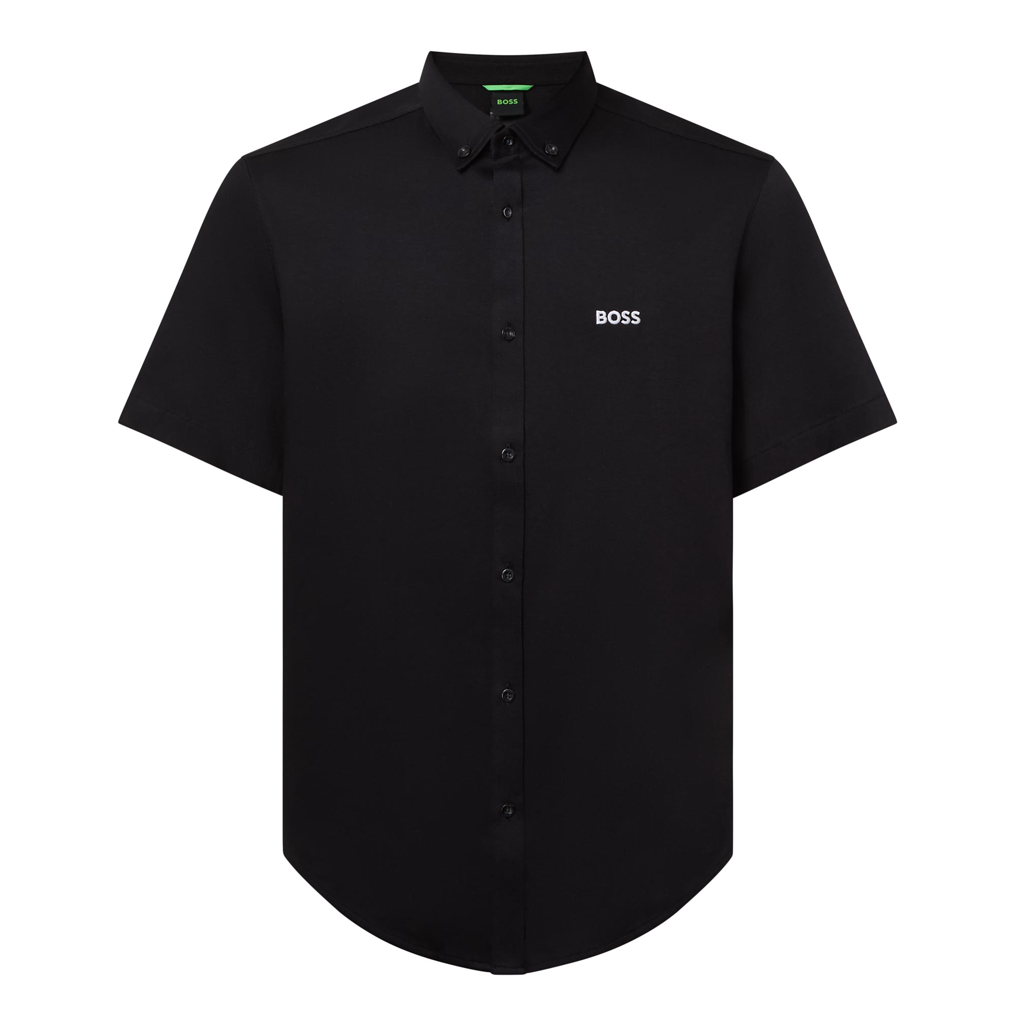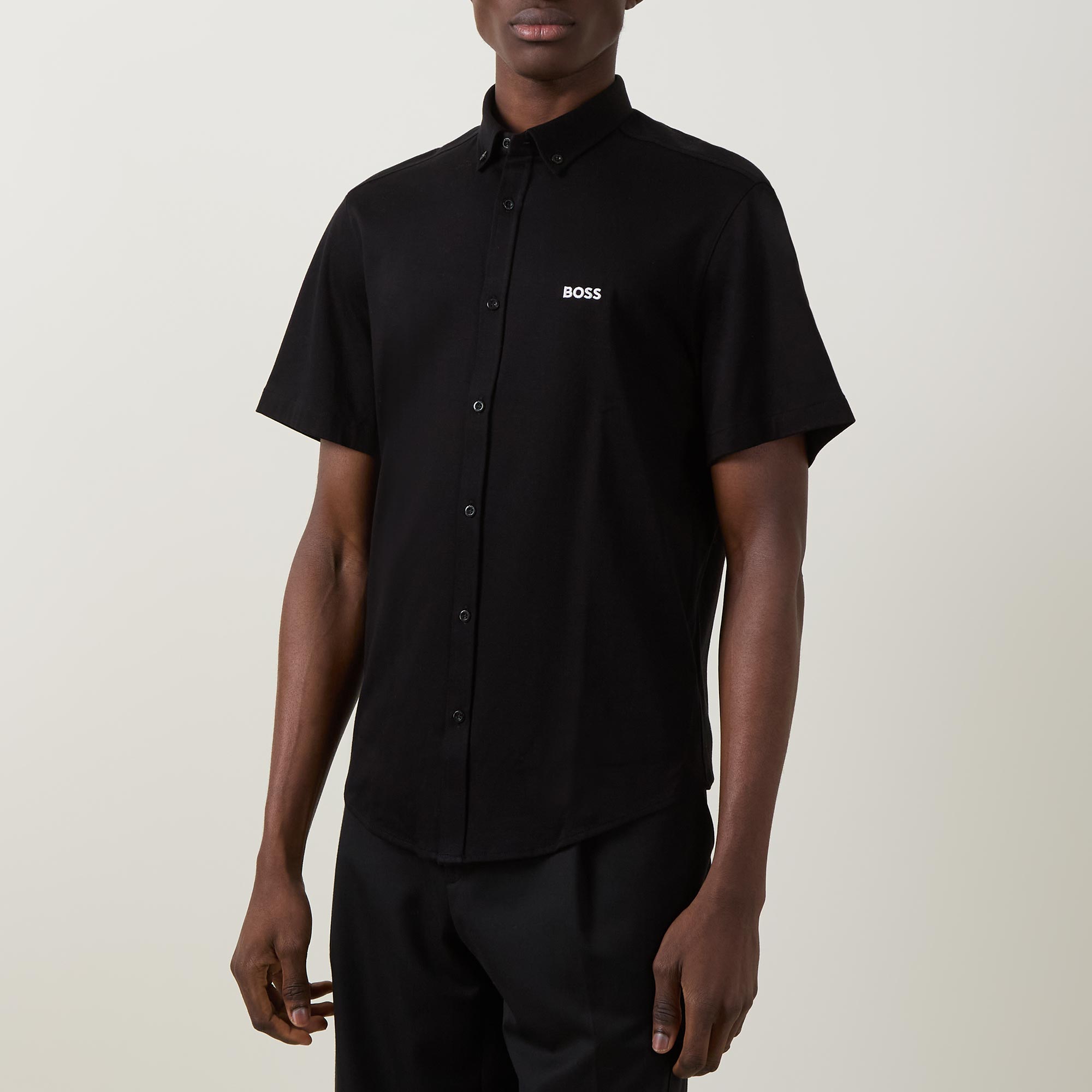- Button-down collar, short sleeves, curved hemline, logo detail