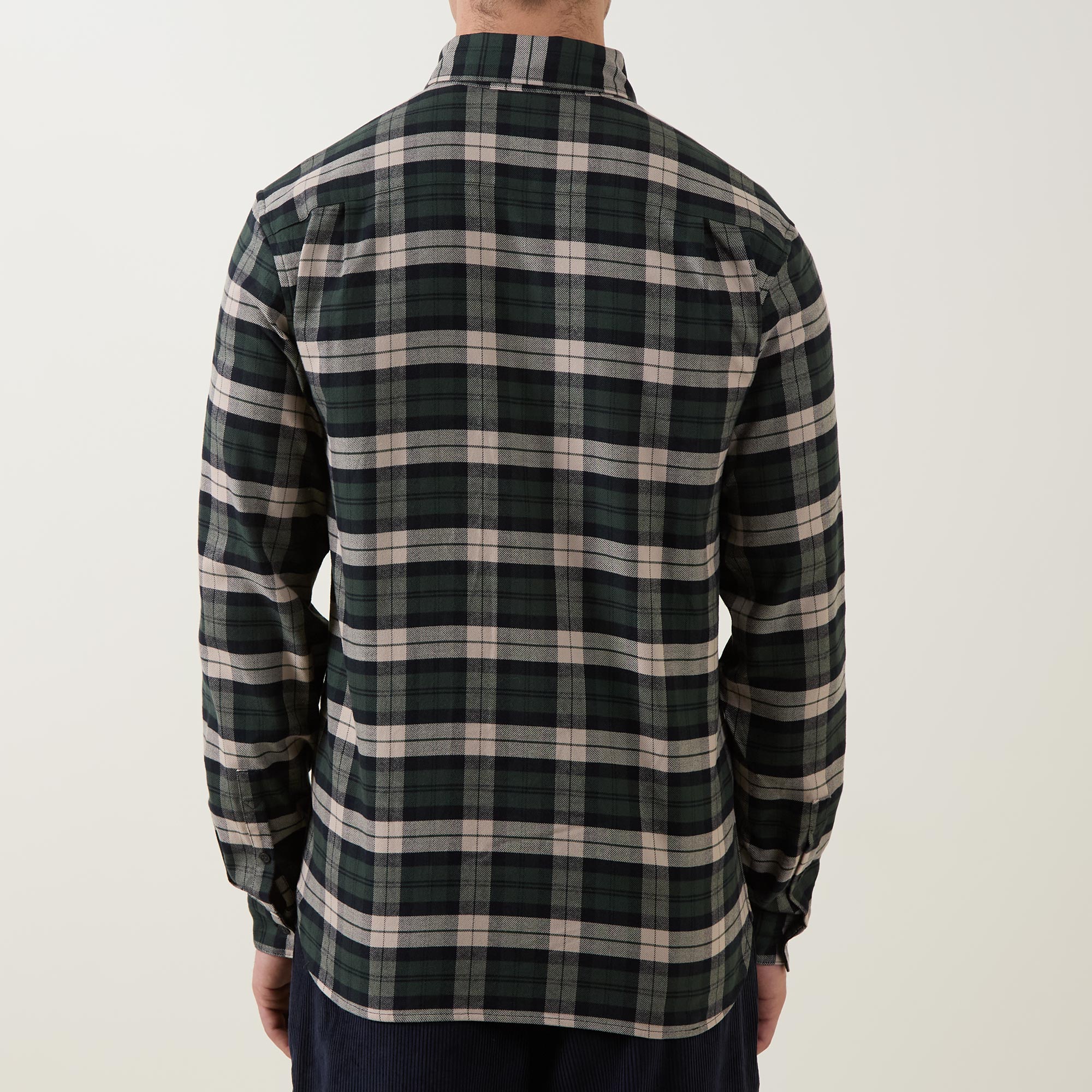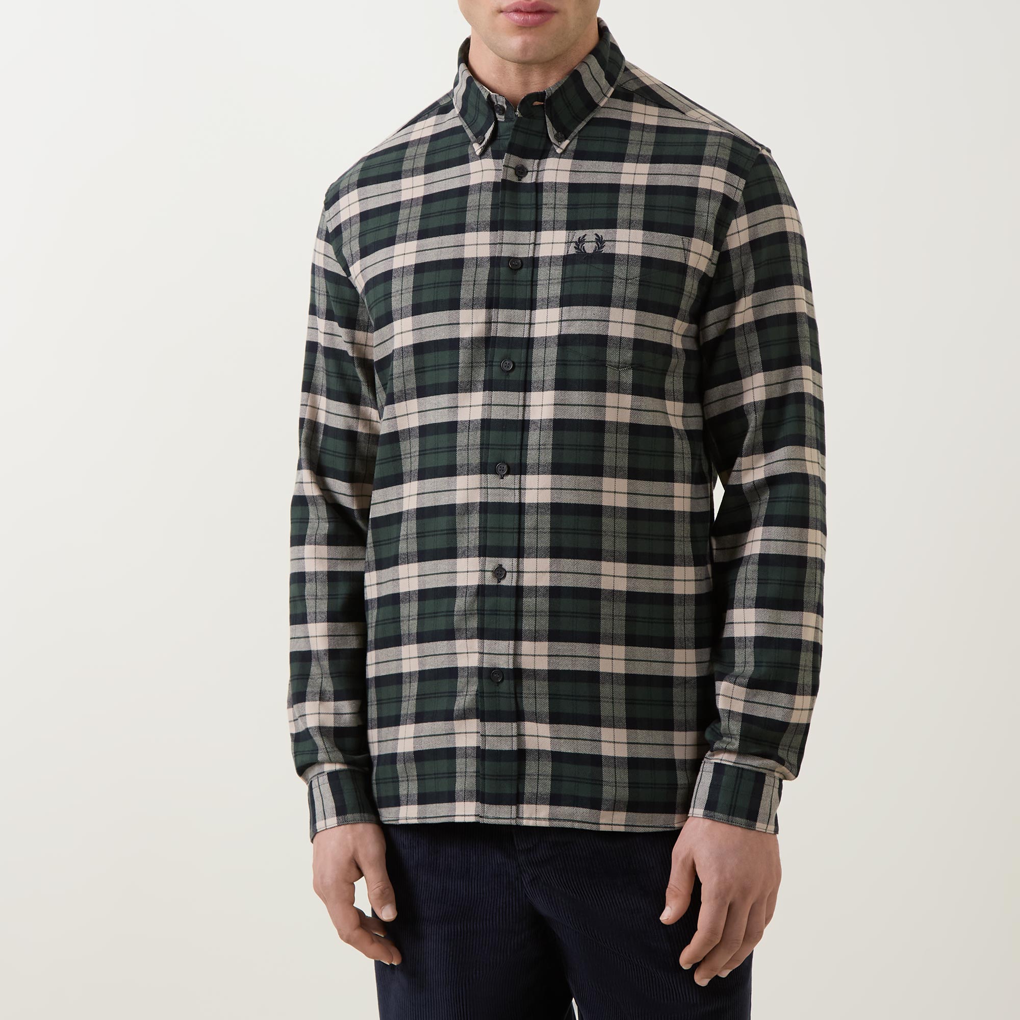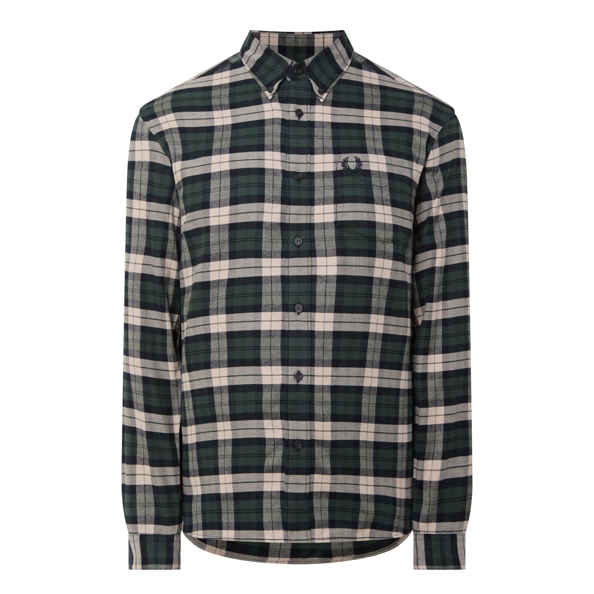 - Button down point collar, long sleeves, buttoned cuffs, front button fastening, one chest patch pocket, curved hem, Laurel Wreath logo embroidery, check print, brushed finish