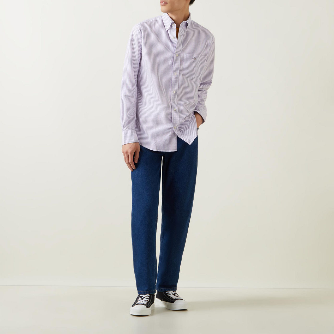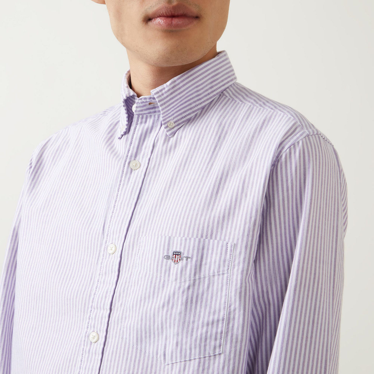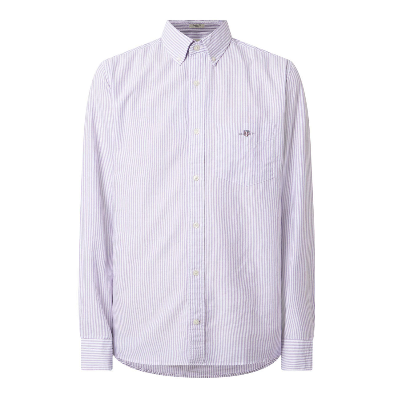 - Button-down collar, long sleeves, button fastening, chest pocket, logo embroidery, striped pattern, single-button cuffs, curved hemline, smooth fabric