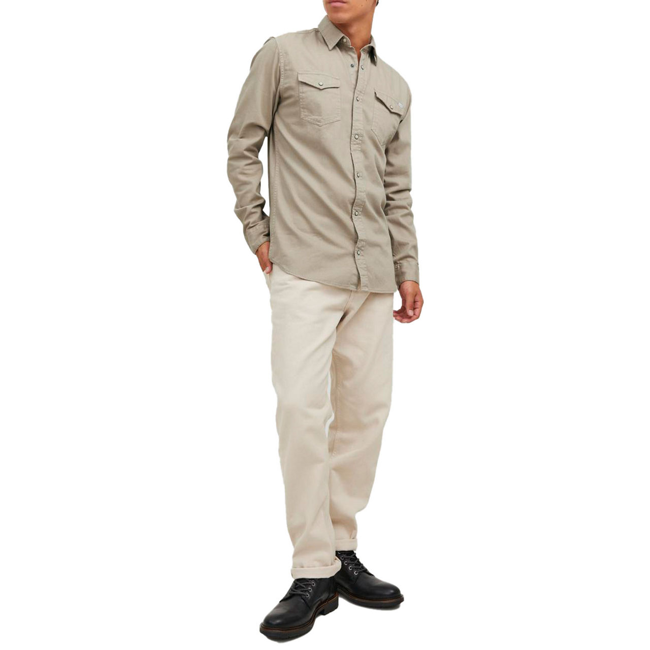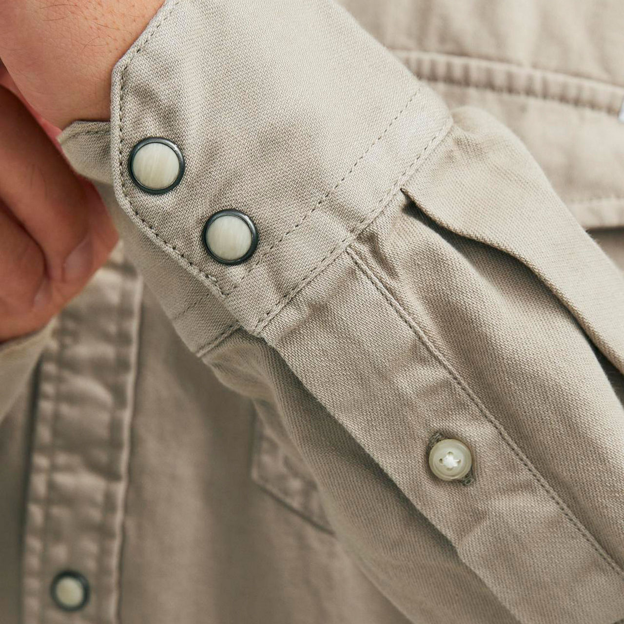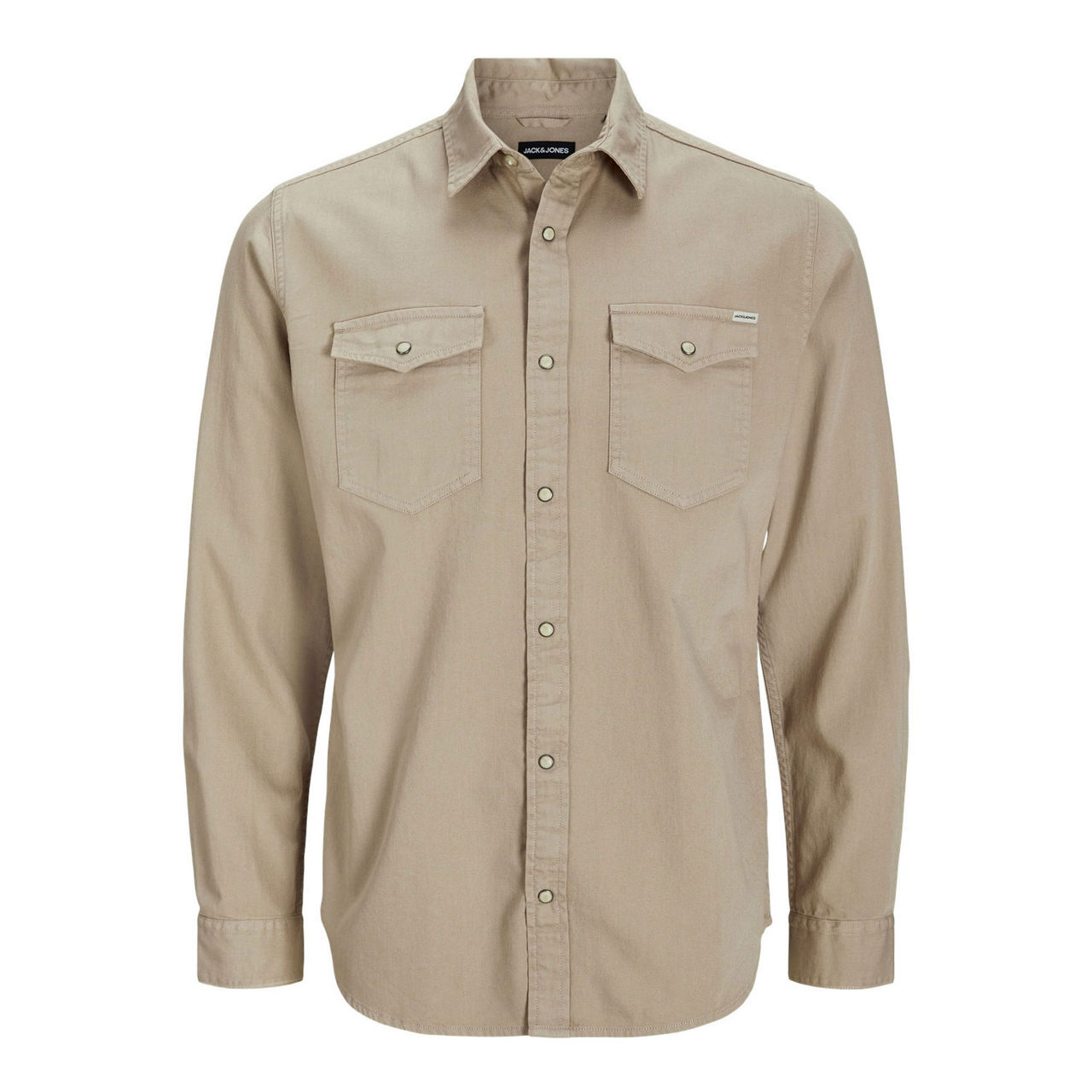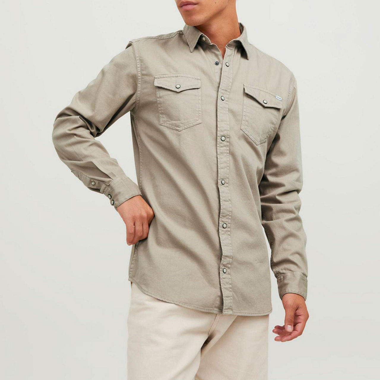 - Long sleeves, pointed collar, snap-button placket, tonal stitching, two chest flap pockets, attached logo tag, double-button cuffs, curved hemline, smooth denim finish