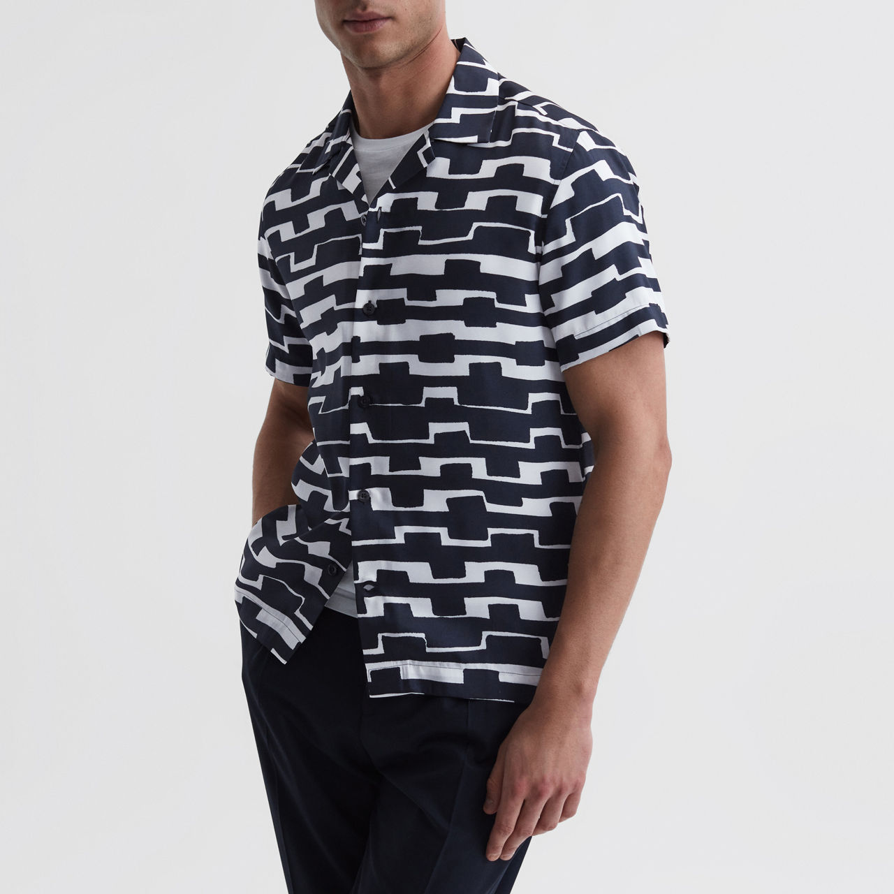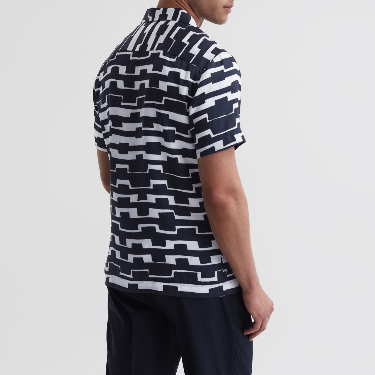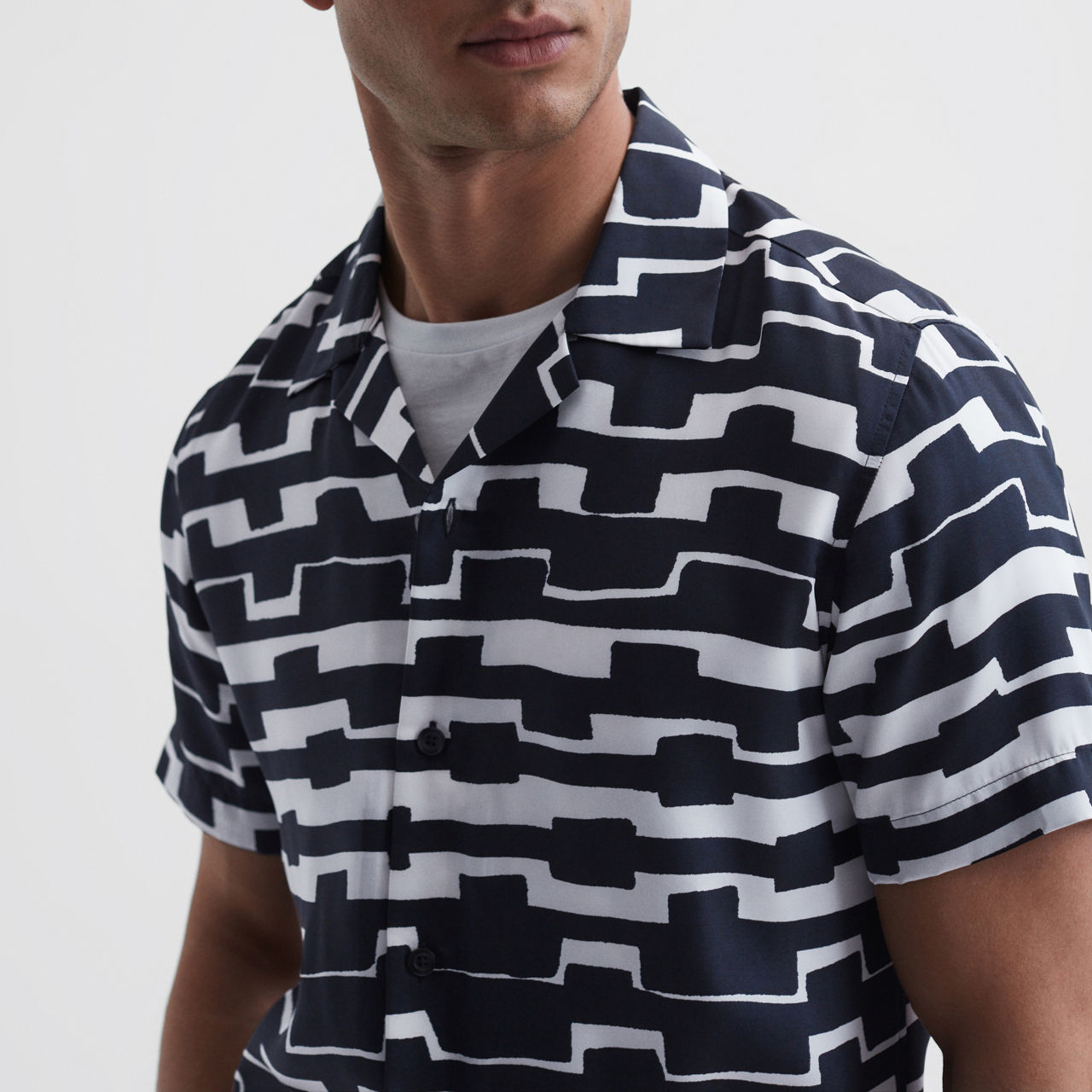 - Abstract print, short sleeves, Cuban collar, button fastening
