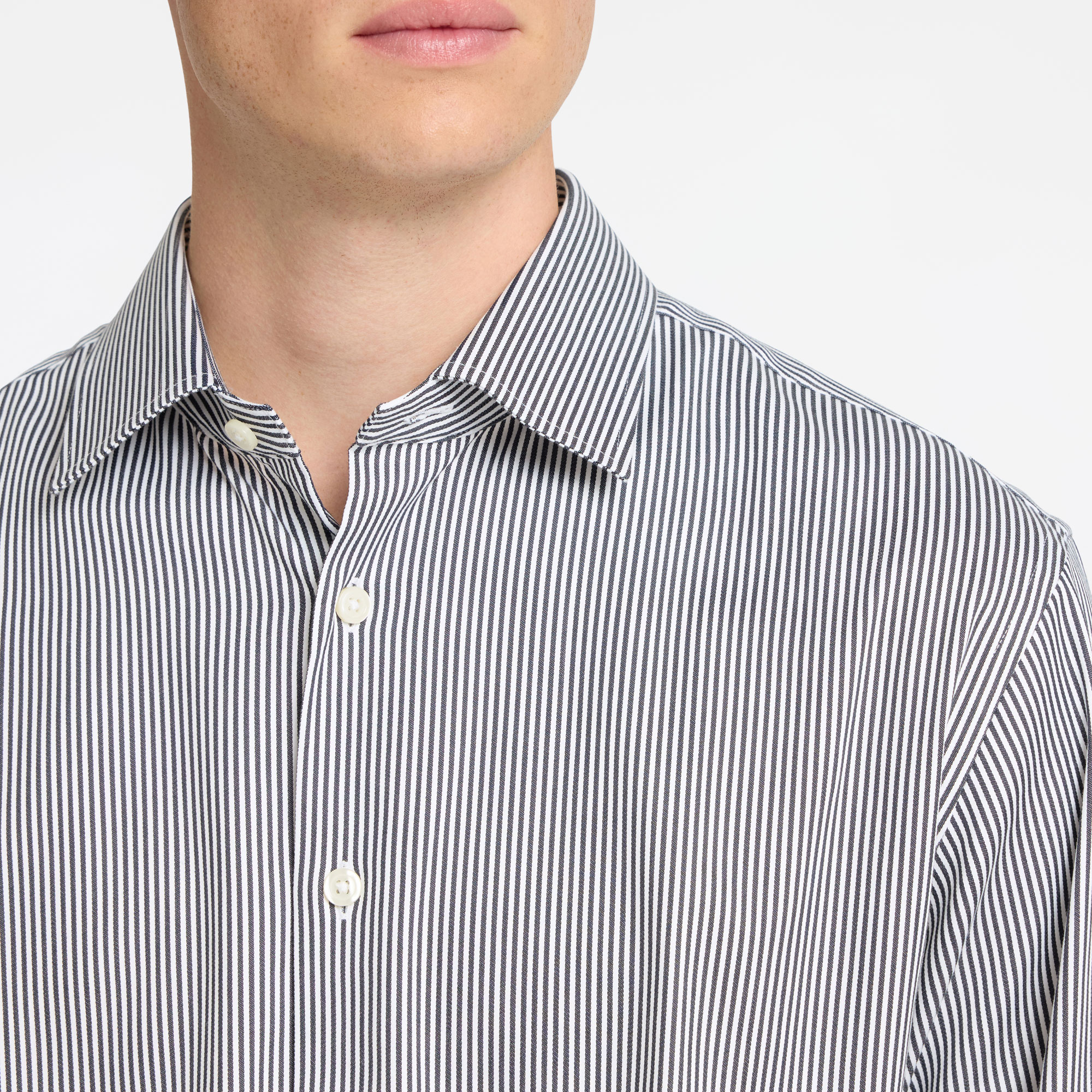 - Pointed collar, button fastening, curved hemline, long sleeves, buttoned cuffs