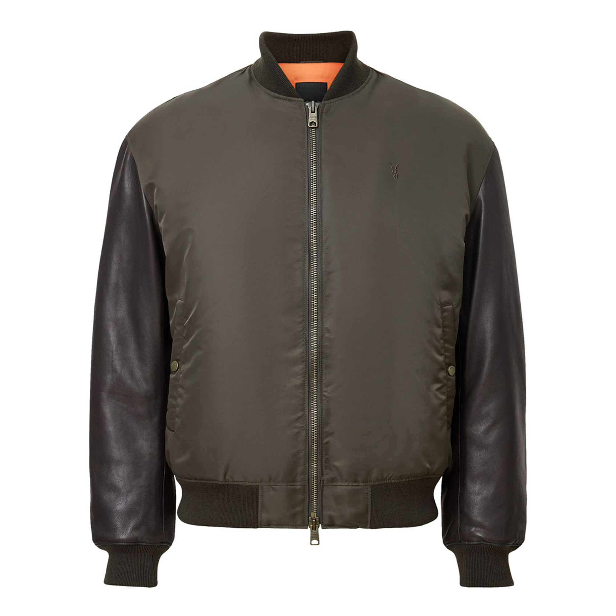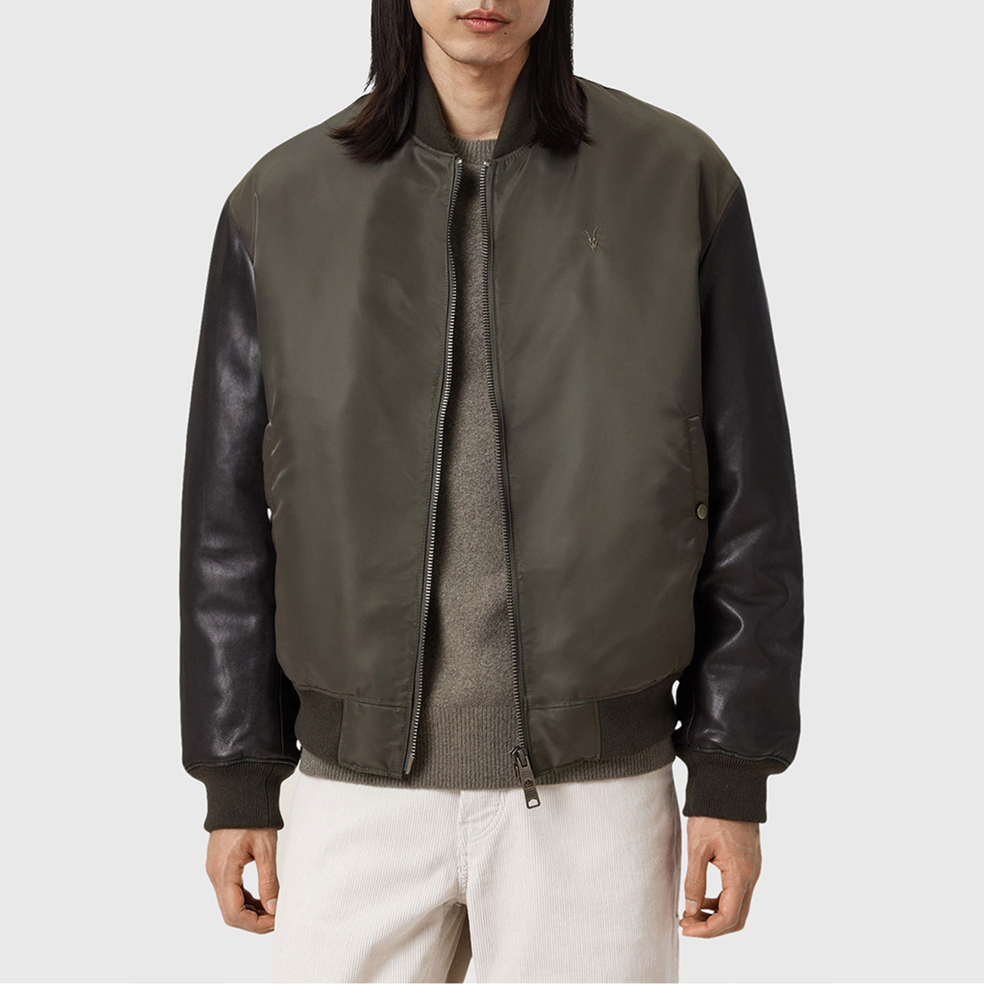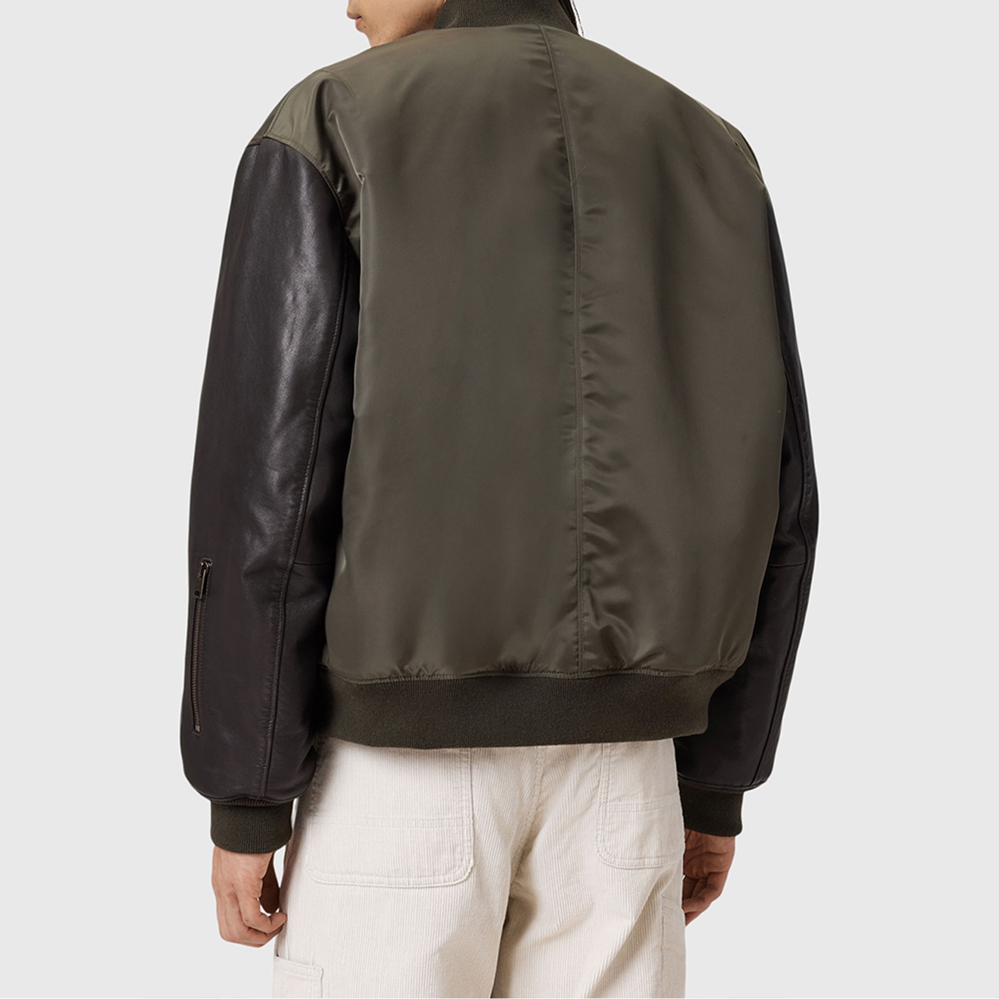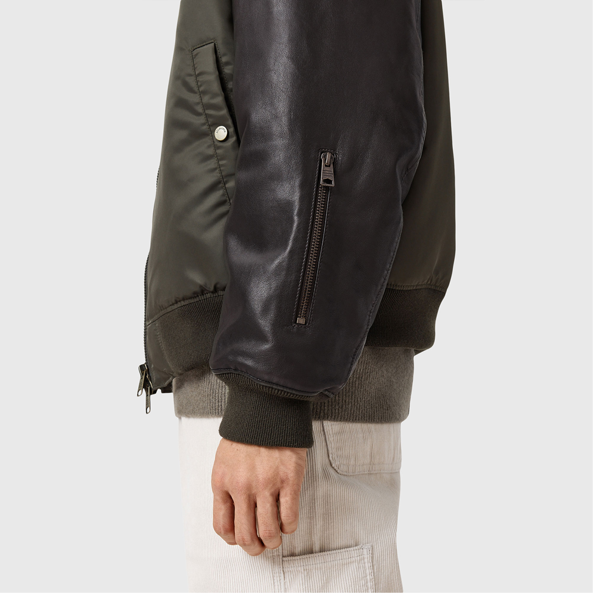 • Military-inspired style, twill nylon body, leather sleeves, silver-tone hardware, mid to lightweight feel, Ramskull branded logo embroidery detail, ribbed trims, metal flat snap fastenings, front zip fastening, pocket zip on sleeve, vertical internal pockets with snap closure