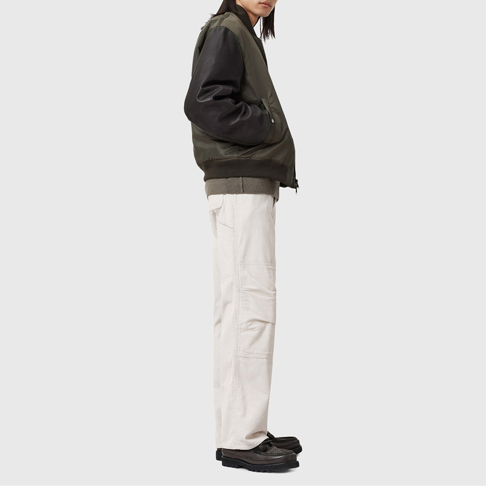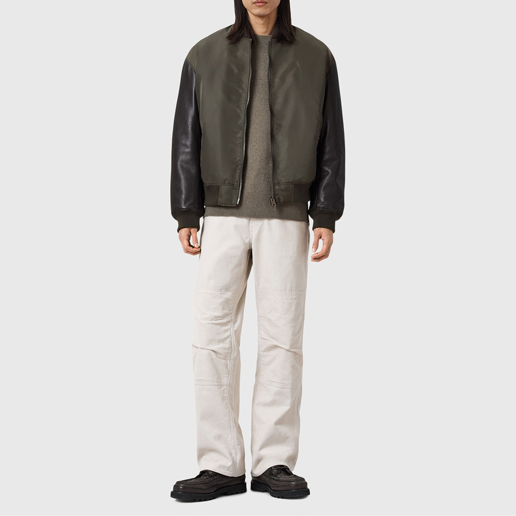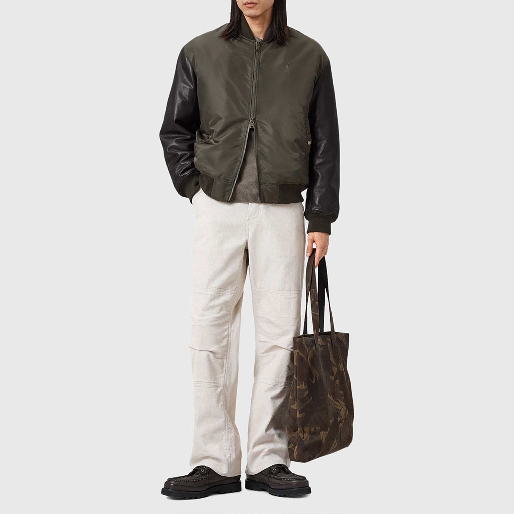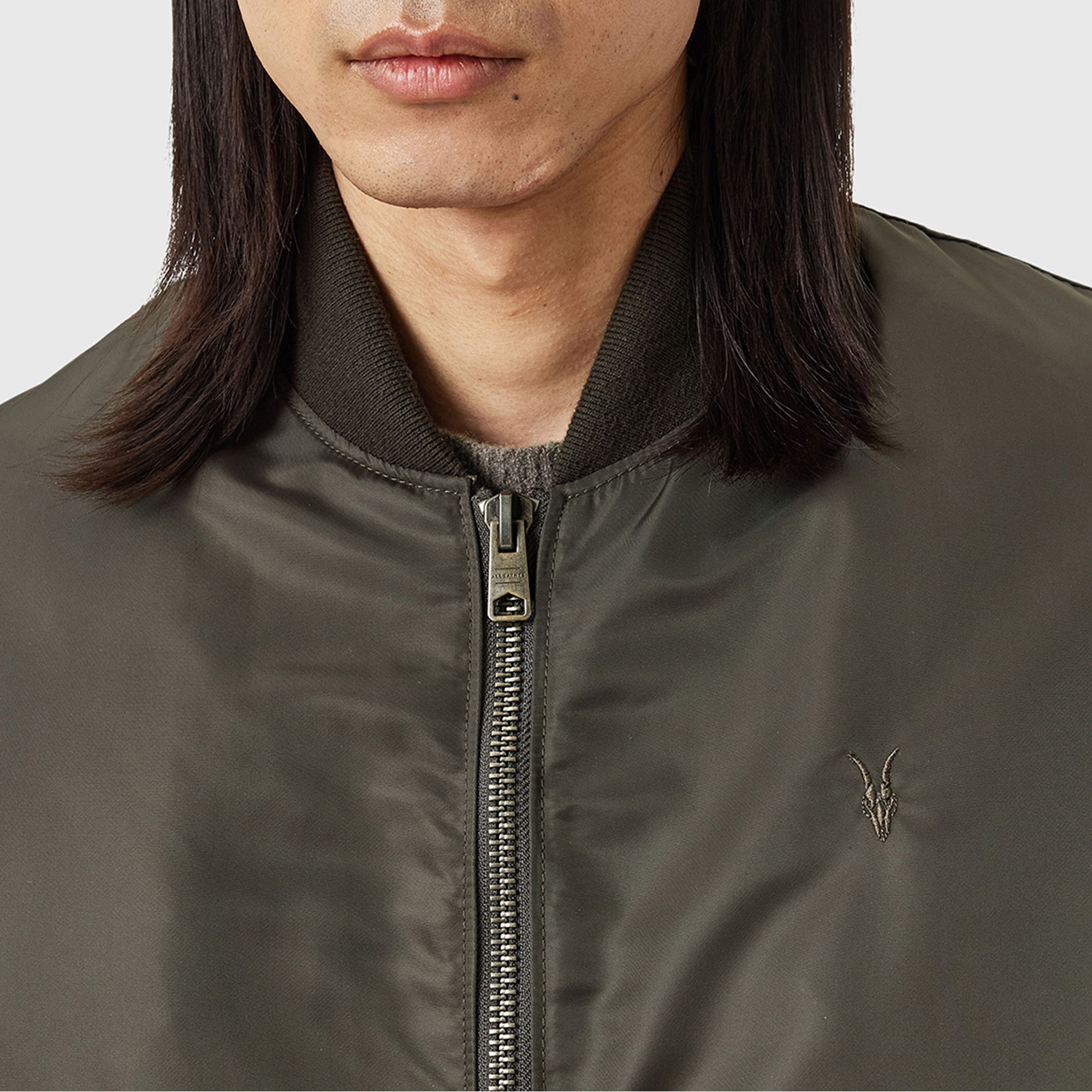 • Military-inspired style, twill nylon body, leather sleeves, silver-tone hardware, mid to lightweight feel, Ramskull branded logo embroidery detail, ribbed trims, metal flat snap fastenings, front zip fastening, pocket zip on sleeve, vertical internal pockets with snap closure