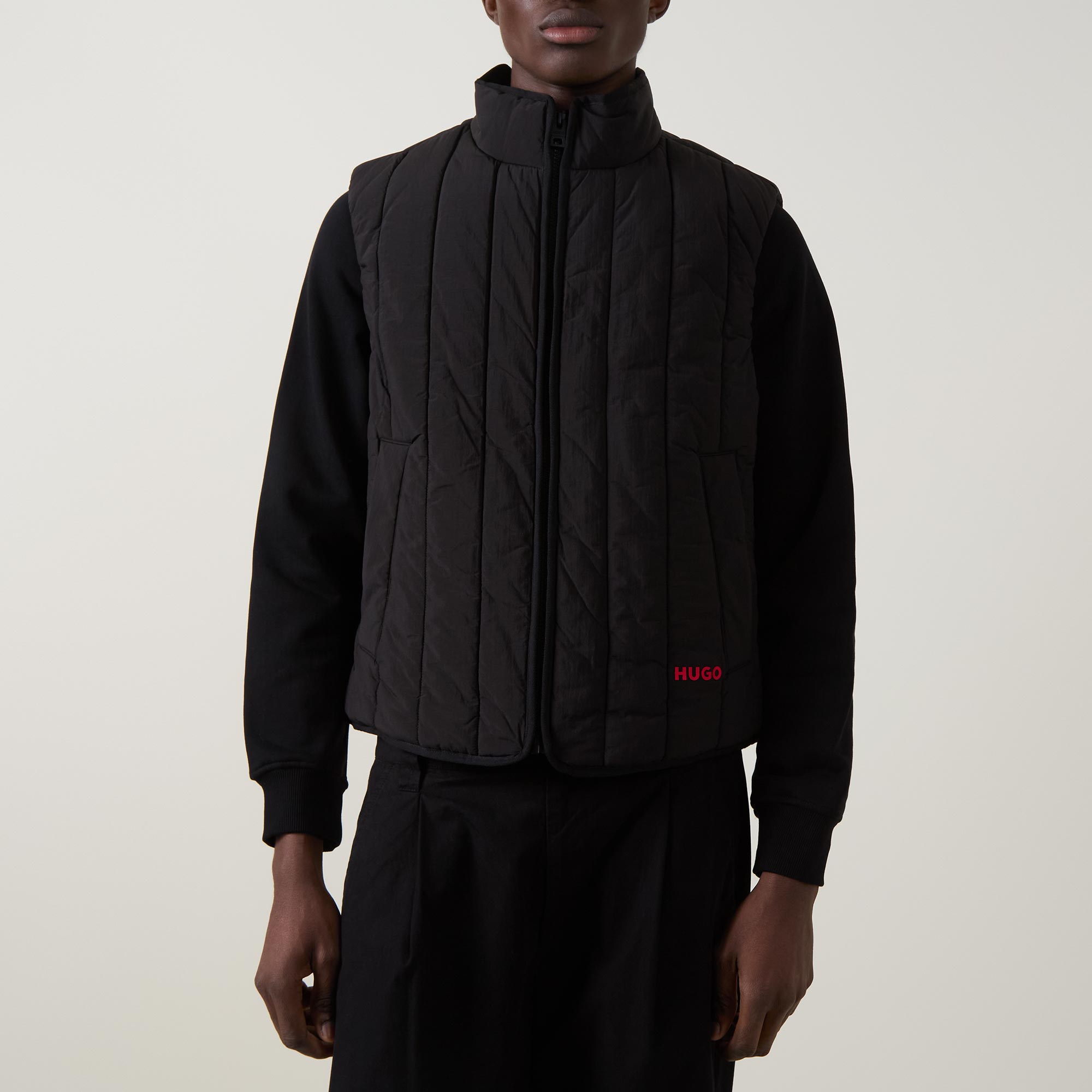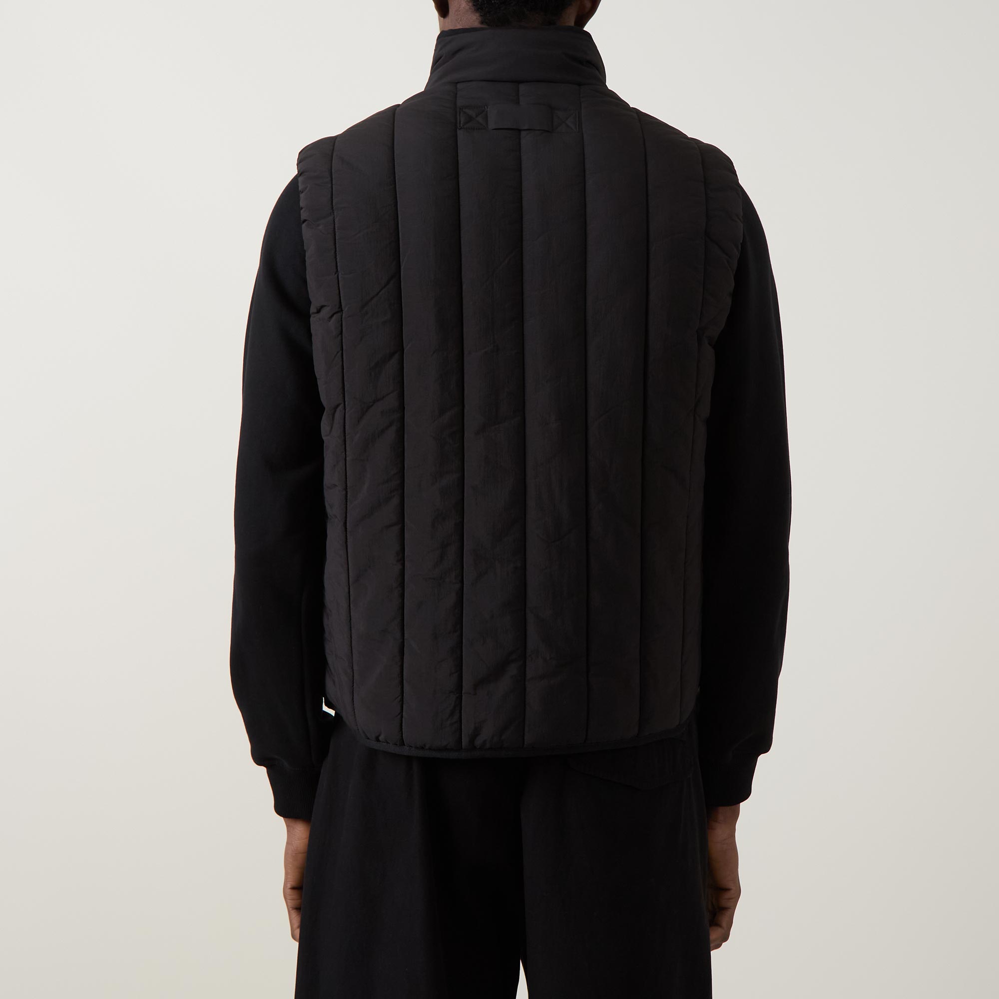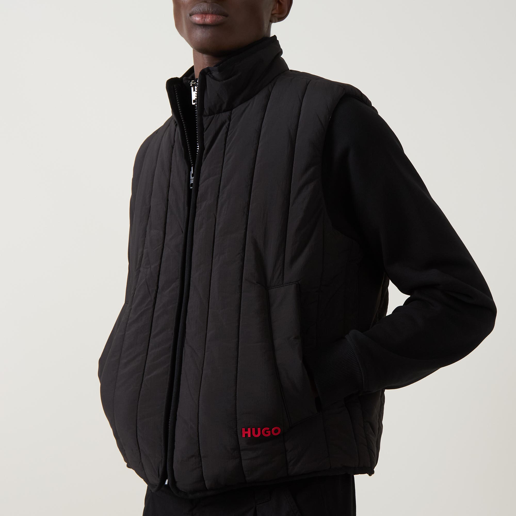 - Sleeveless, stand-up collar, full zip-through fastening, two side in-seam pockets, contrast logo branding, padded finish