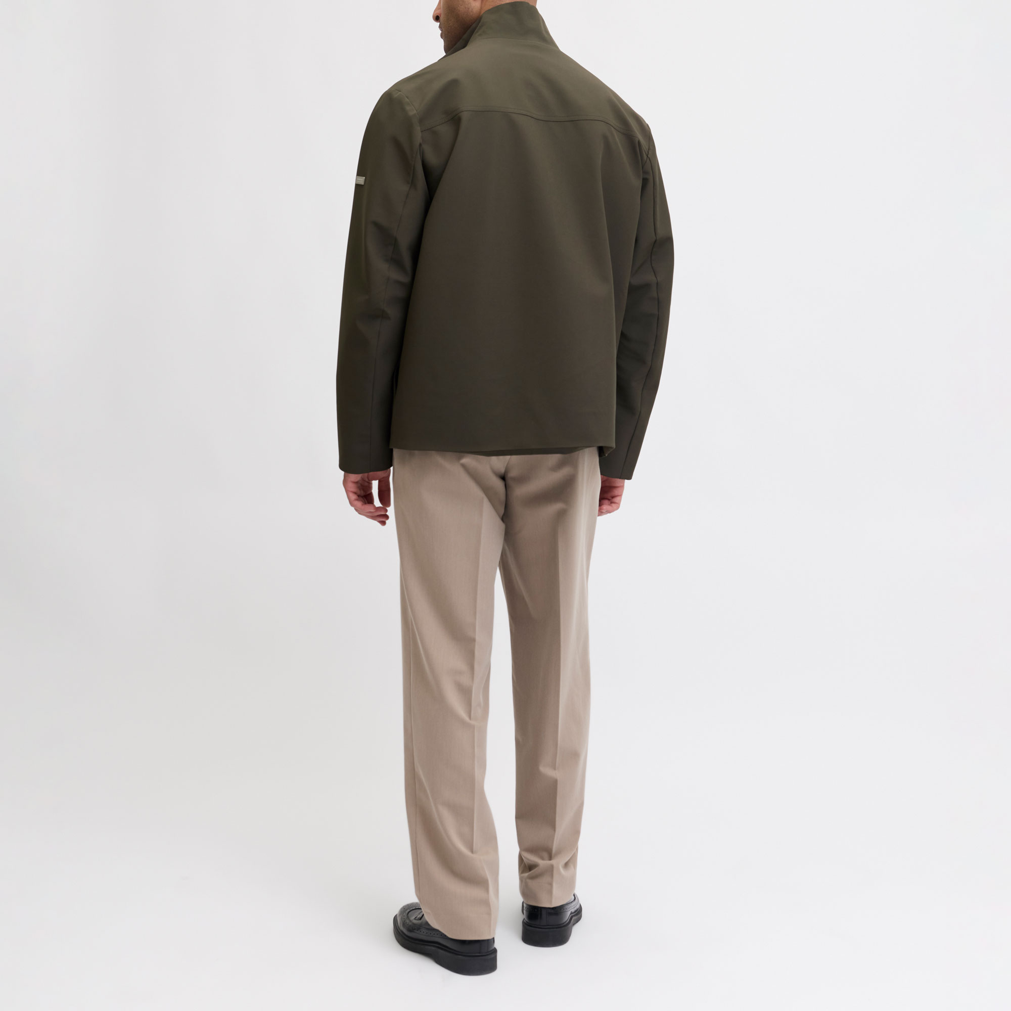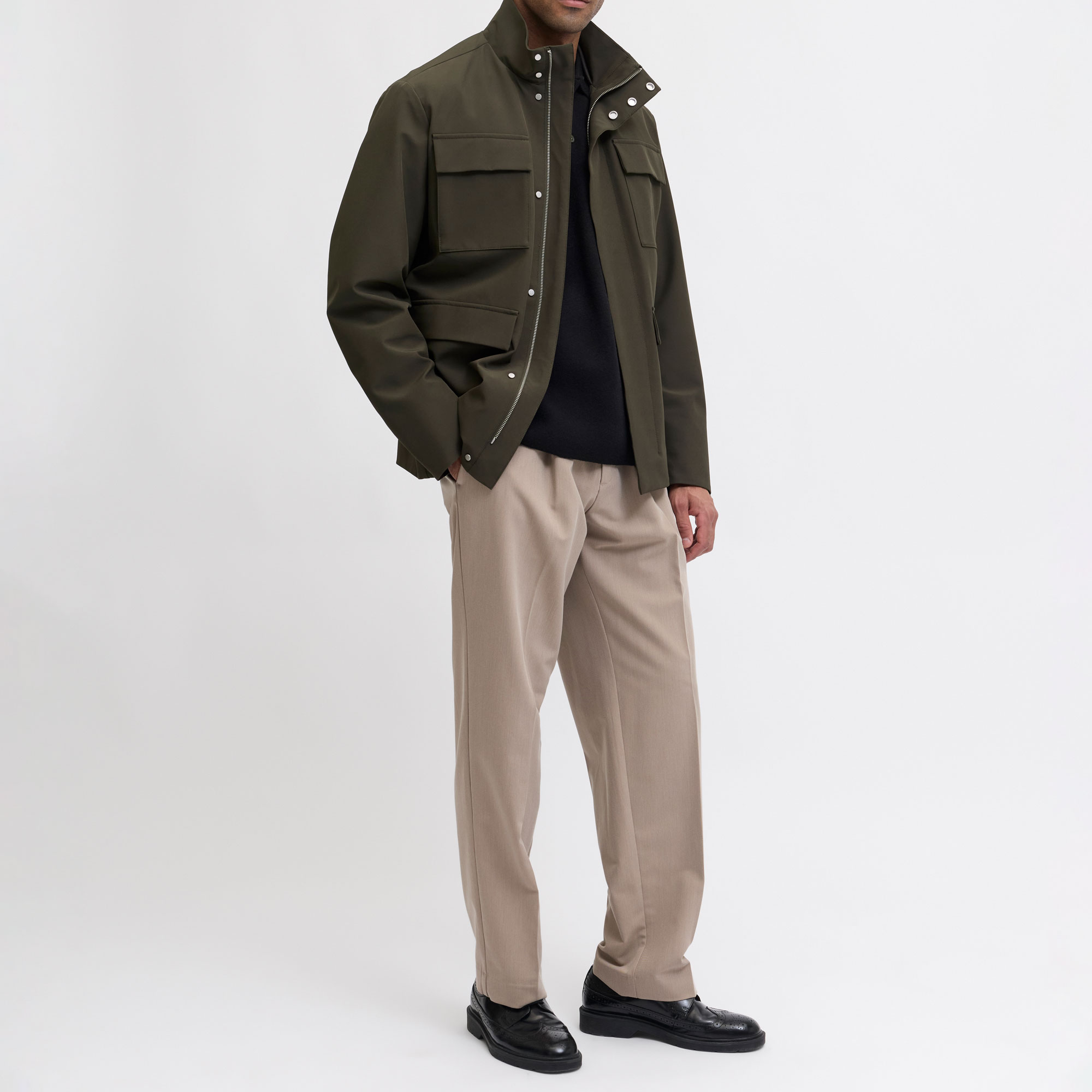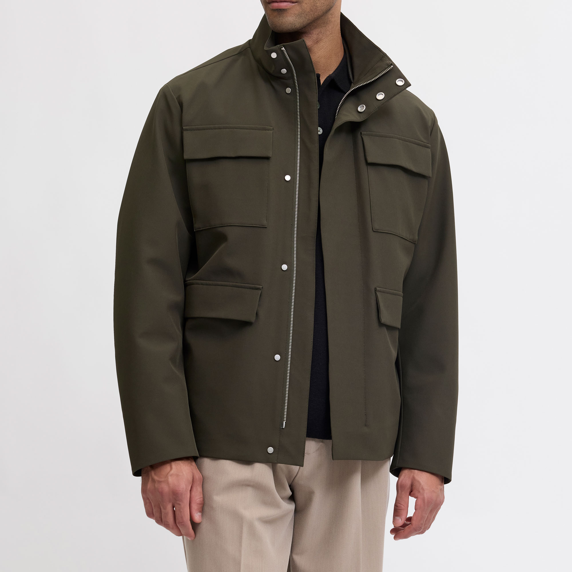 - Stand-up collar with snap-button fastenings, long sleeves, concealed placket, field style, four flap pockets, tonal stitching, straight hemline