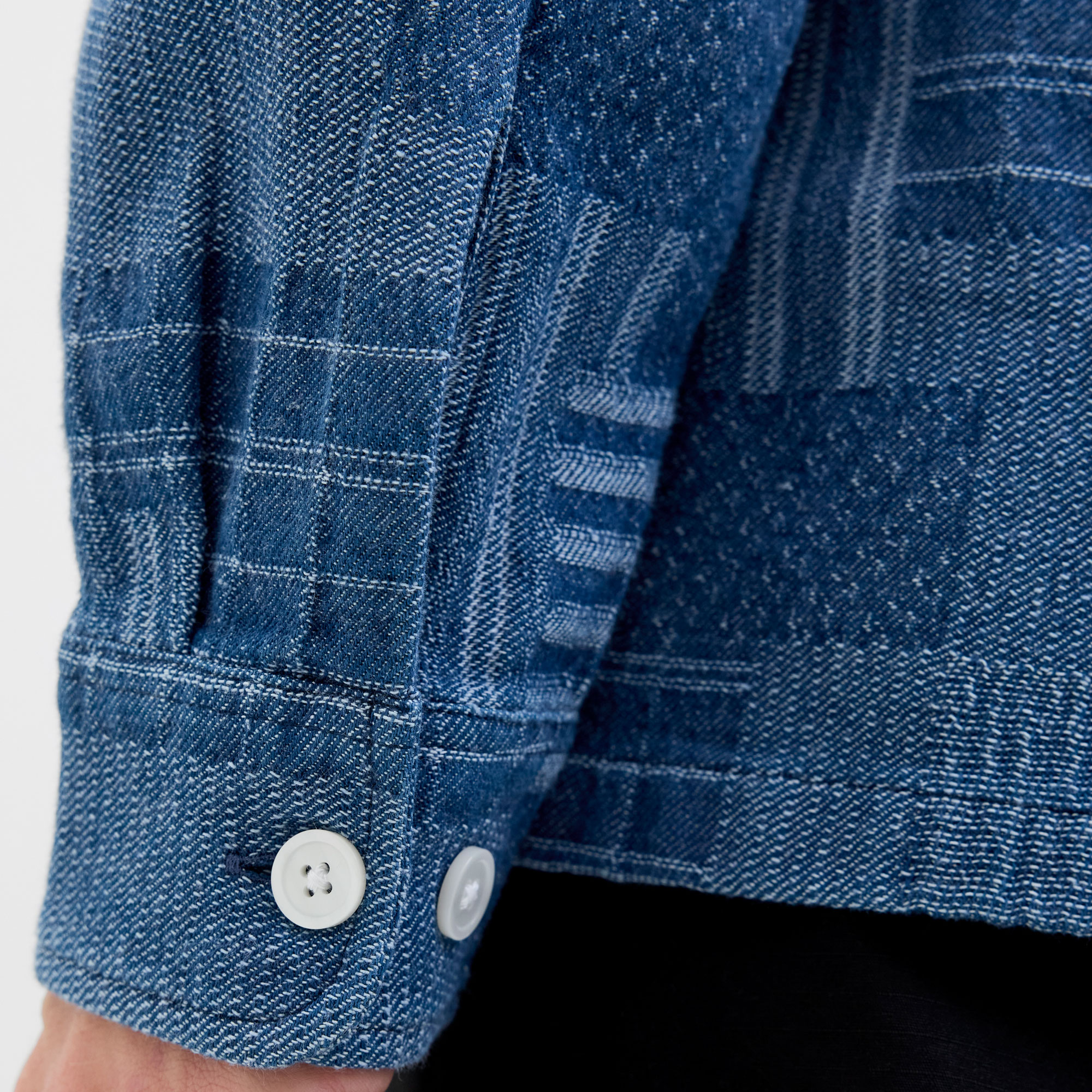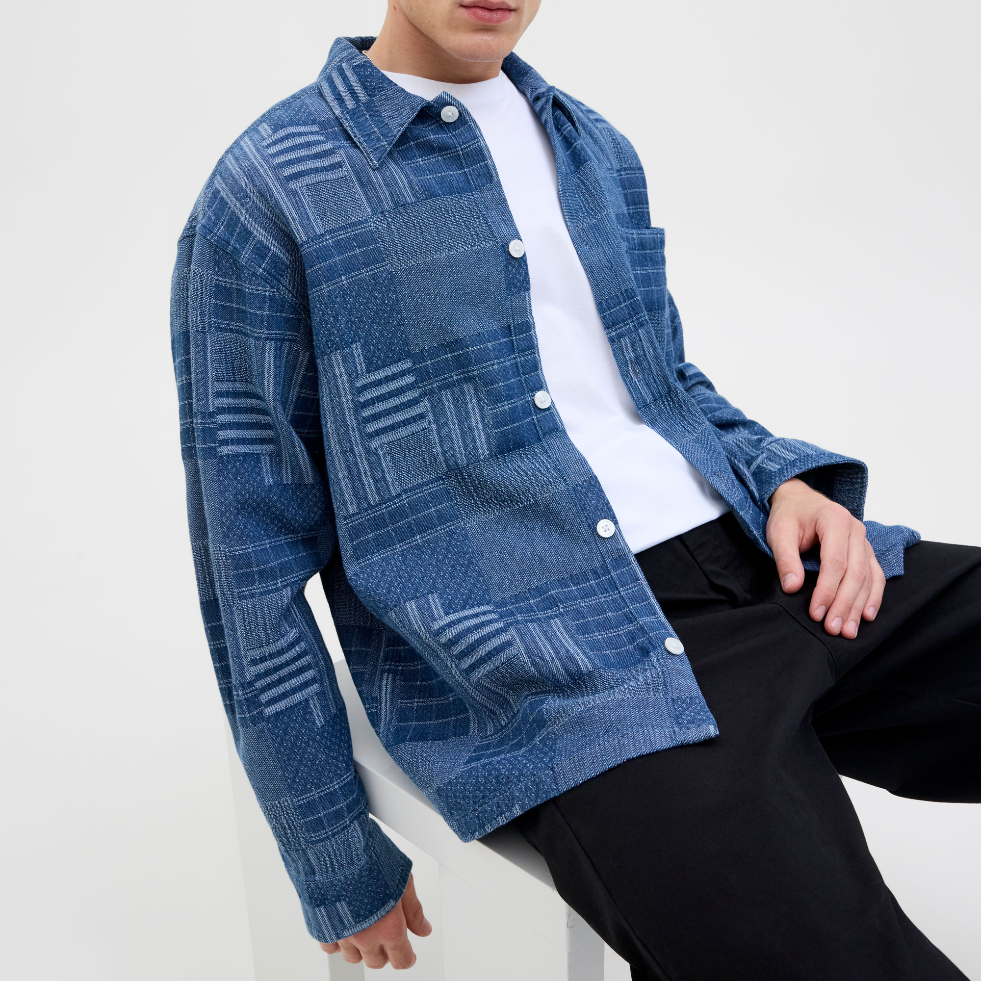 - Point collar, long sleeves, dropped shoulders, button fastening, chest patch pocket, patchwork design, single-button cuffs, tonal stitching