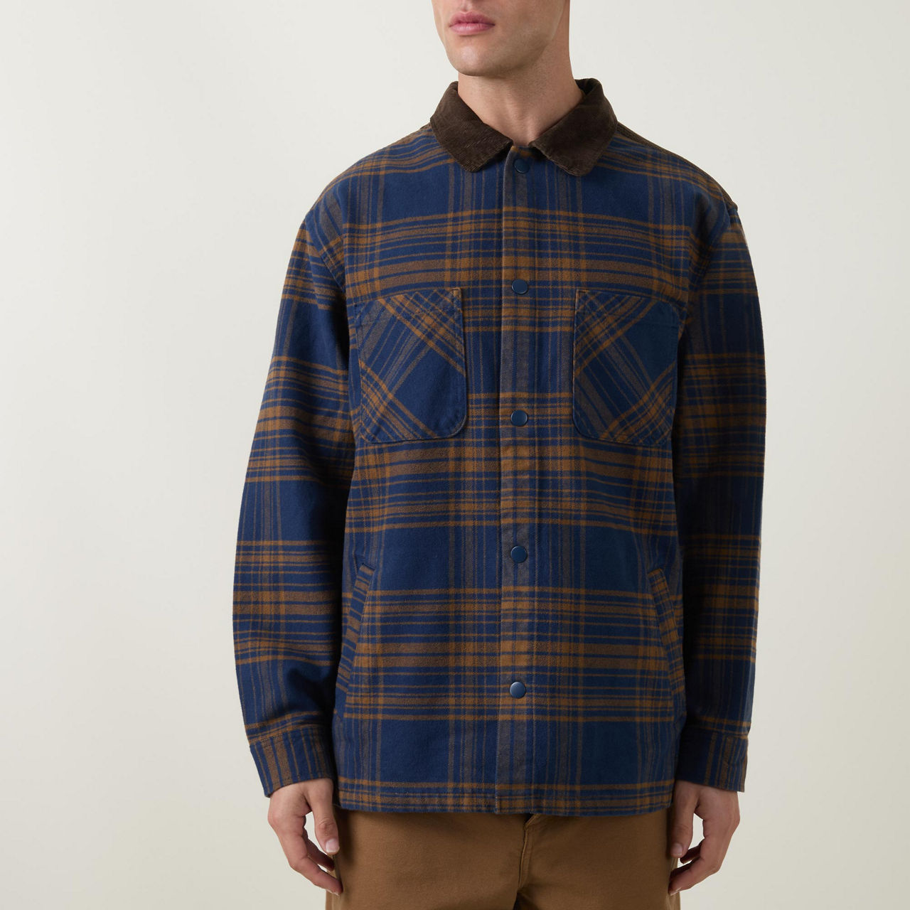 - Long-sleeved, pointed collar, button-down snap closure, plaid print, heavyweight, open double pockets, straight hemline