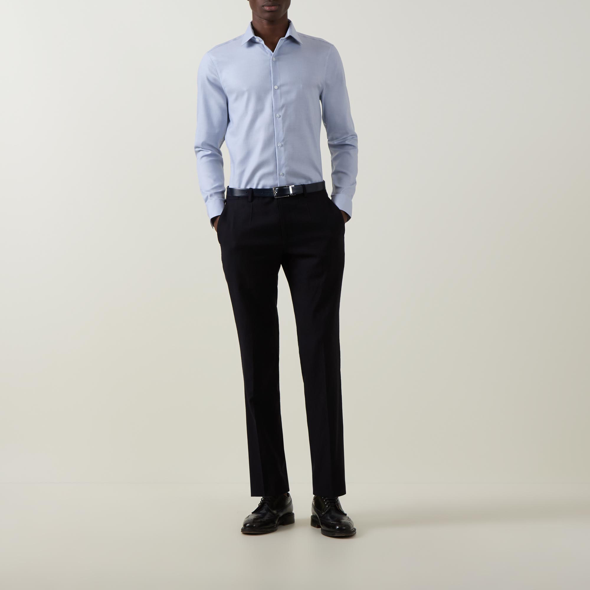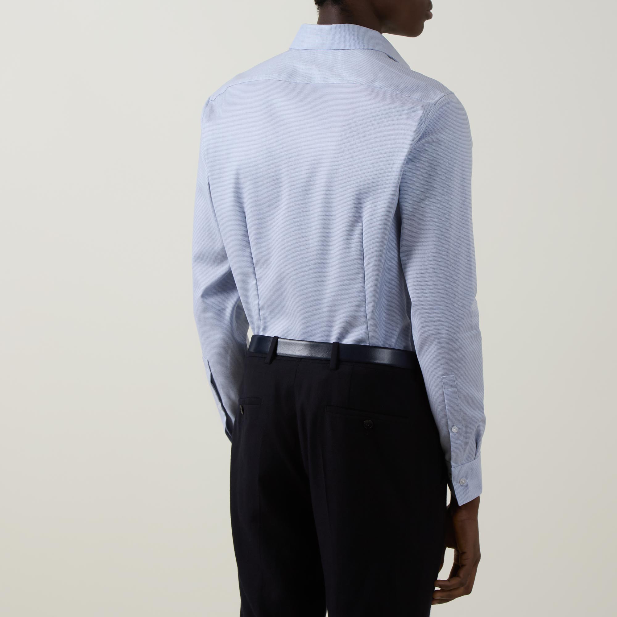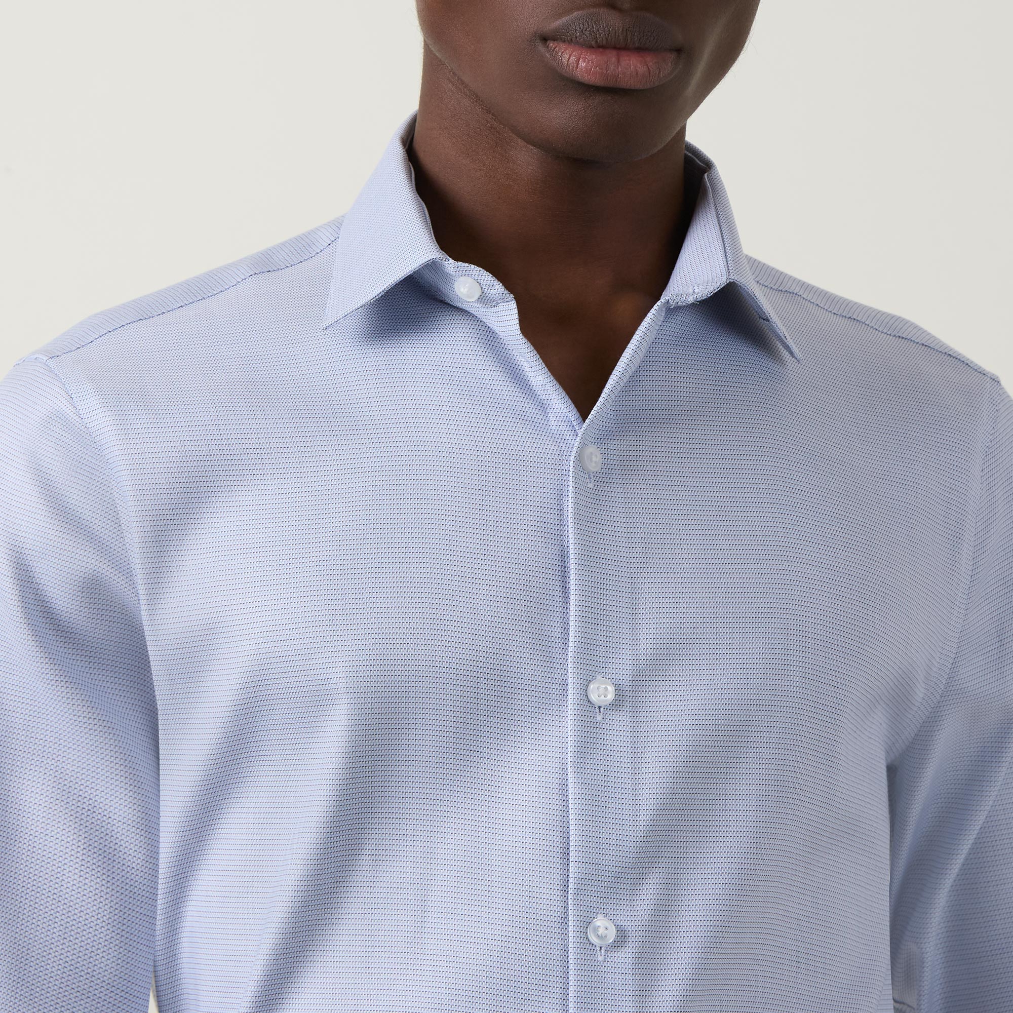 - Point collar, long sleeves, buttoned cuffs, front button fastening, curved hem, textured finish