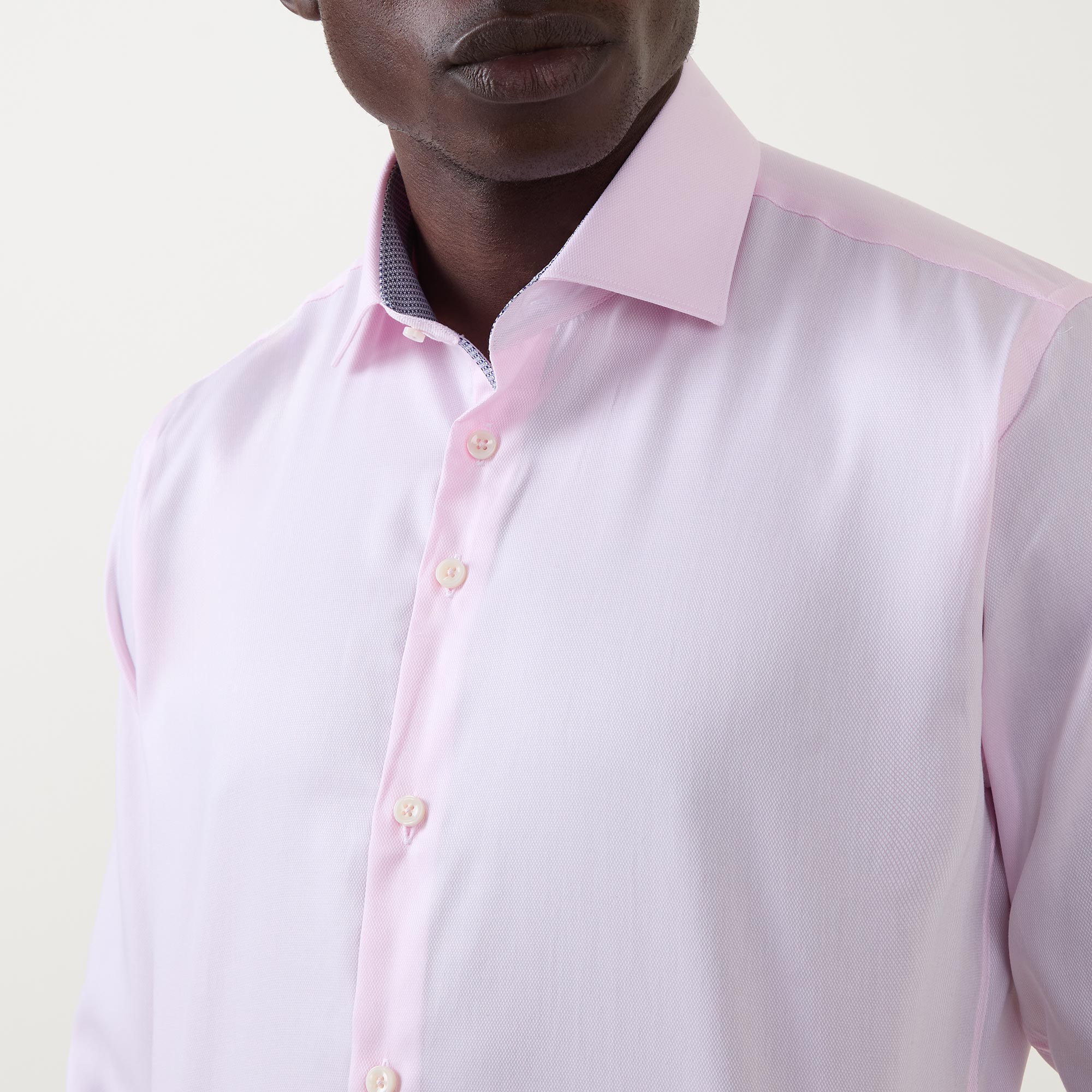 - Classic collar, long sleeves with single cuffs, front button fastening, curved hem, geometric print inside collar