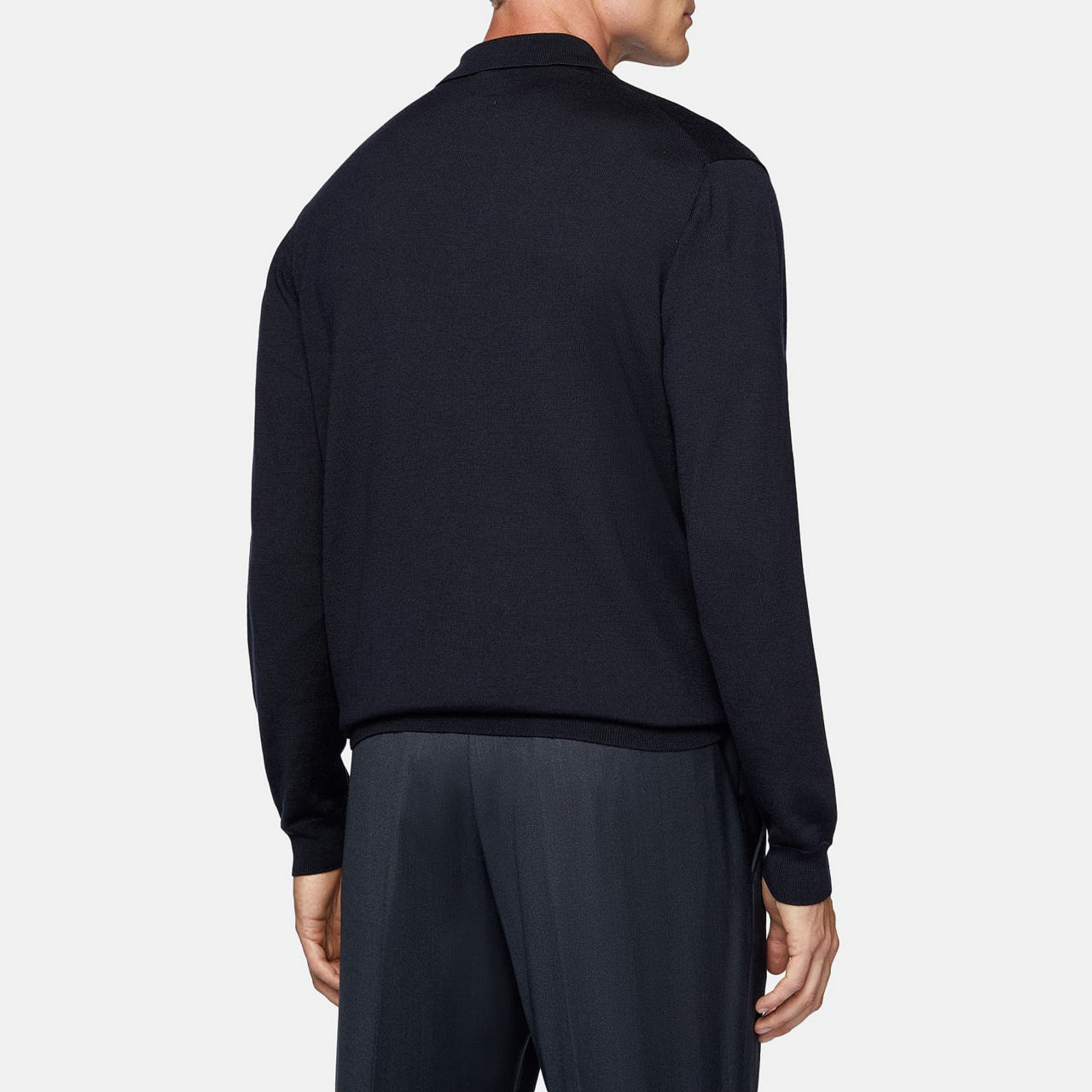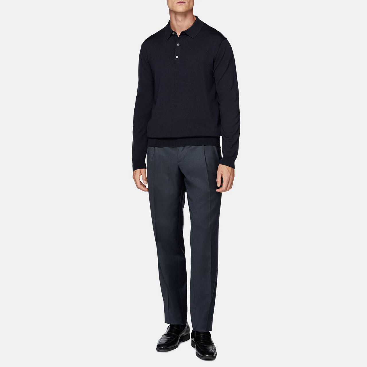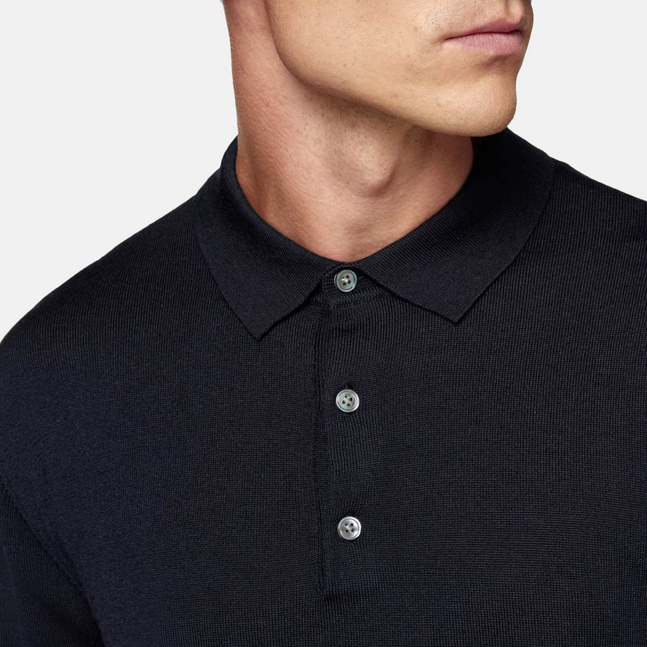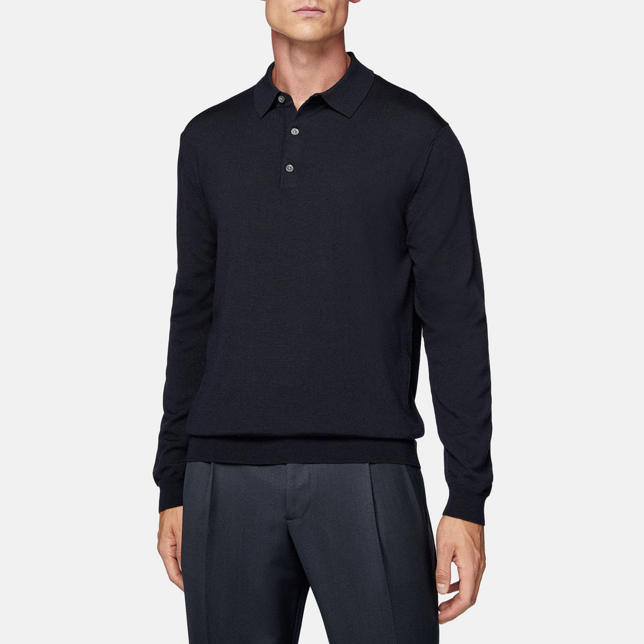 - Long sleeves, polo collar, button fastenings, straight hemline