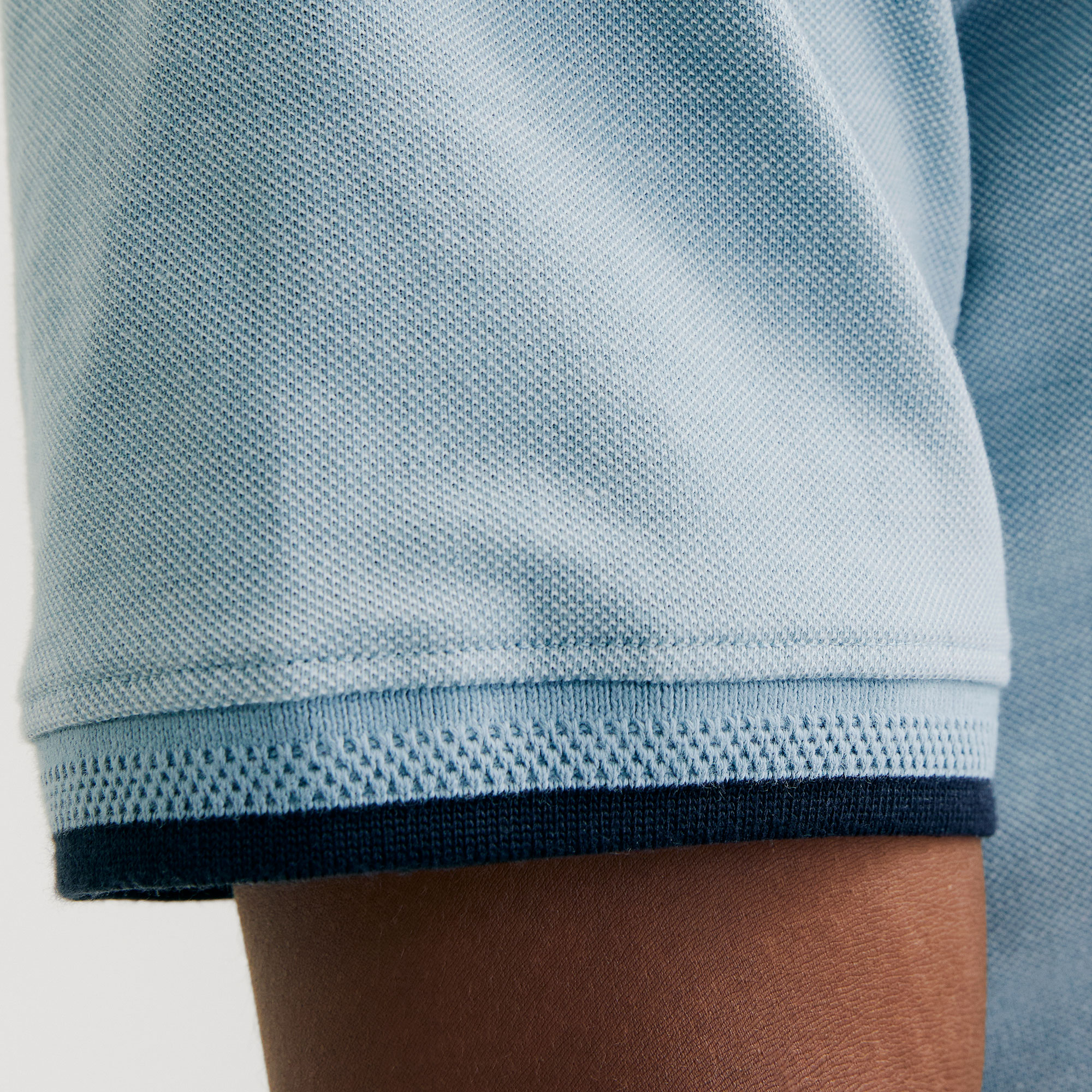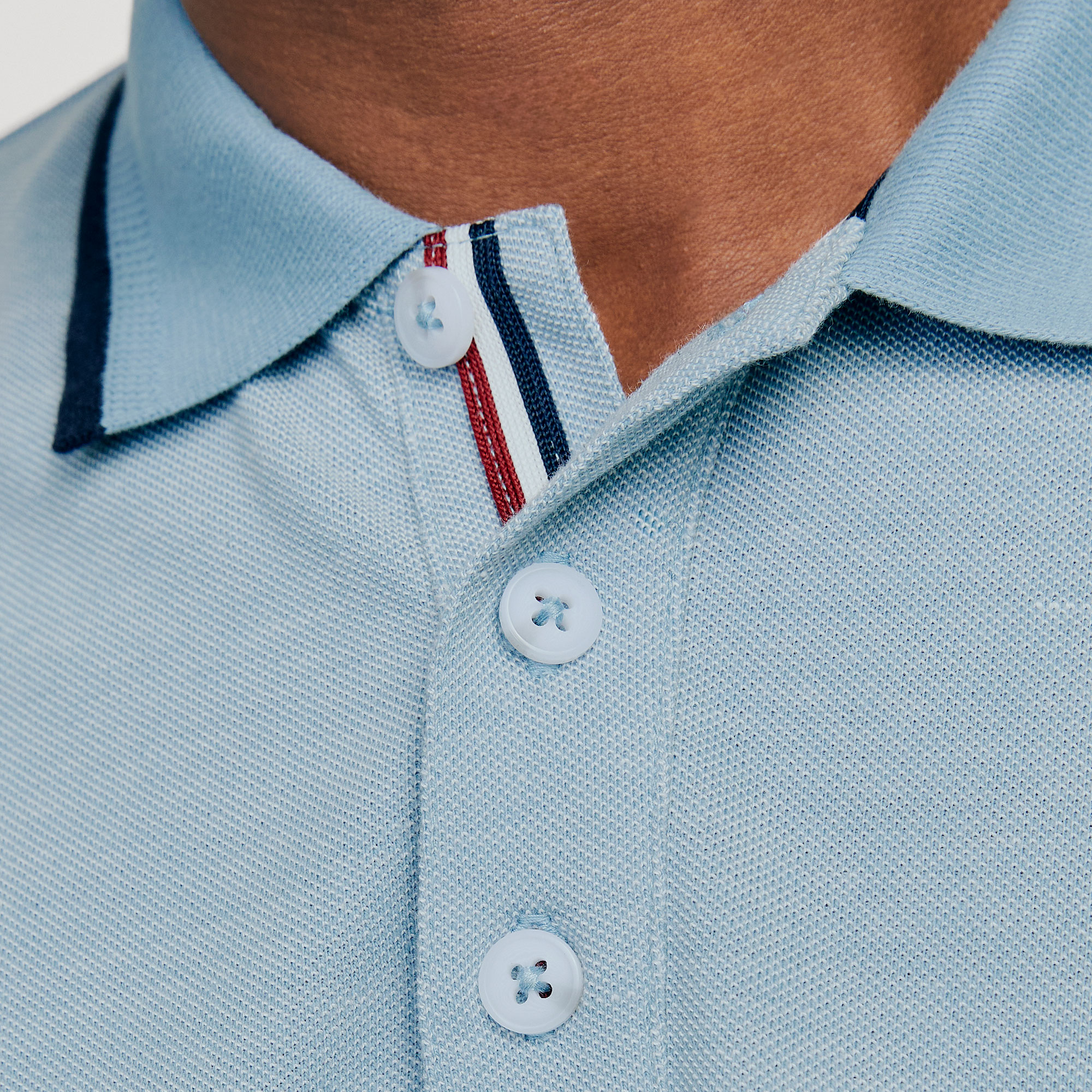 - Piqué fabric, subtle geometric pattern, light feel, polo neckline, short sleeves, button fastenings, logo detail
