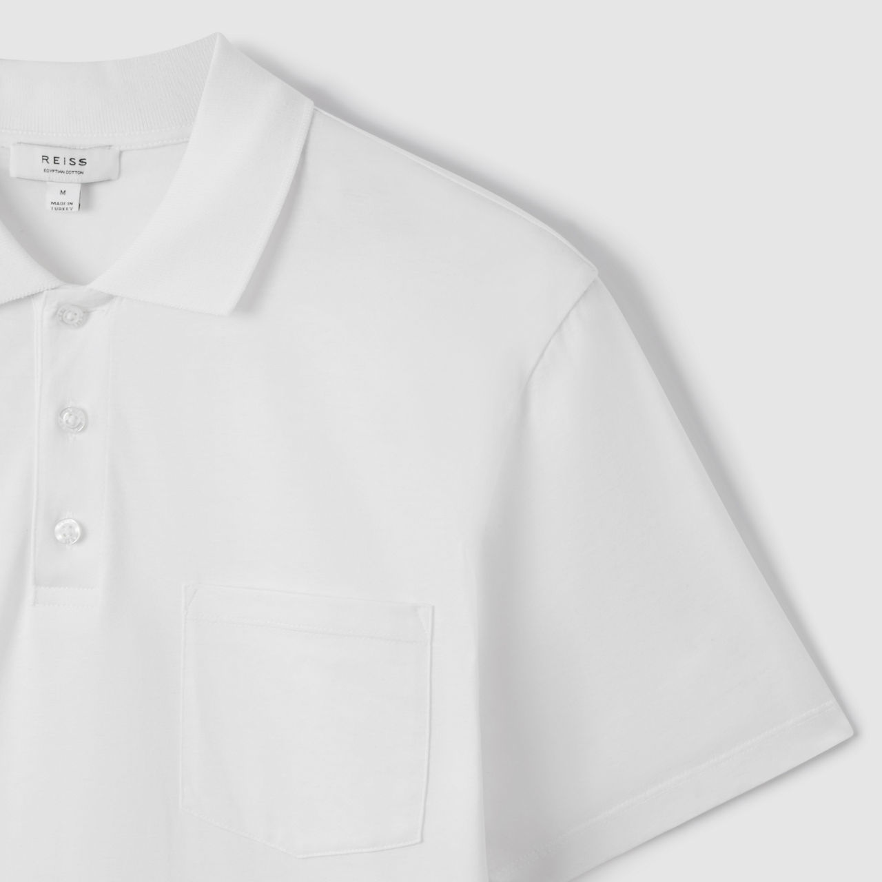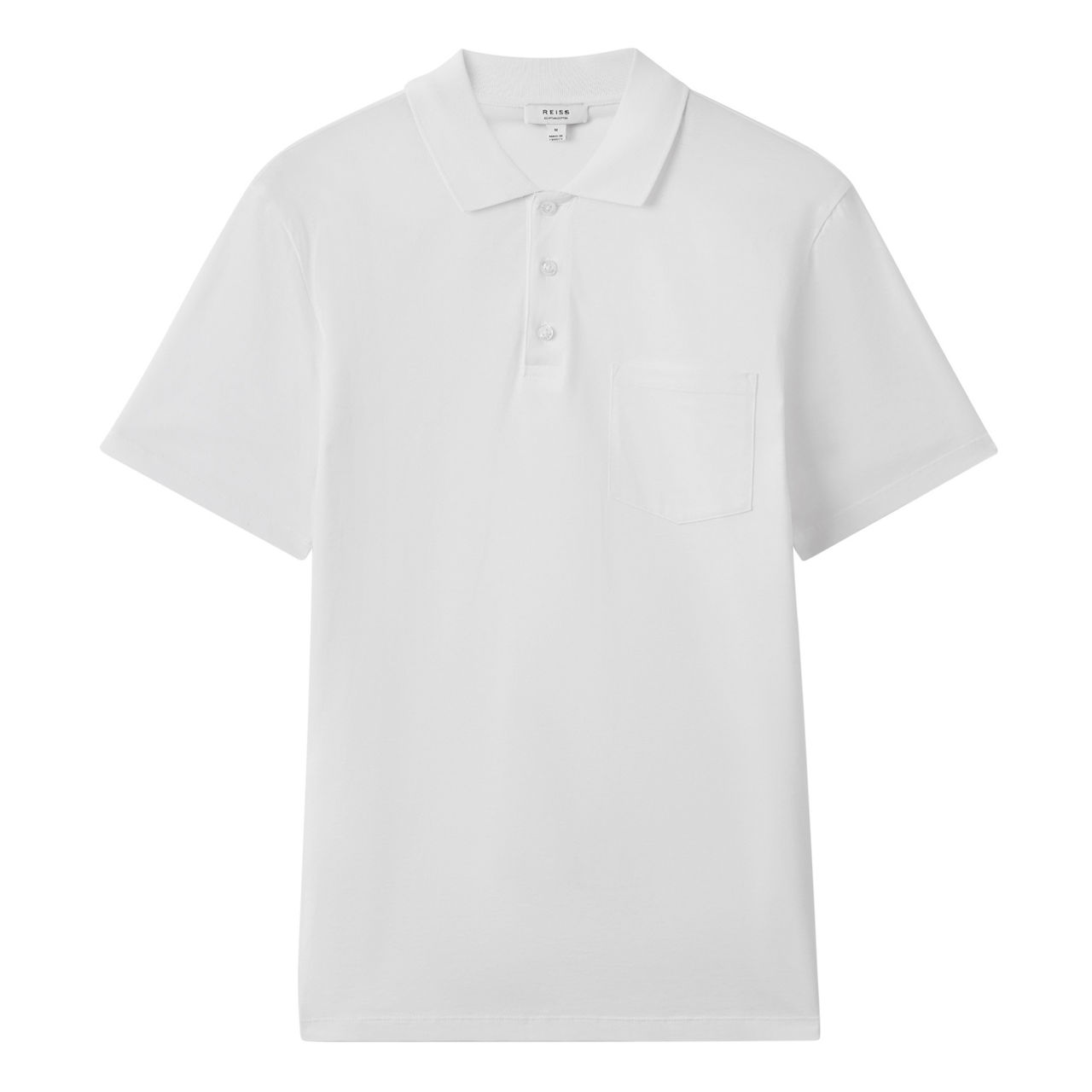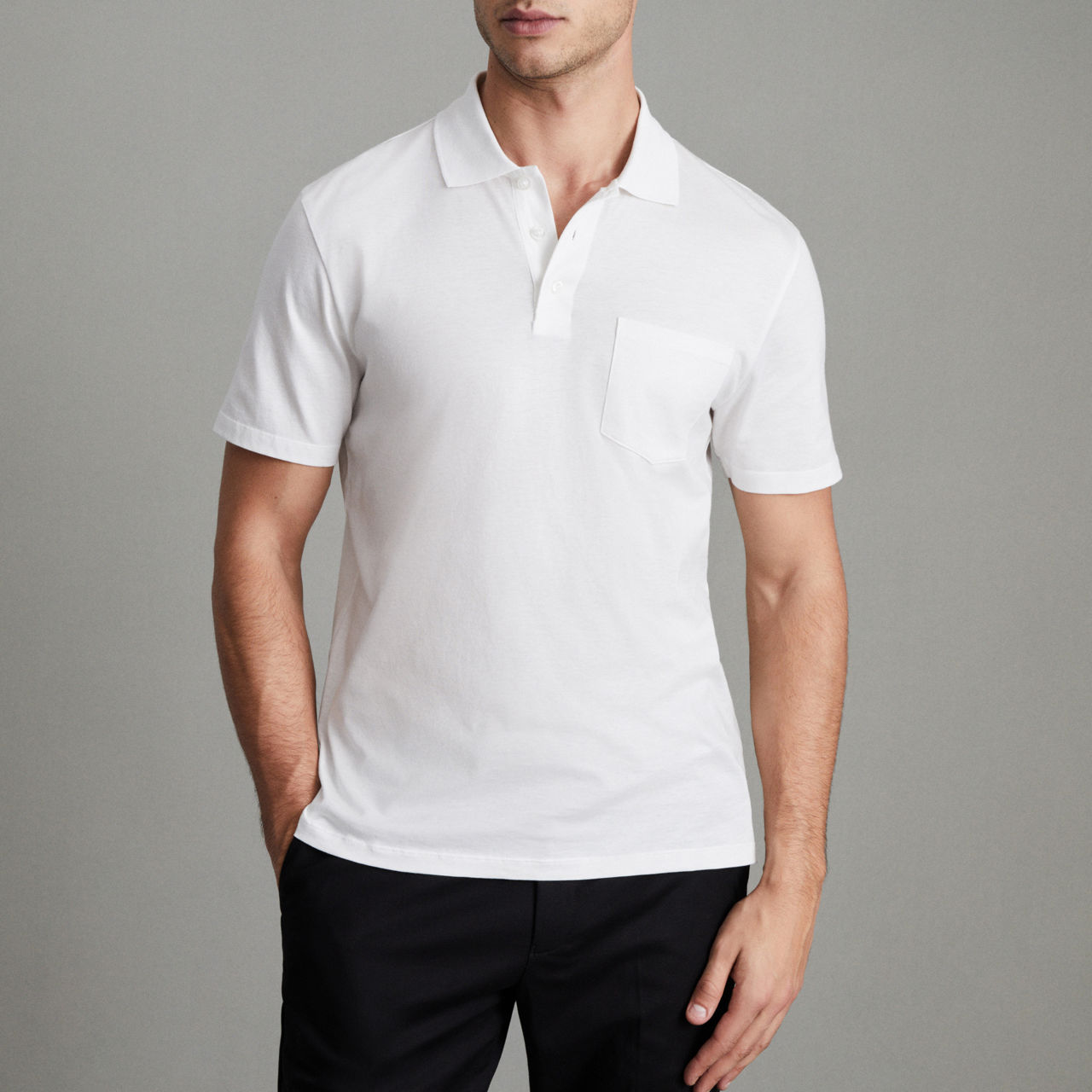 - Polo collar, three-button placket, short sleeves, chest pocket, tonal stitching, straight hemline, smooth fabric