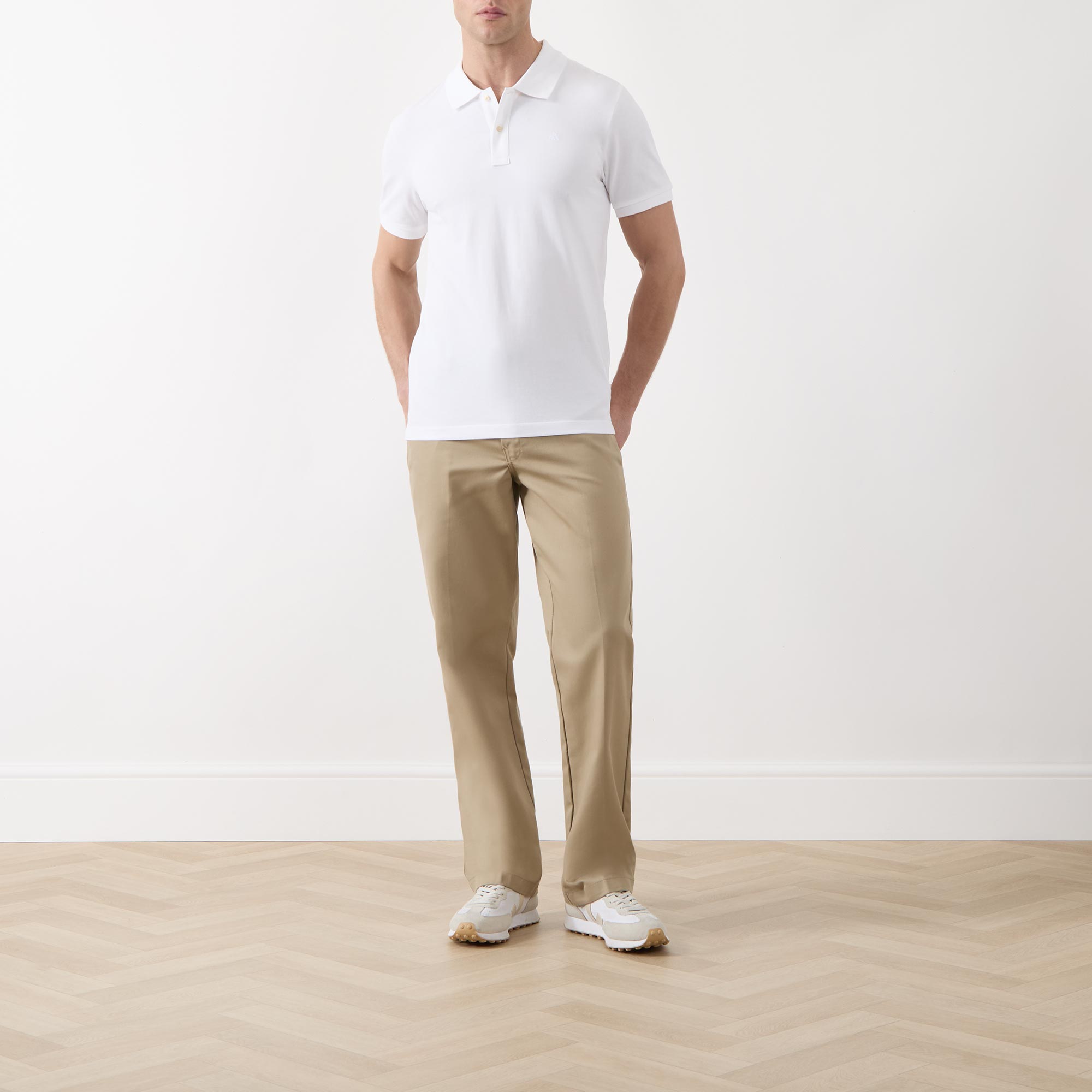 - Short sleeves, flat polo collar, two-button collar, tonal stitching, straight hemline, smooth fabric
