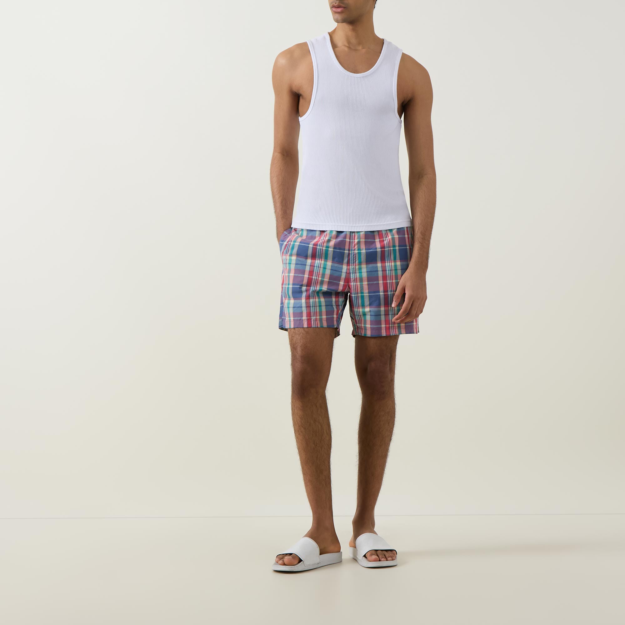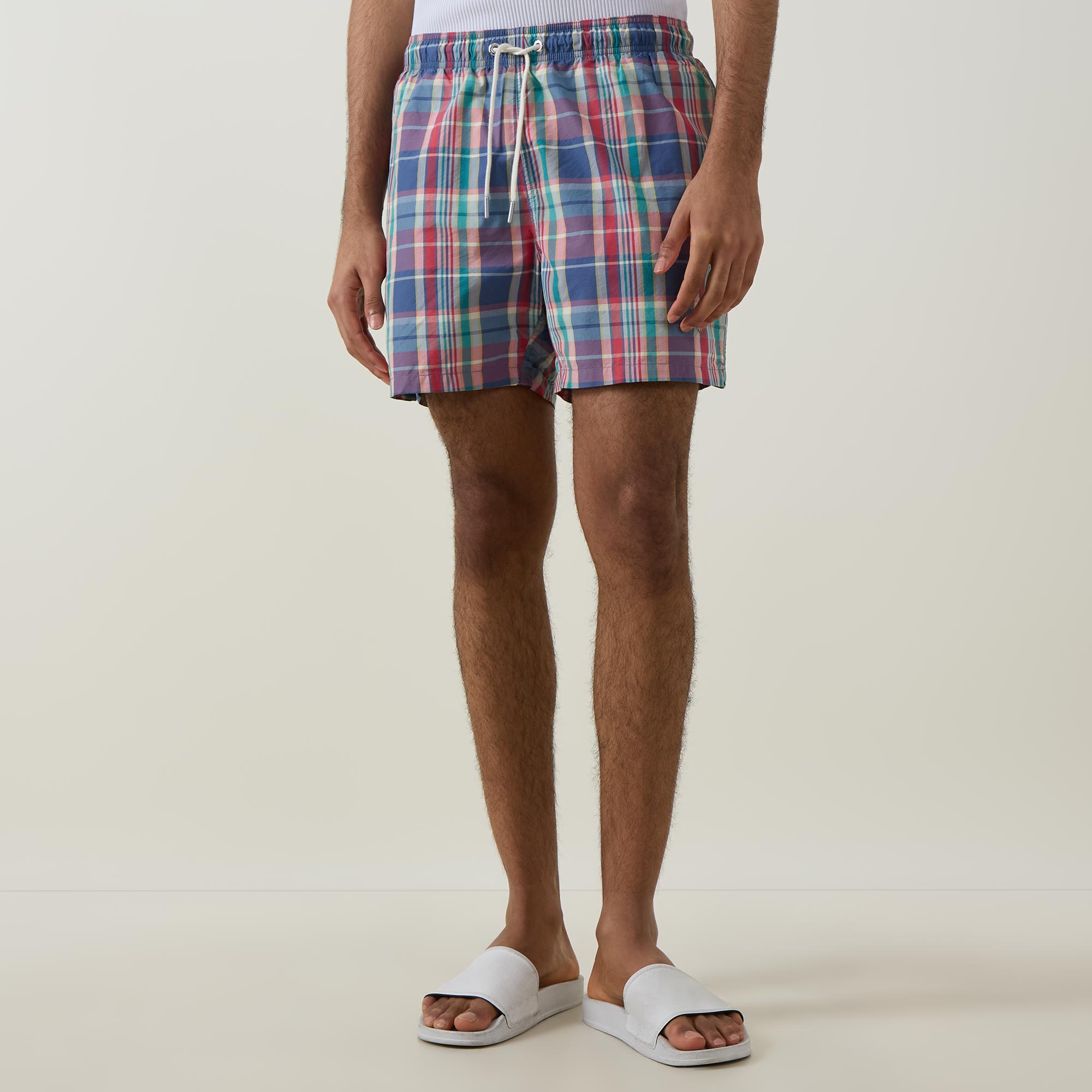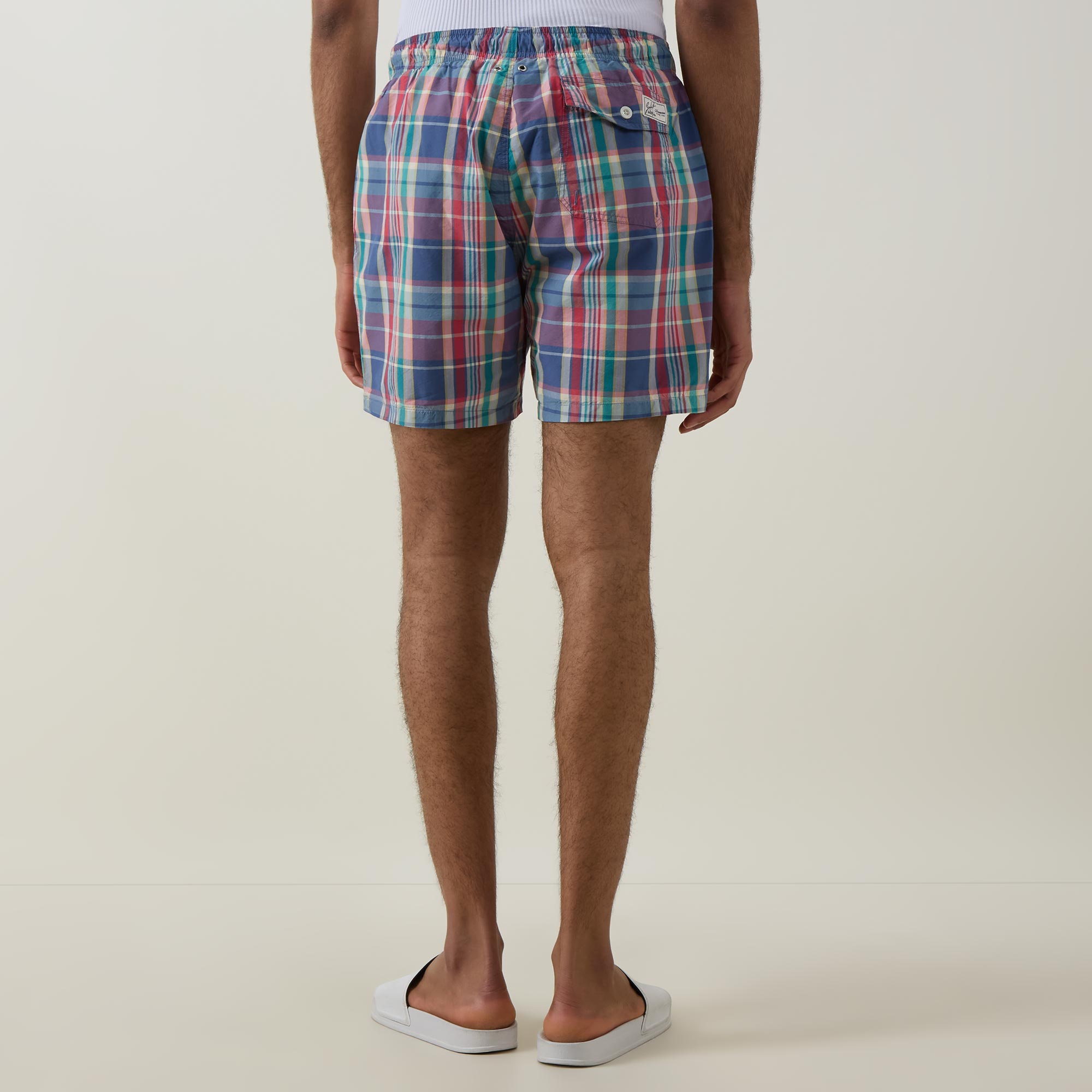 - Mid-rise, straight-leg, above the knee length, elasticated waist, adjustable drawstring fastening, two side entry pockets, one rear flap pocket with button fastening, clean hems, logo badge, check print