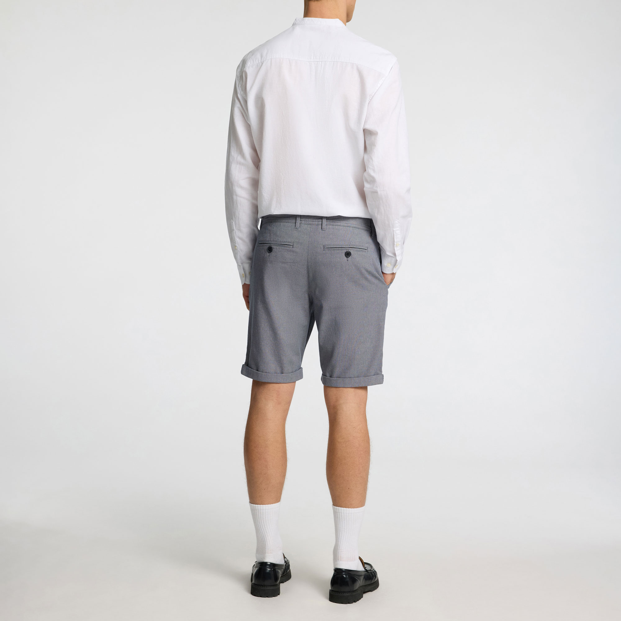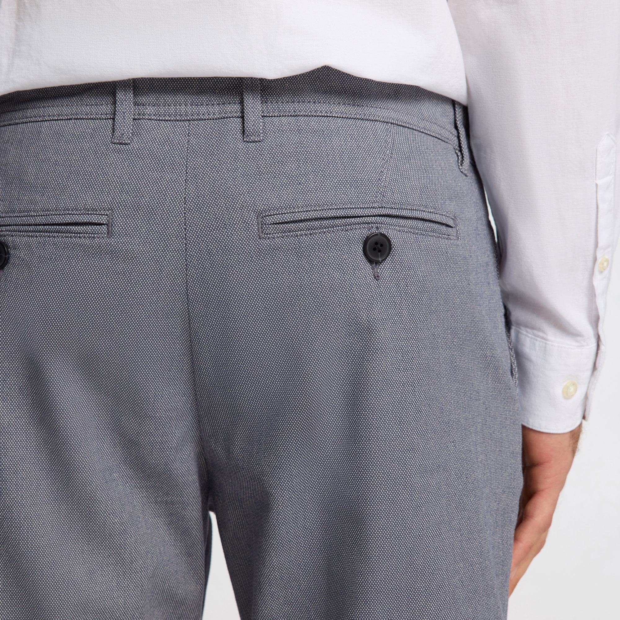 - Mid-rise, zip fly and button fastening, slim leg, side pockets, back welt pockets, belt loops, turn-up cuffs, woven lining