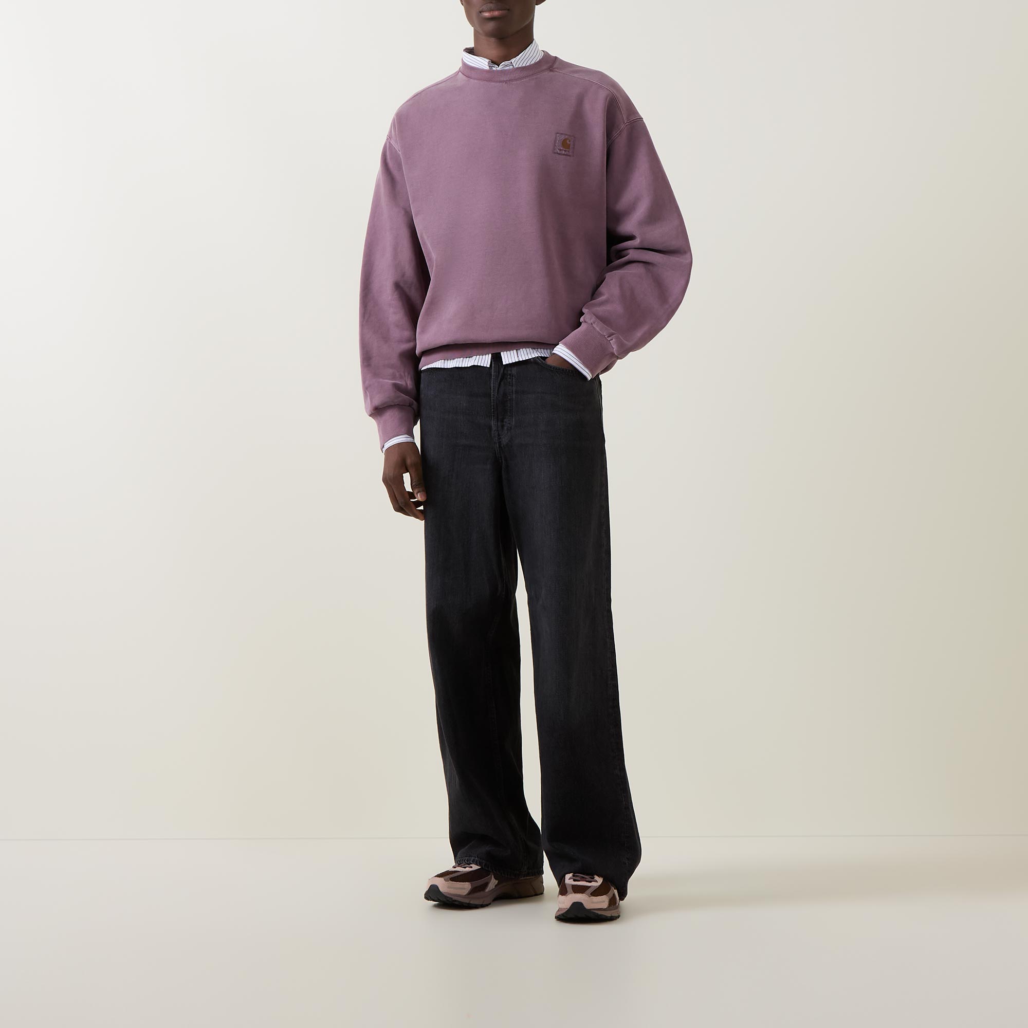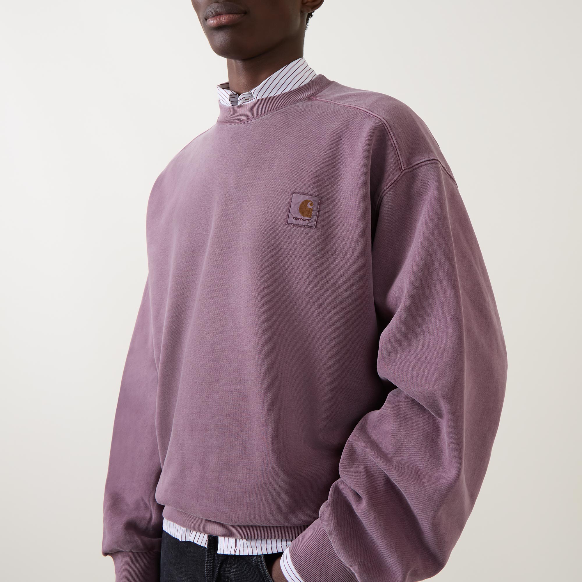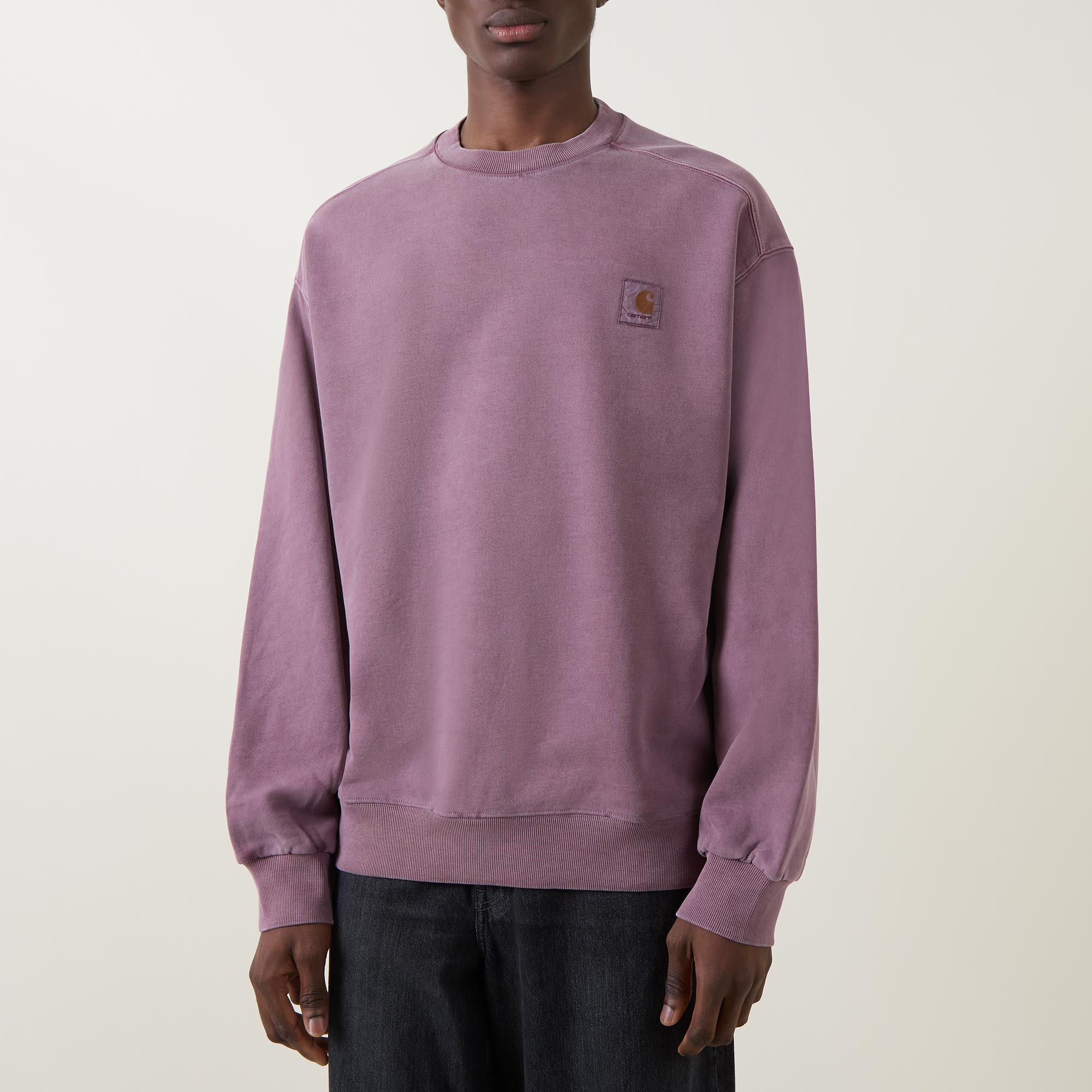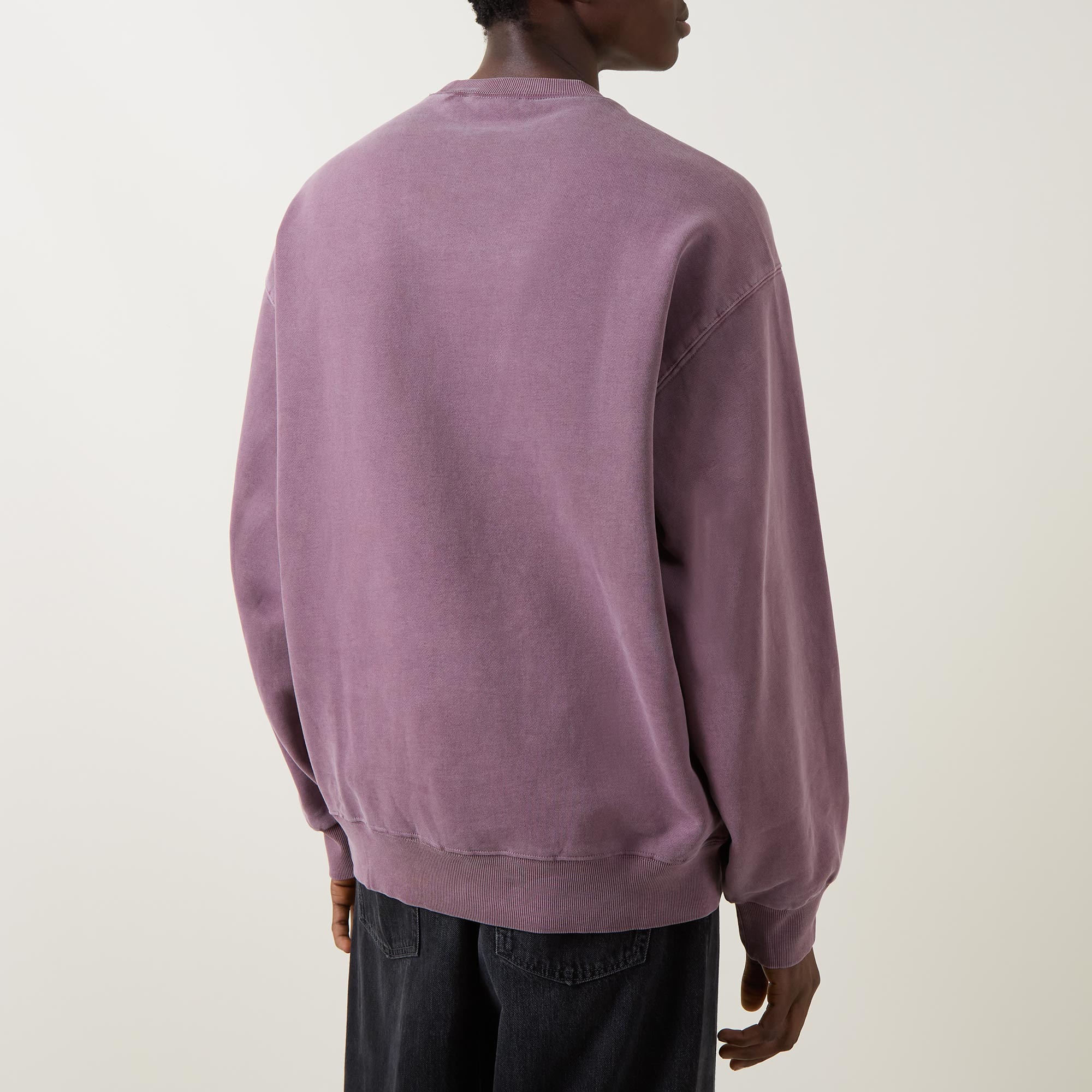 - Crew neck, dropped shoulders, long sleeves, straight hem, ribbed trims, tonal logo badge, pigment dyed finish