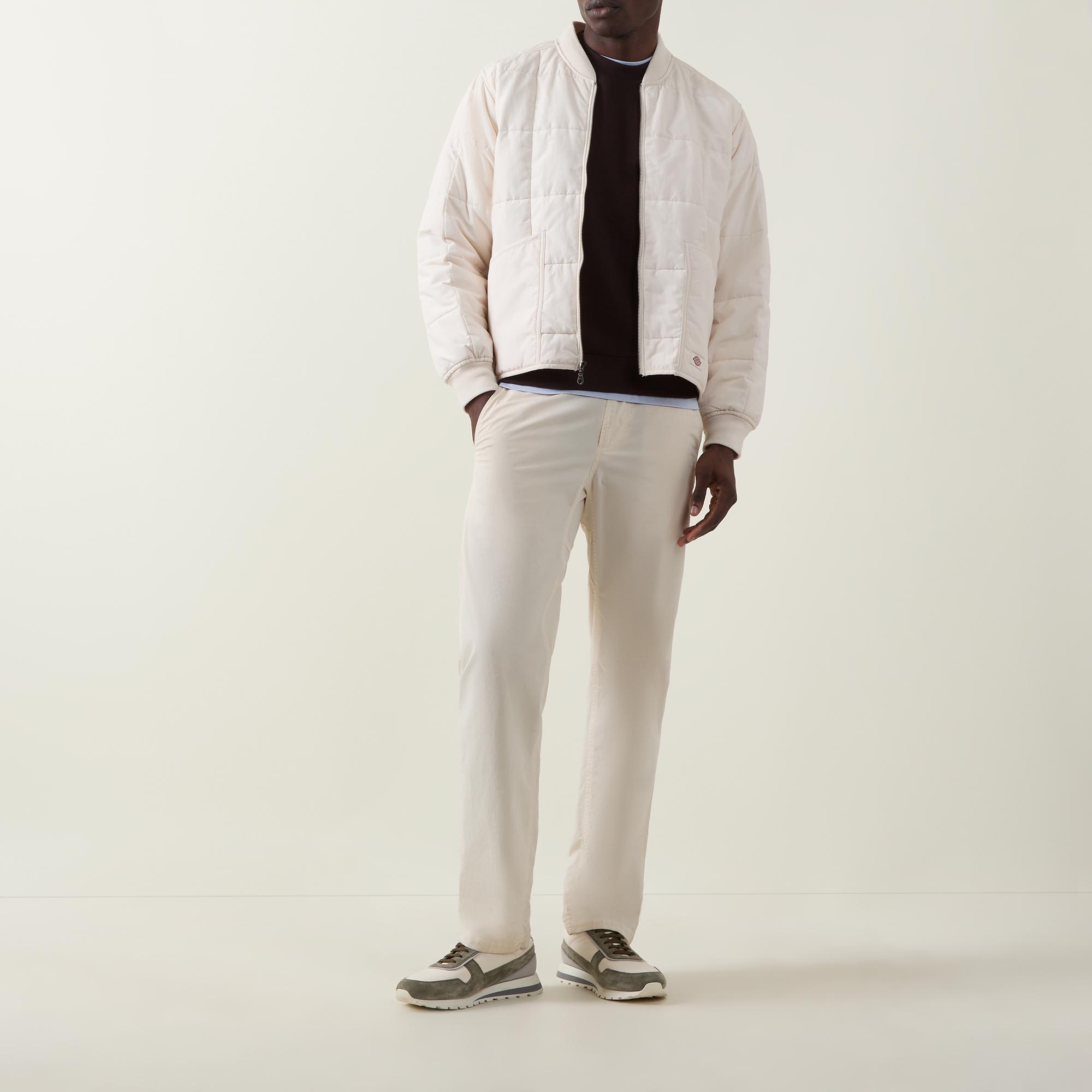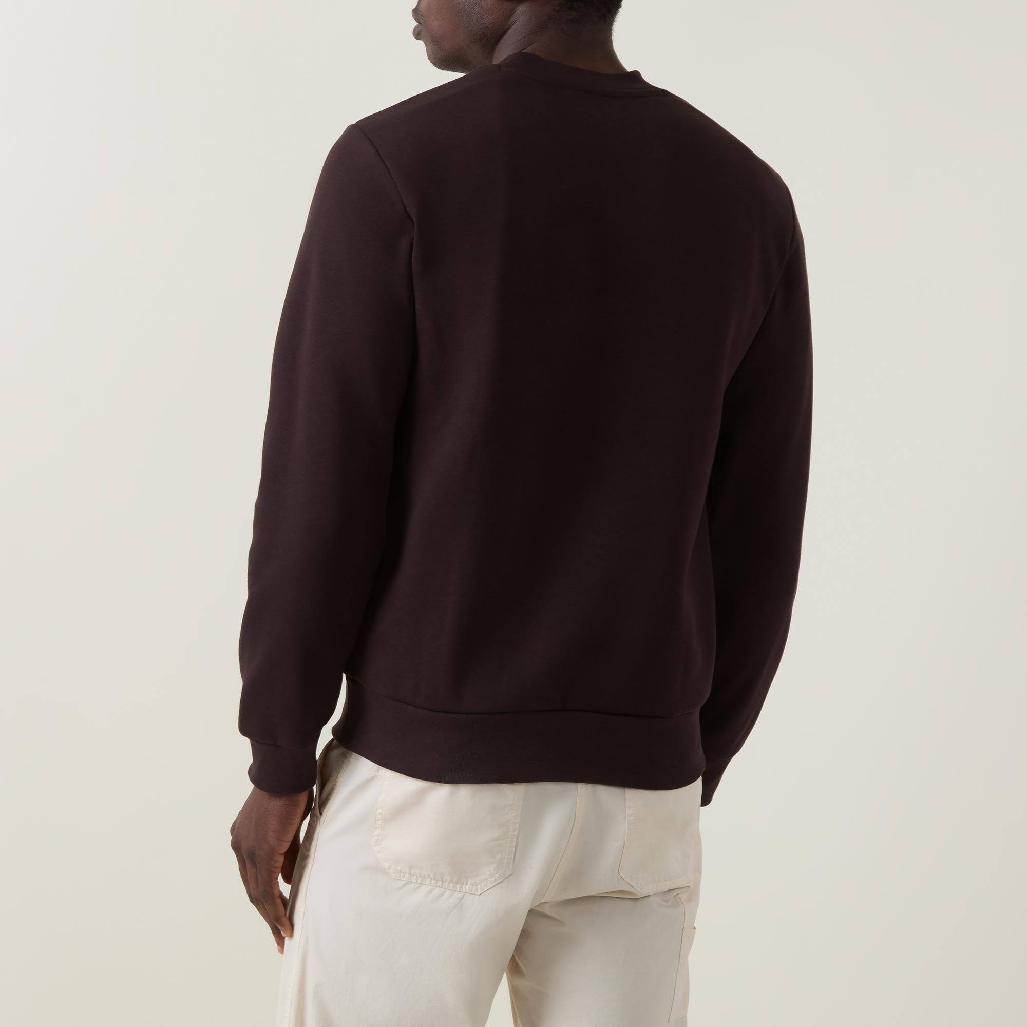 - Crew neckline, long sleeves, ribbed trims, straight hemline