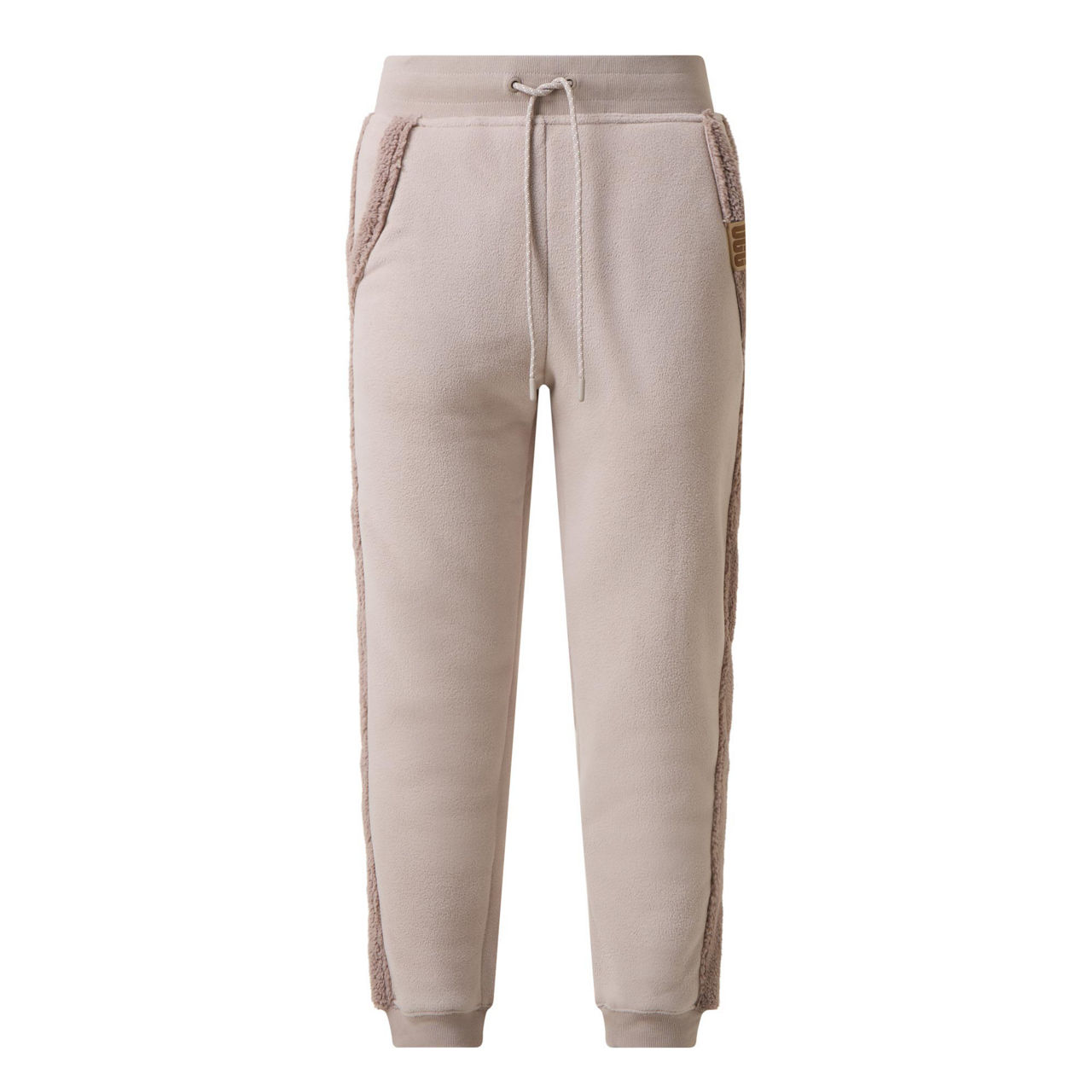 - Elasticated waistband with drawstring fastening, two side slit pockets, one rear patch pocket, rib-knit ankle cuffs, fleece-lined seams, logo patch, smooth fabric