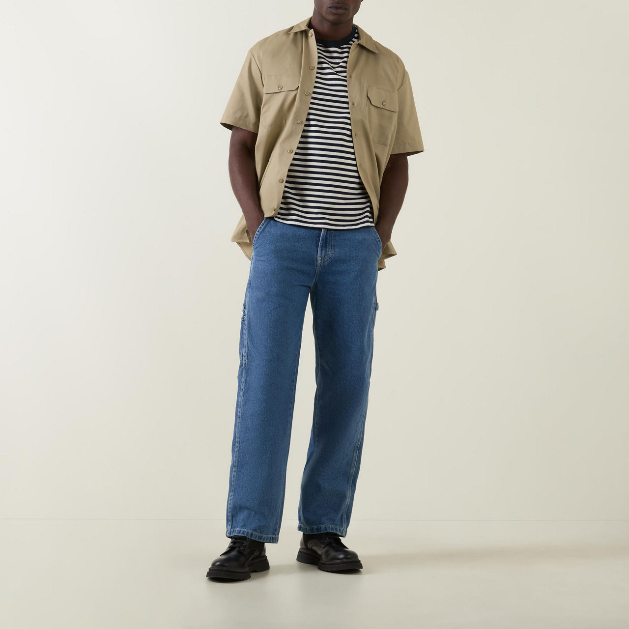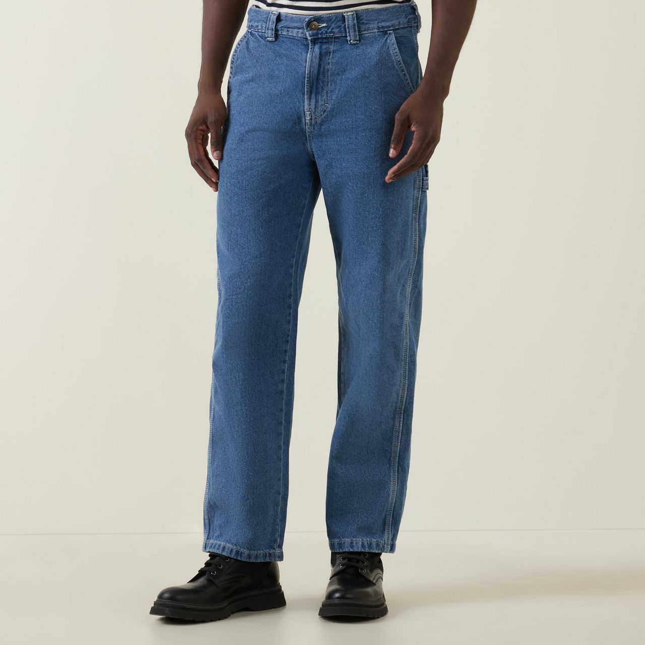 - Straight leg, mid rise, dual tool pockets, two open back pockets, zip and button fly, hammer loop, loose fit
