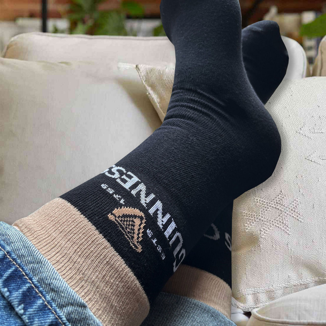 - Elasticated rib-knit cuffs, contrasting finish, designed to look like a pint of Guinness, Harp with logo lettering on the ankle, part of the Official Merchandise Collection