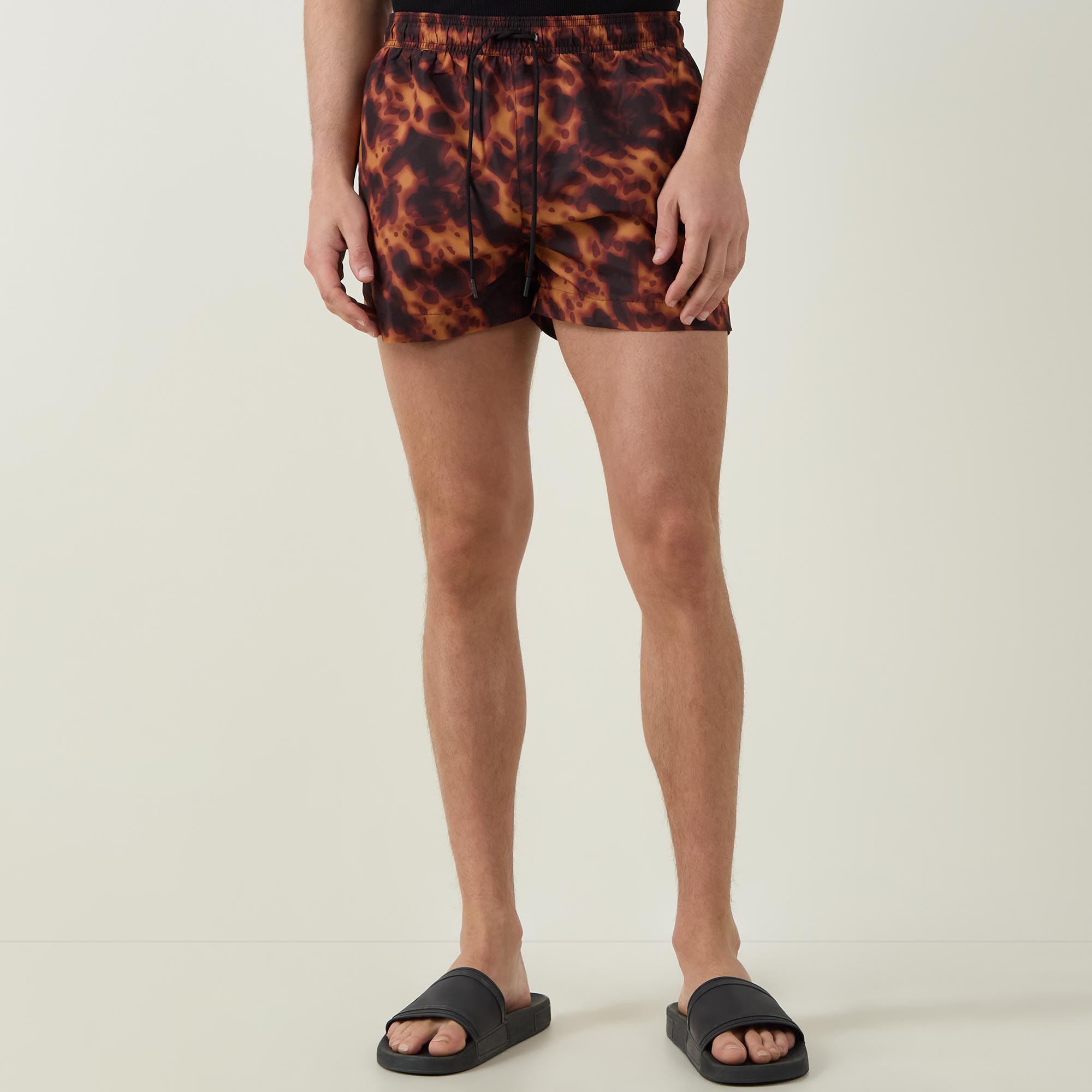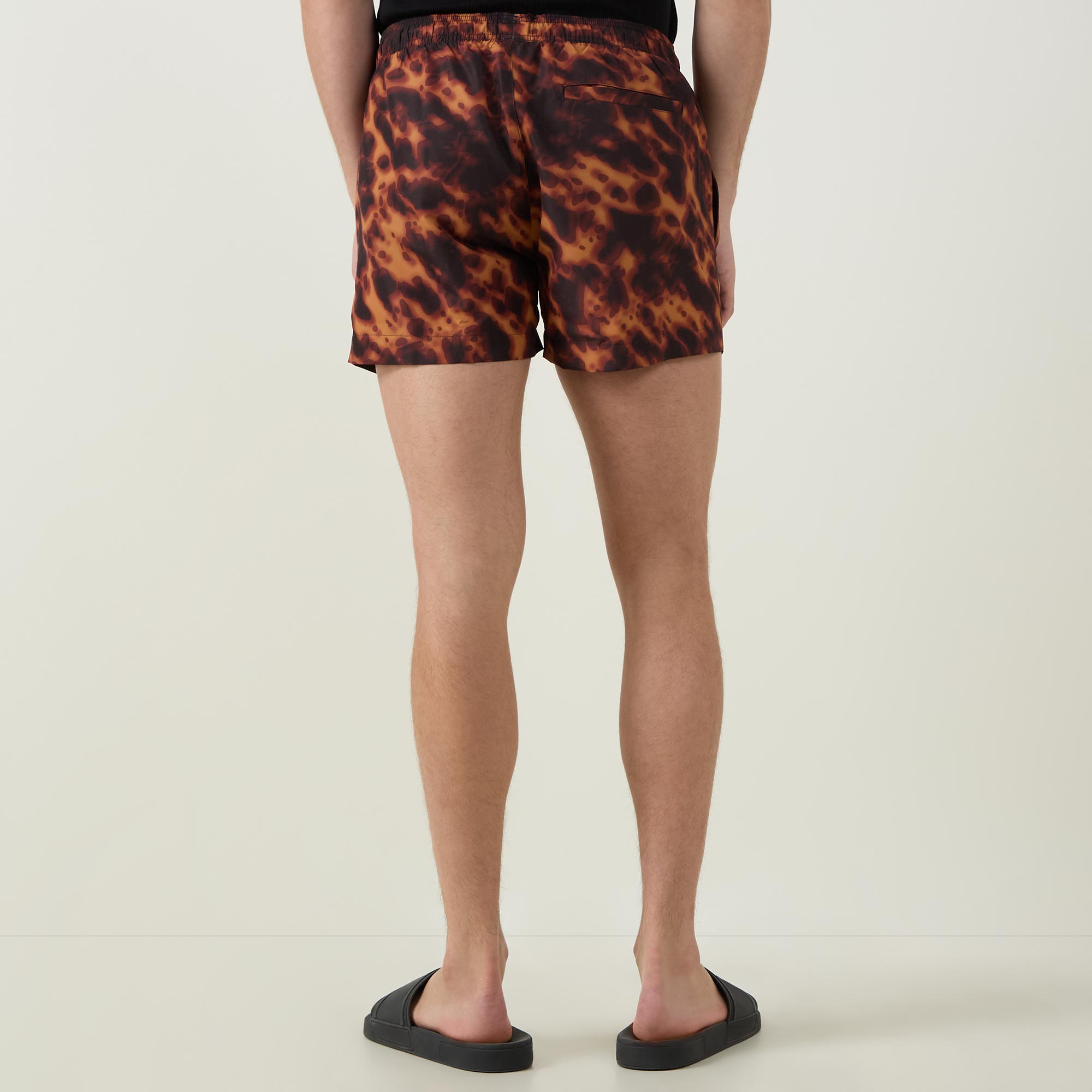 - Elasticated waistband with drawstring adjustable fit, side entry pockets, rear pocket, tortoise print, logo detail