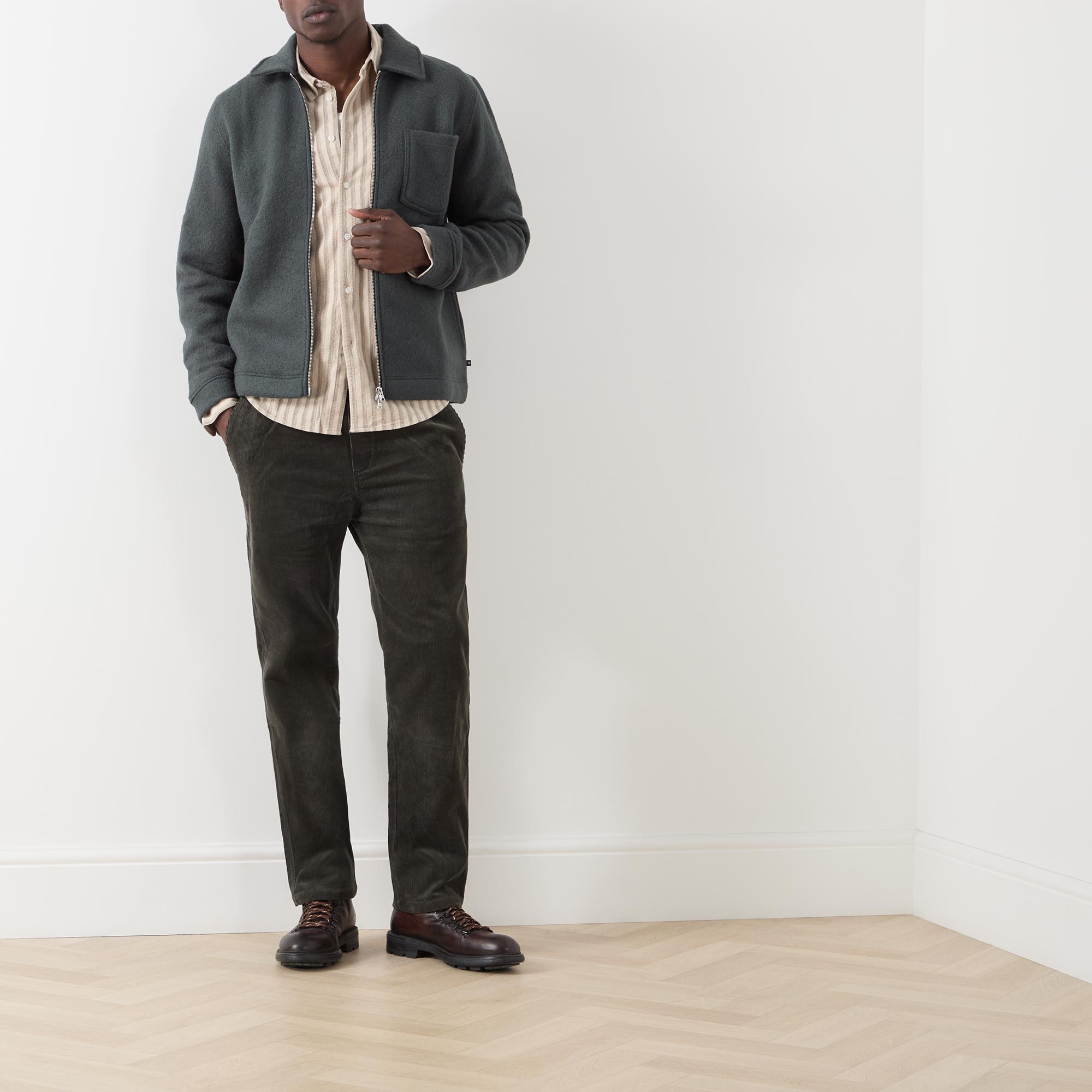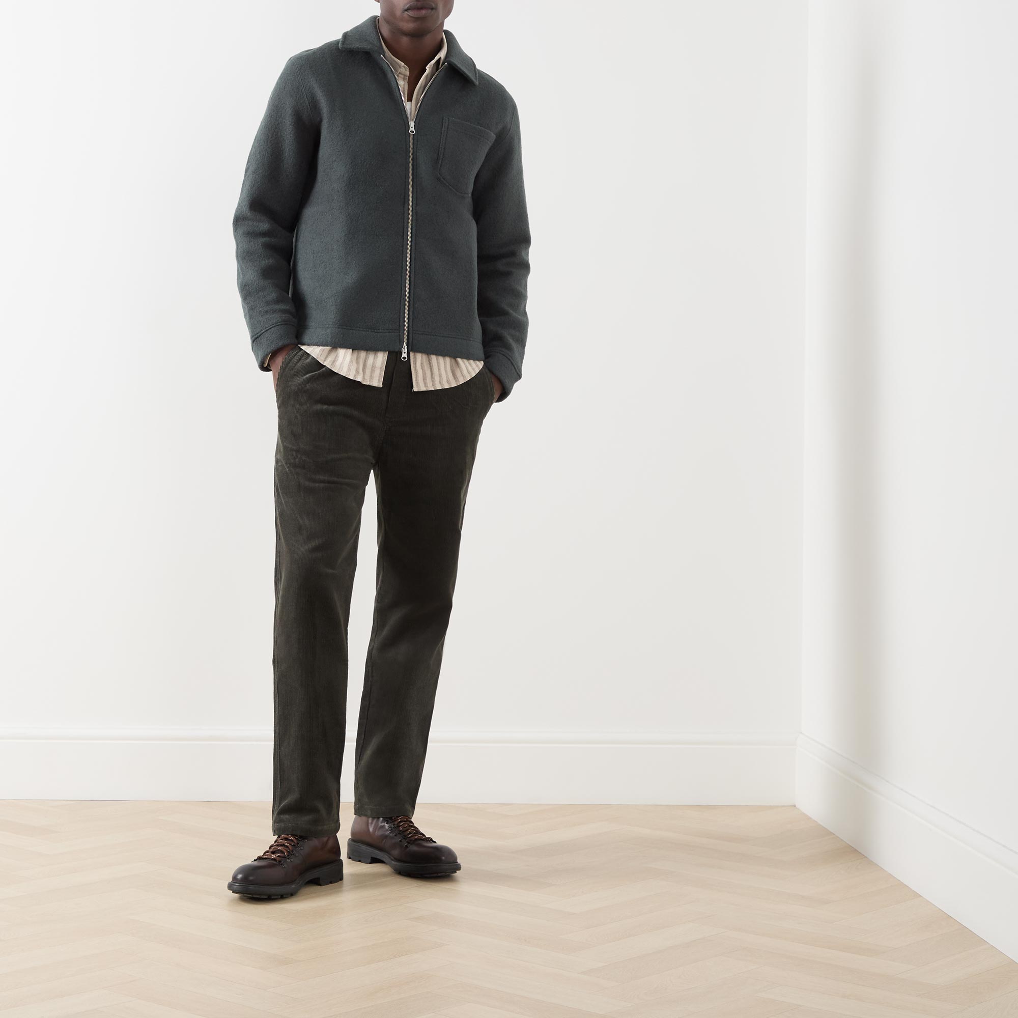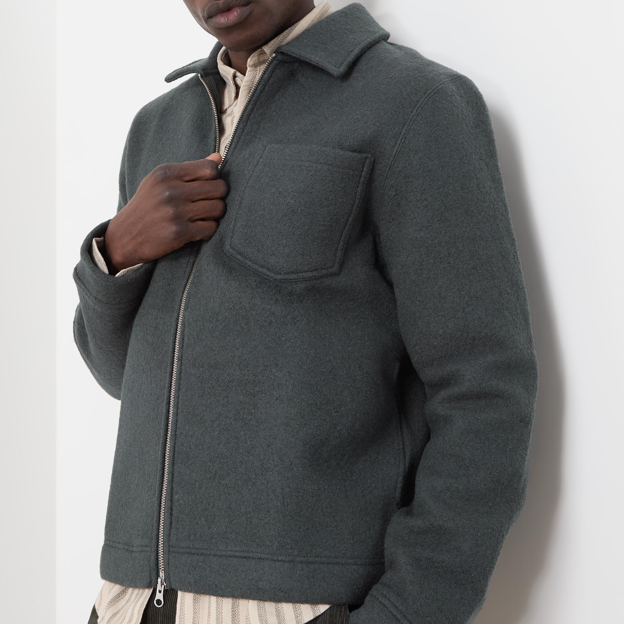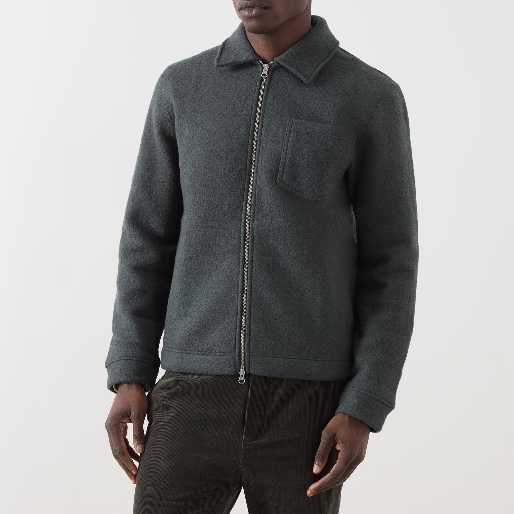 • Spread collar, two-way zip fastening, patch chest pocket, clean hems