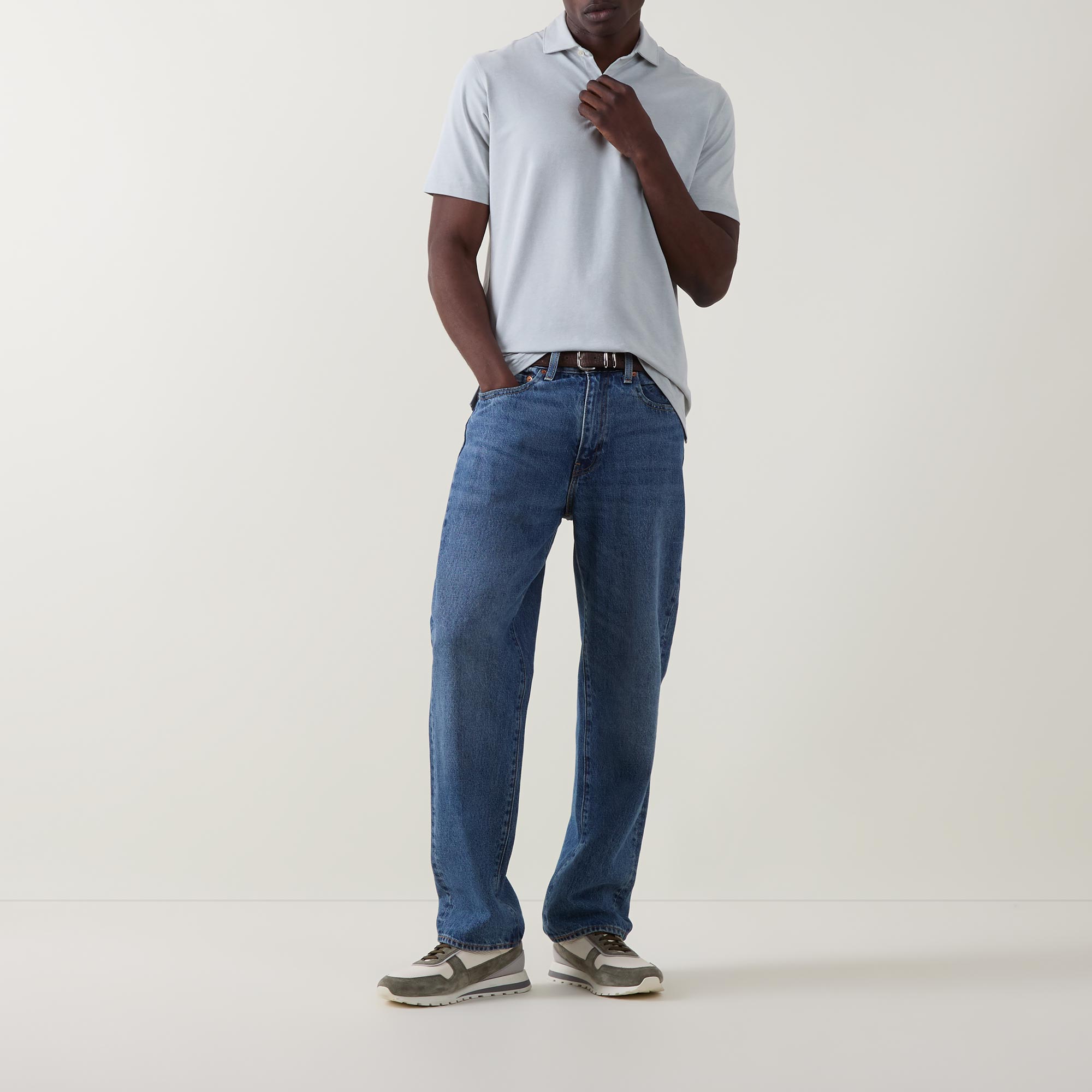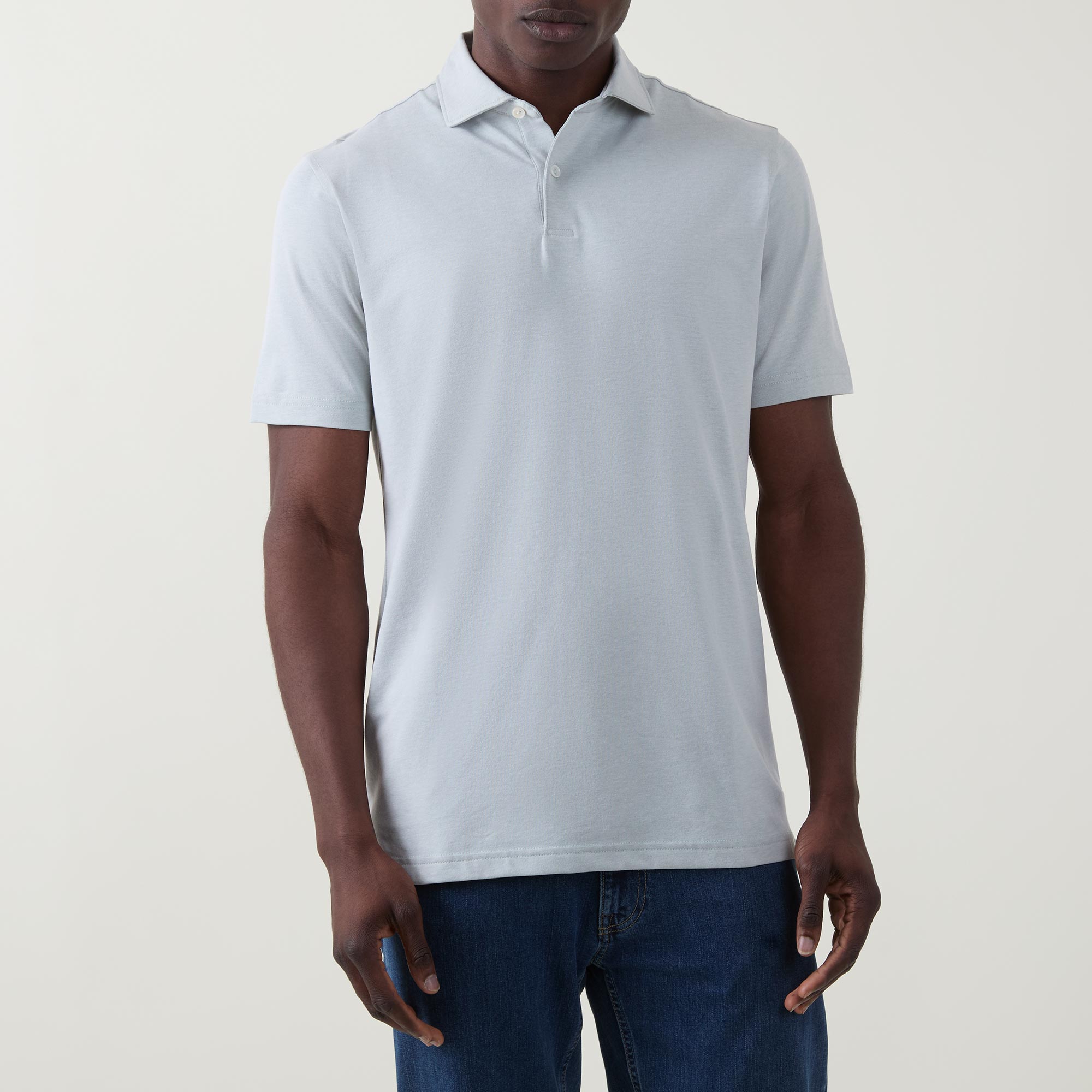- Short sleeves, polo collar, straight hemline, button fastening