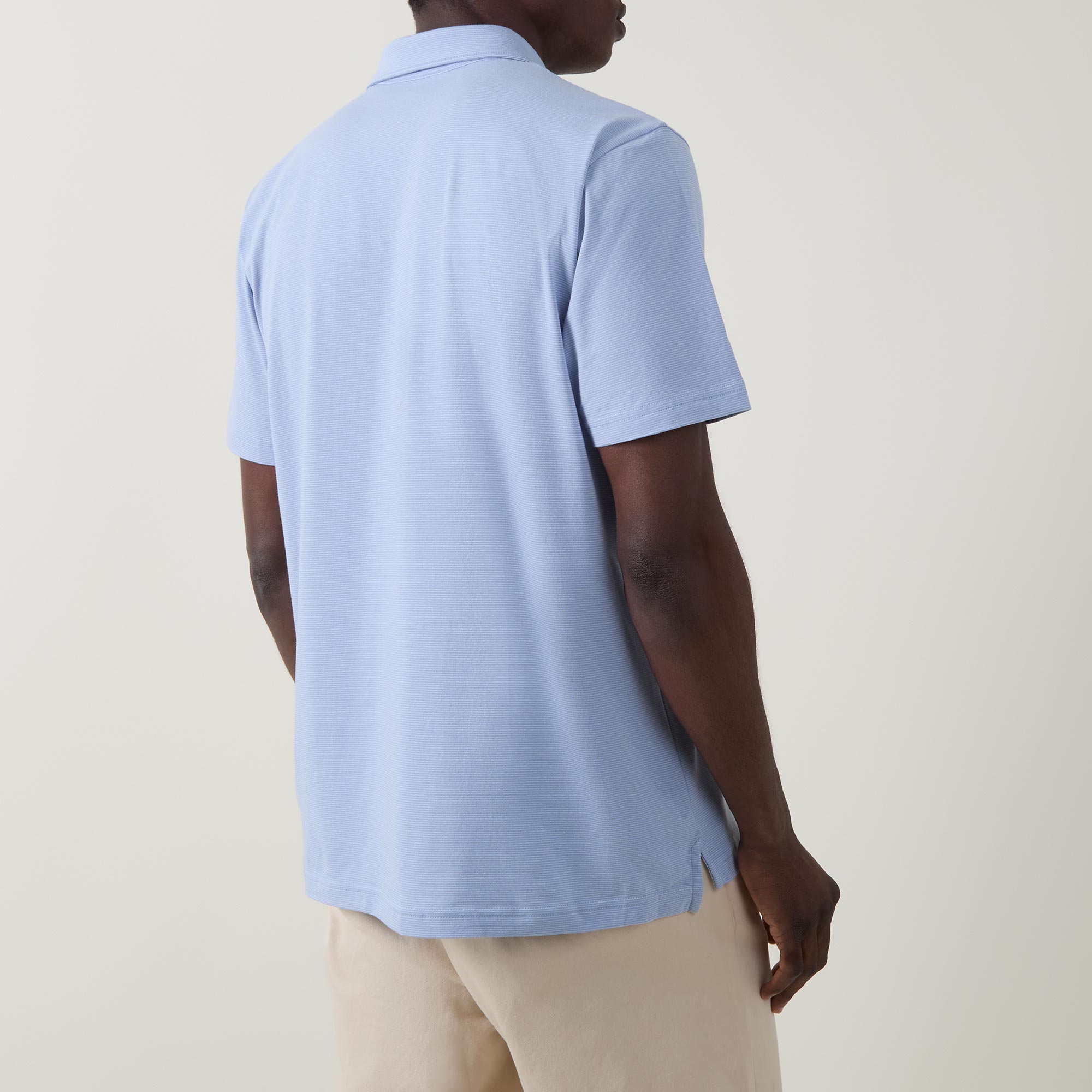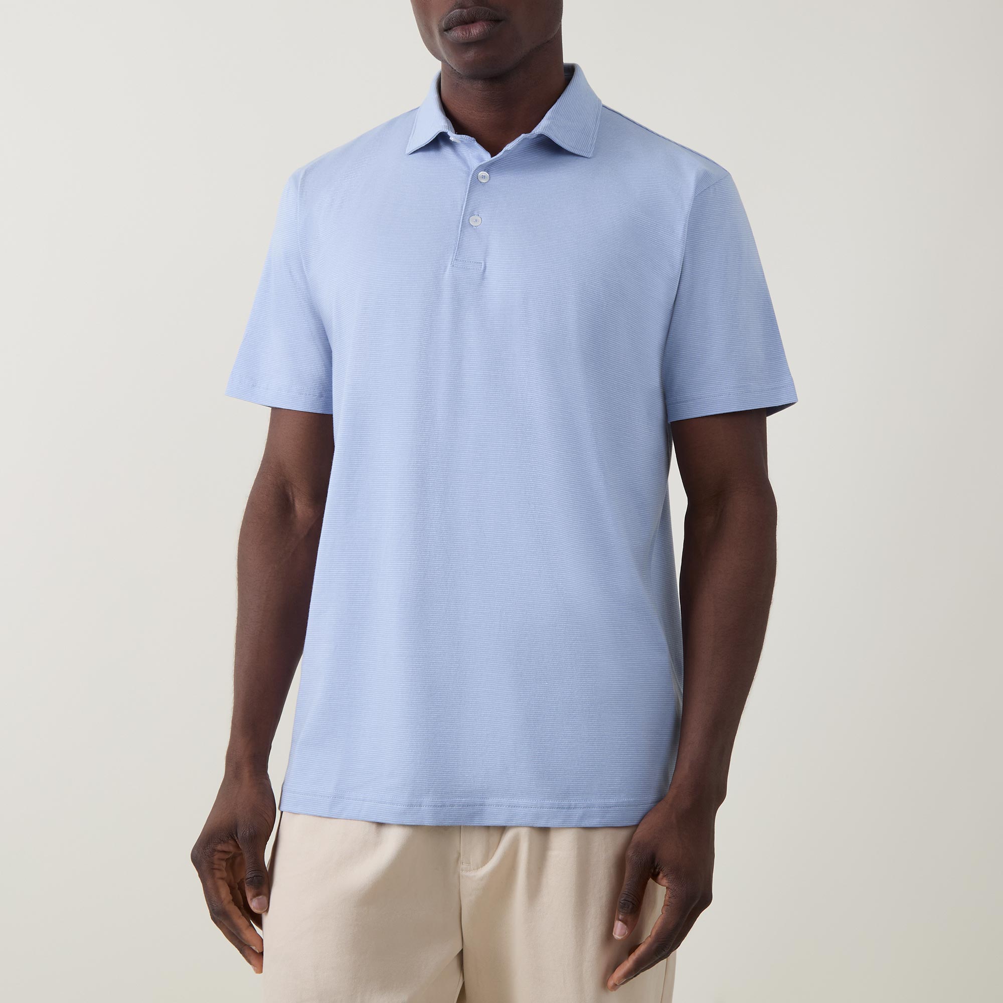 - Cutaway polo collar, three button placket, short sleeves, straight hem, tonal stitching, stretch fabric, silky soft finish