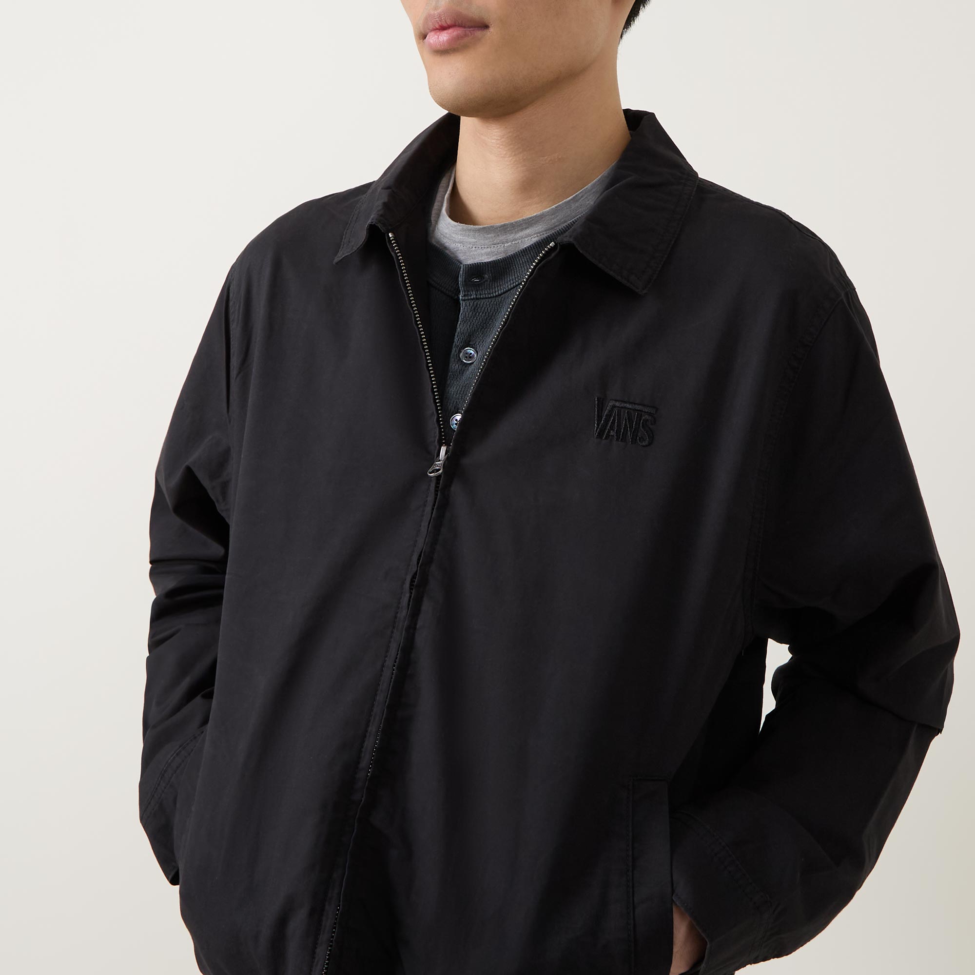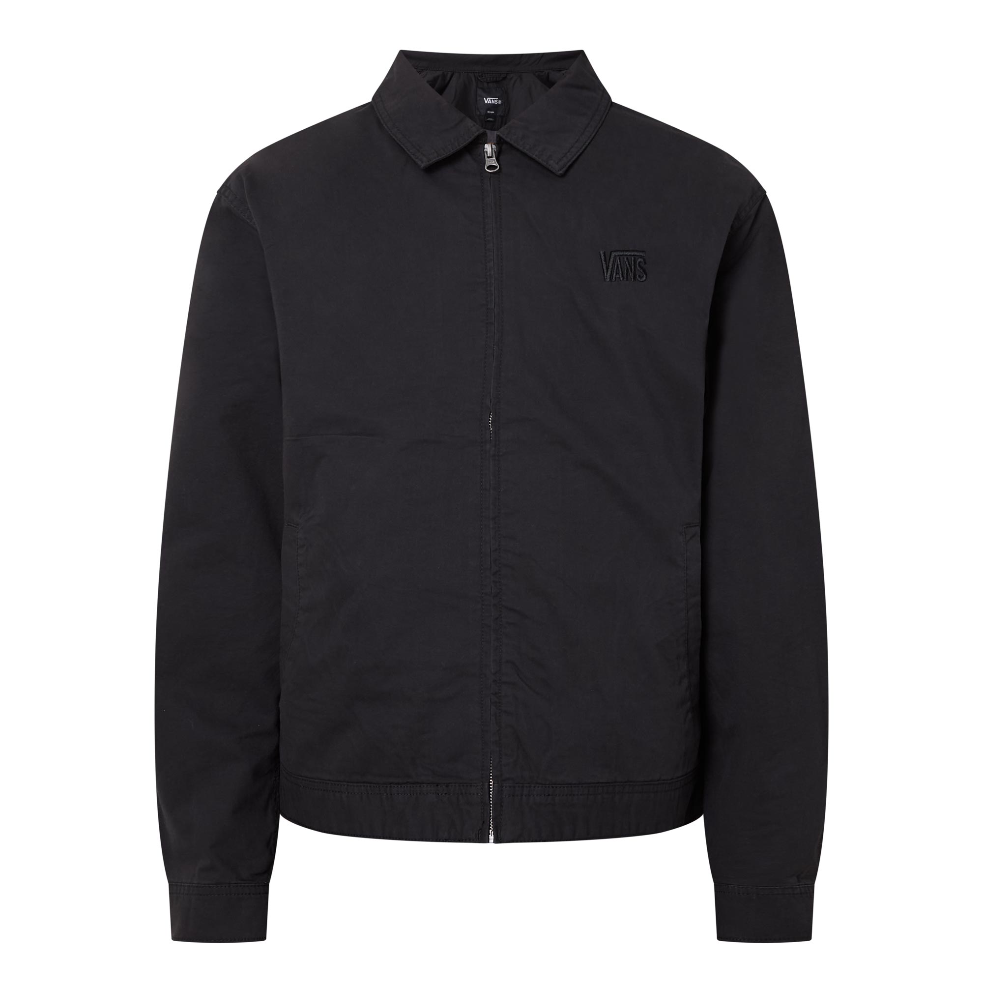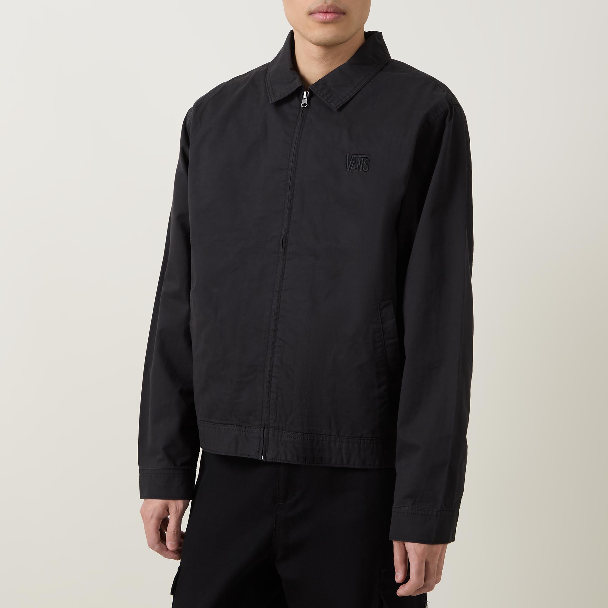 - Lightweight twill fabric, garment washed, long sleeves, zip fastening, embroidered logo, relaxed fit, side pockets, collared neckline