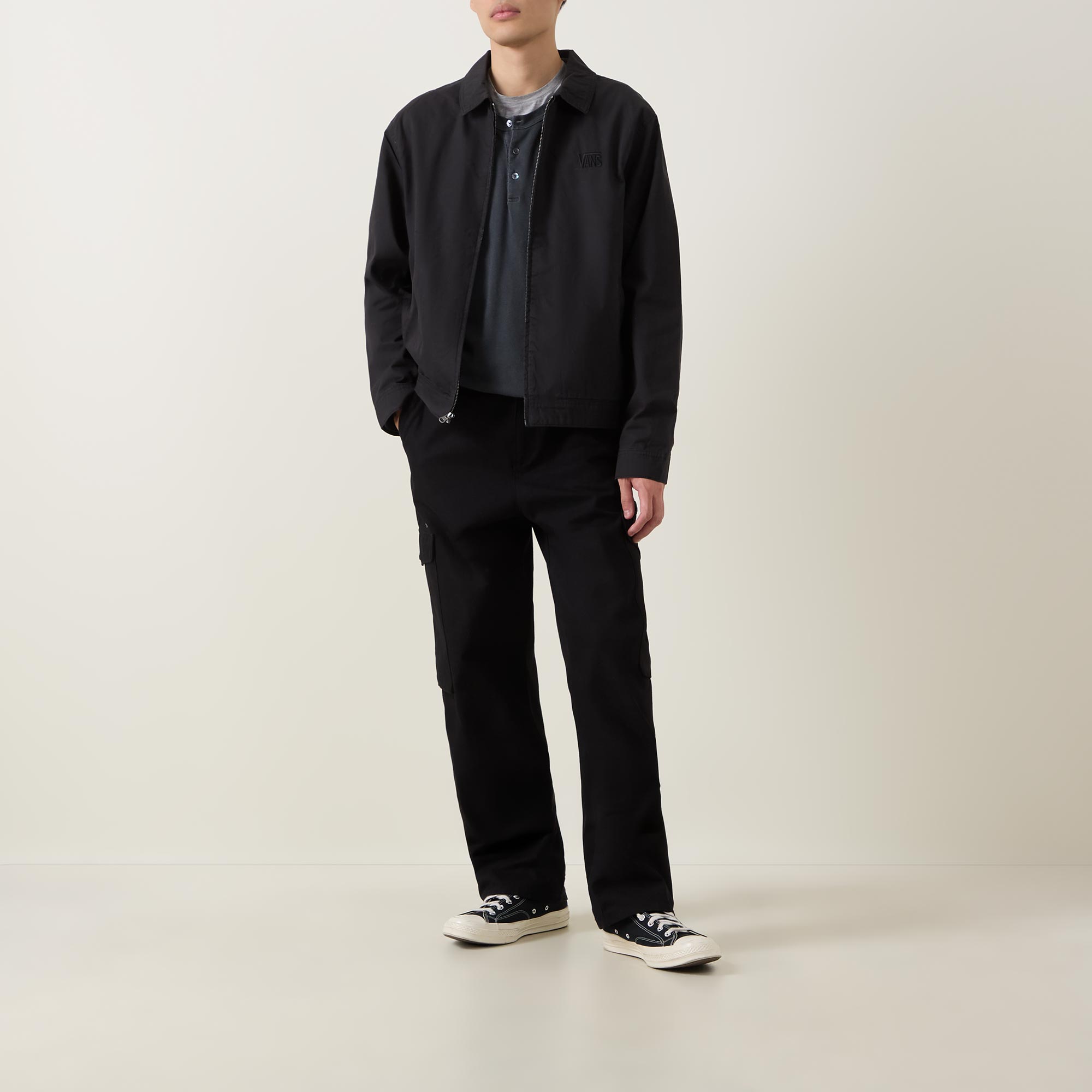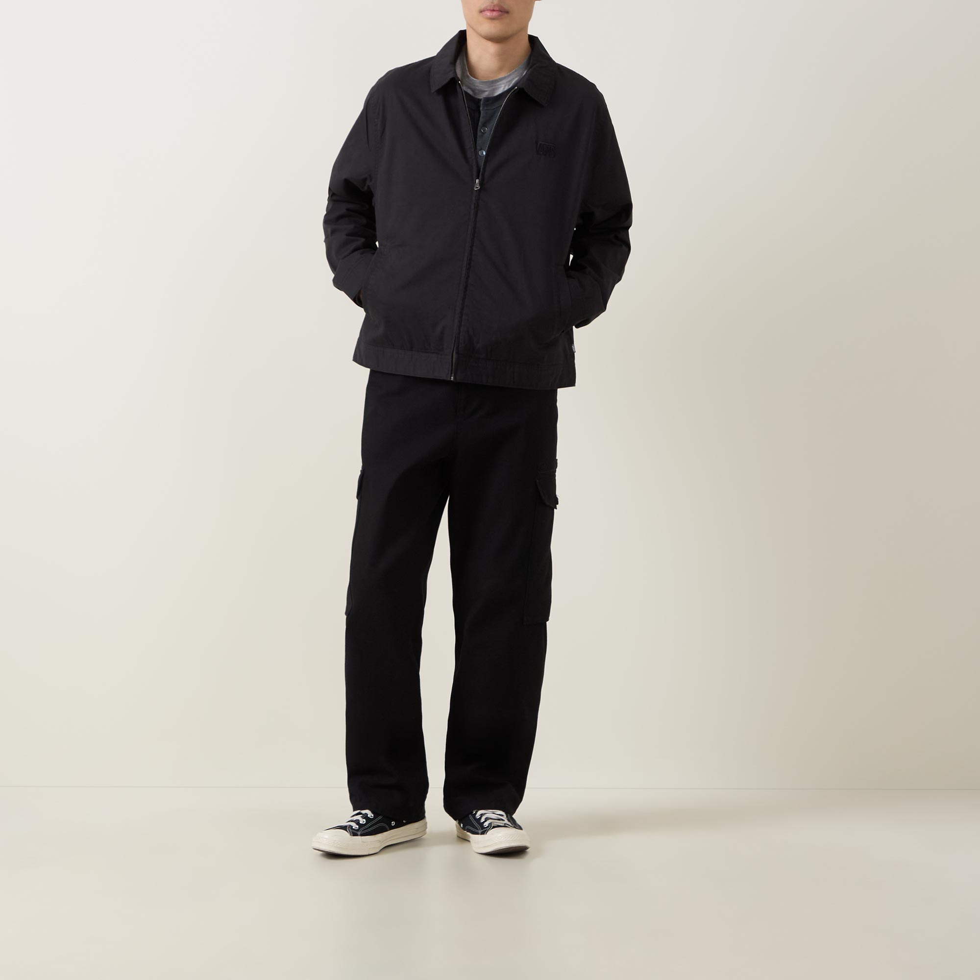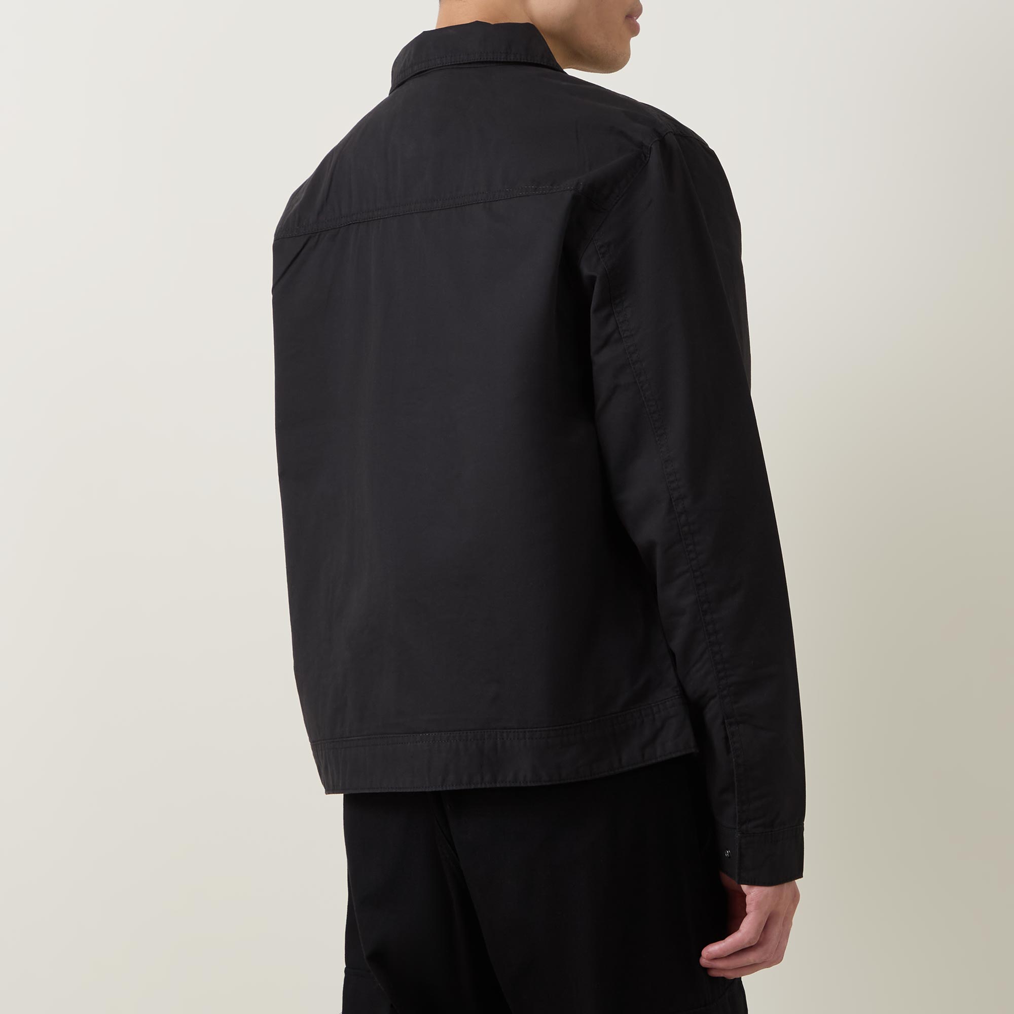 - Lightweight twill fabric, garment washed, long sleeves, zip fastening, embroidered logo, relaxed fit, side pockets, collared neckline