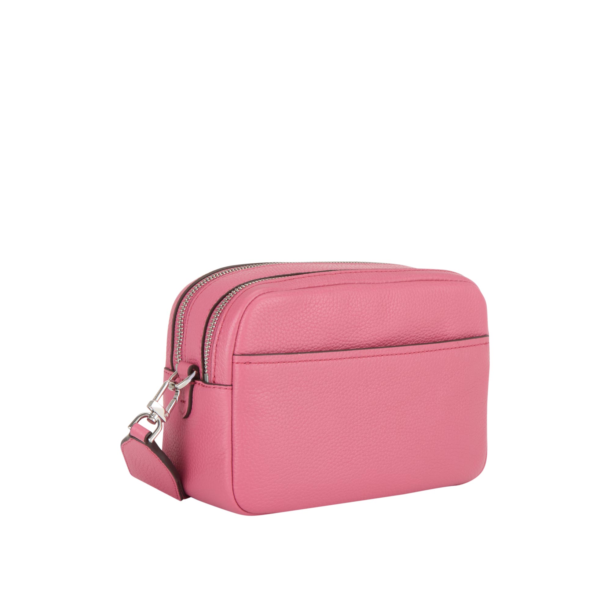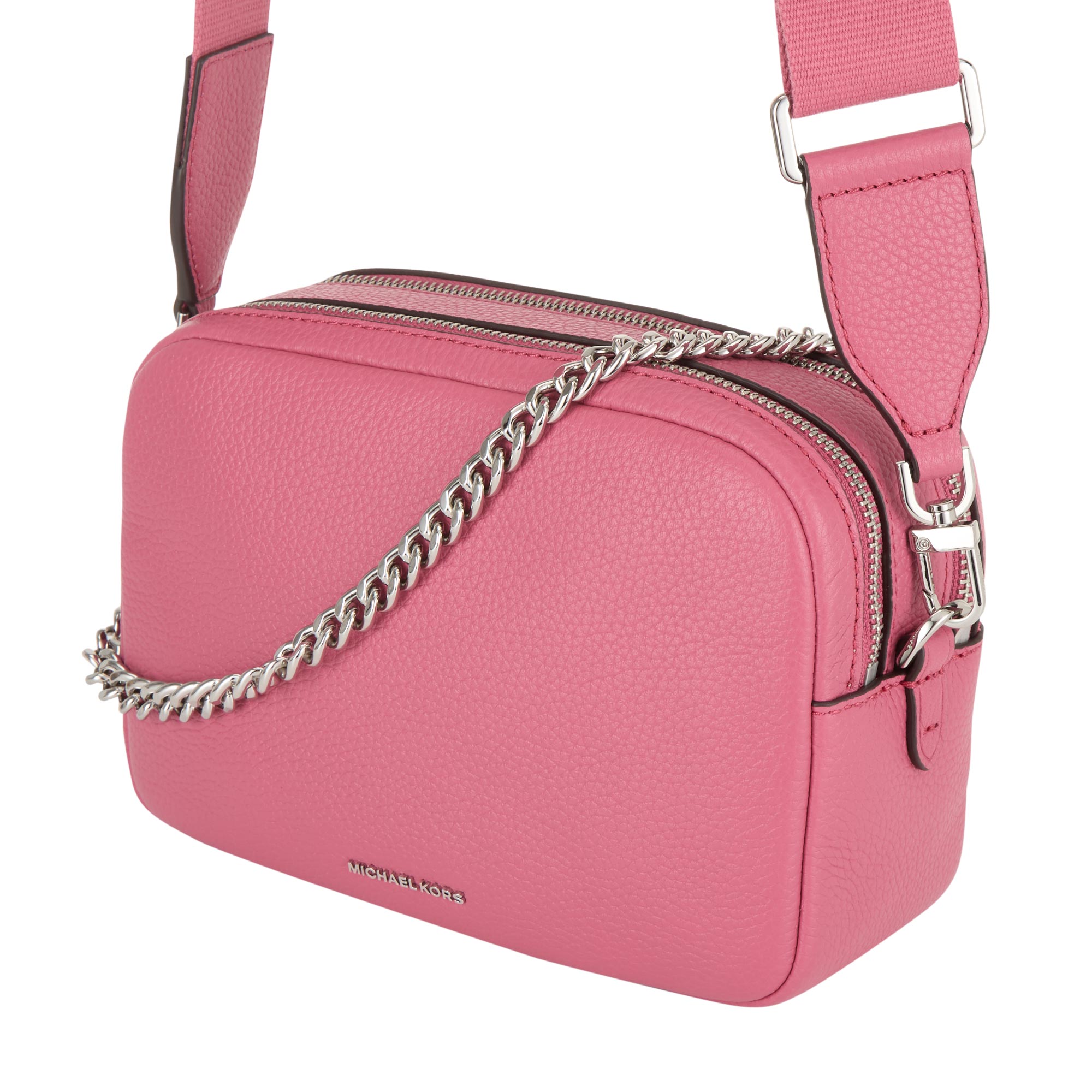 - Dual top zip fastening, detachable chain strap, adjustable crossbody strap, one rear slip pocket, logo lettering on the front, silver-tone hardware, textured finish