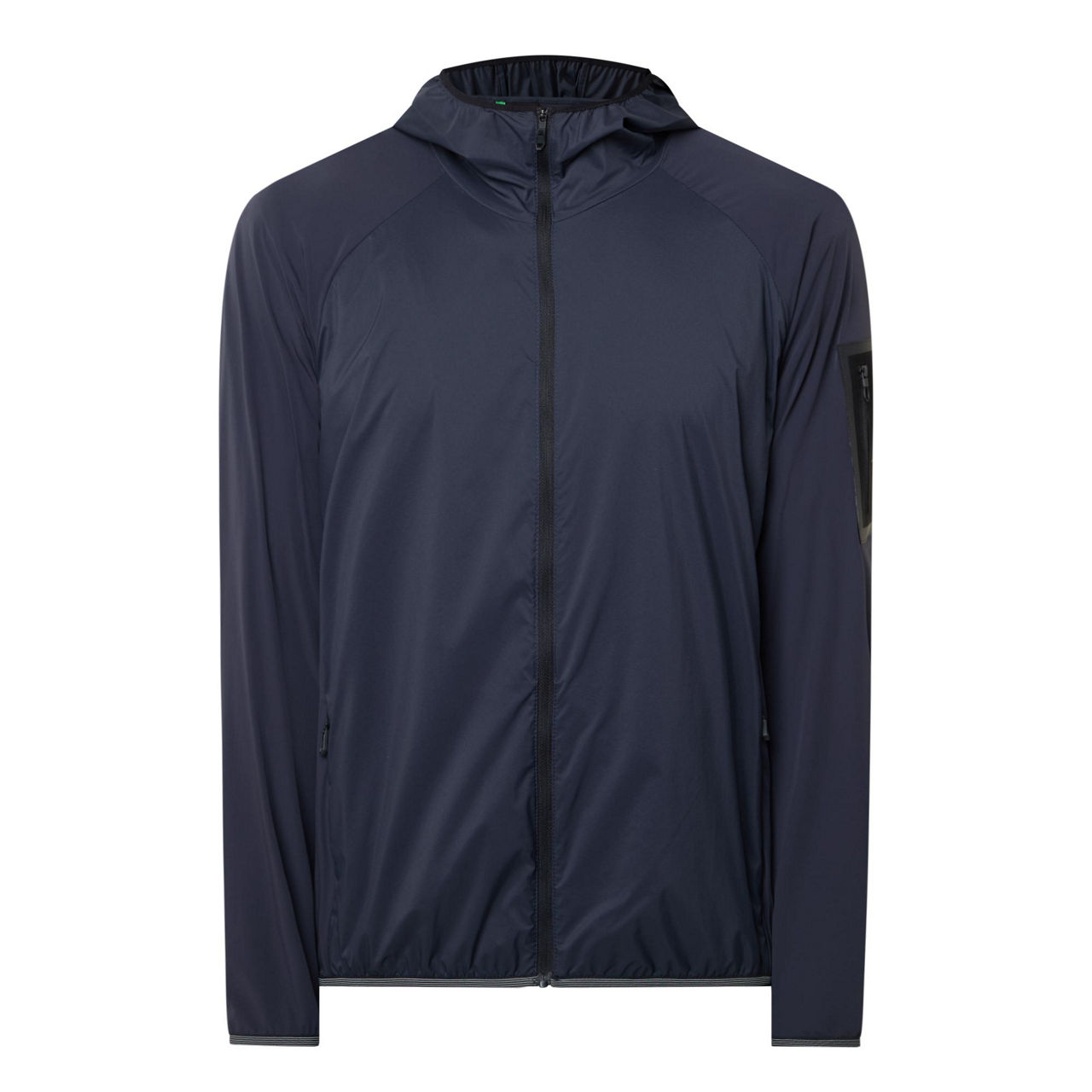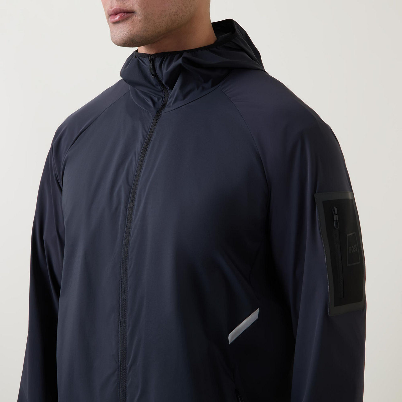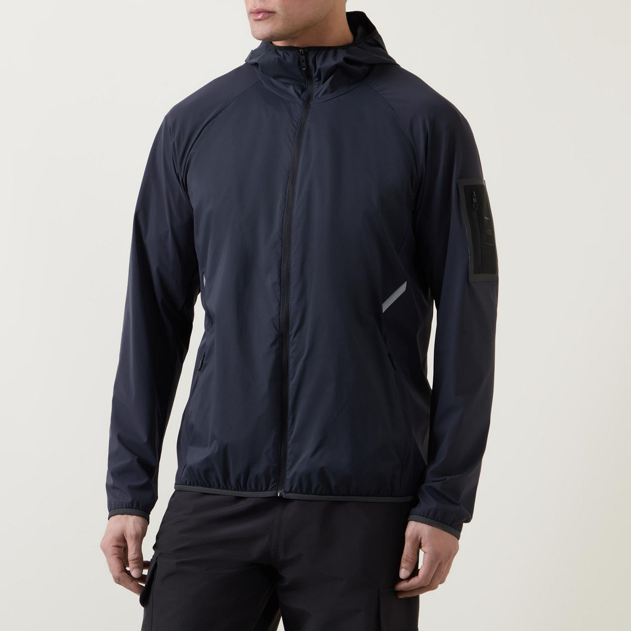 - Four-way stretch, sweat absorbent, quick dry, hood, zip fastening, elasticated trims, zipped pockets, zipped sleeve pocket with logo detail