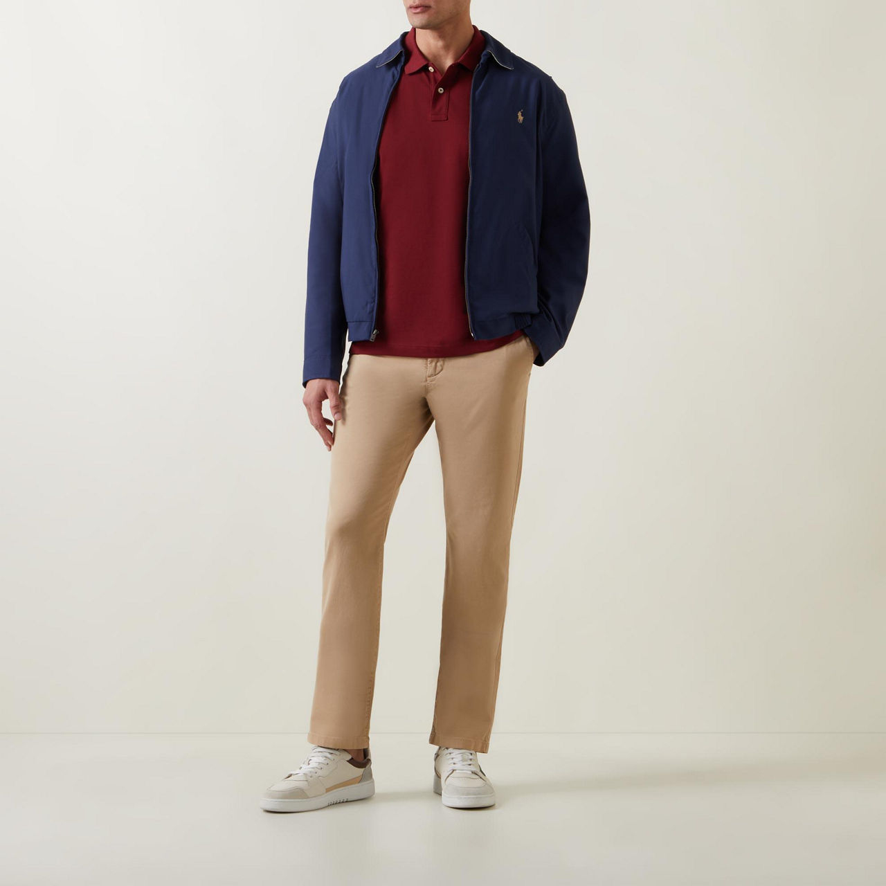 - Flat knit collar and cuffs, button fastening, split side seams. Straight hemline, embroidered shield logo