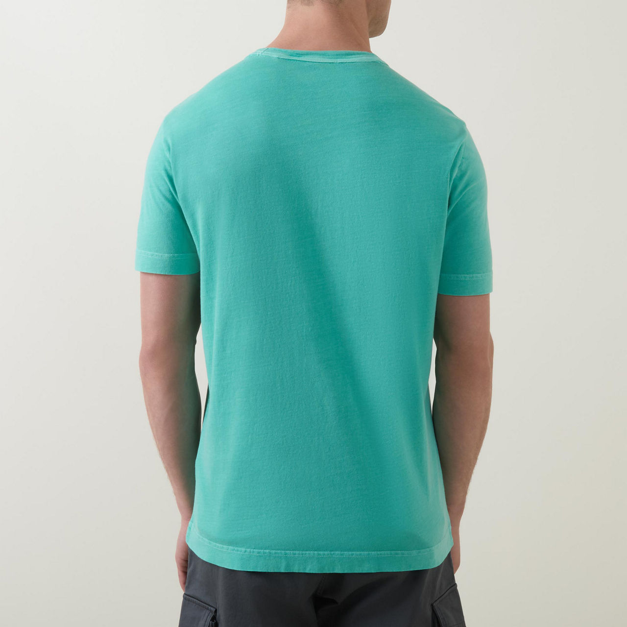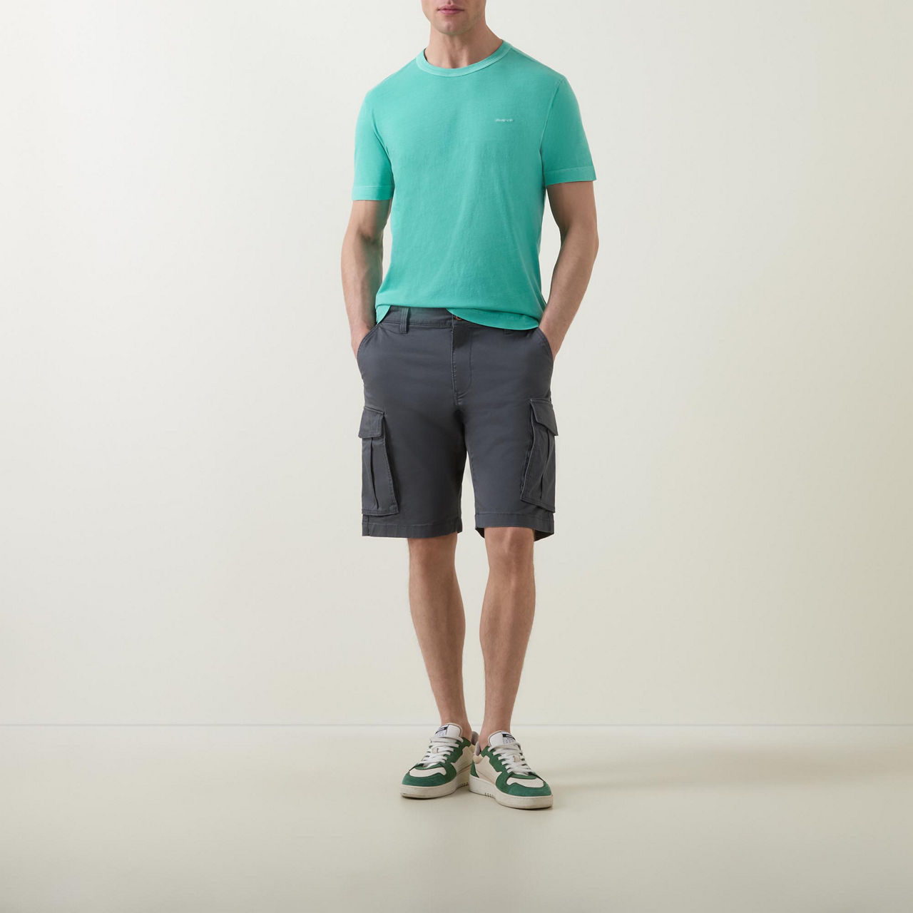 - Crew neckline, short sleeves, tonal logo embroidery on chest, tonal stitching, straight hemline, smooth fabric