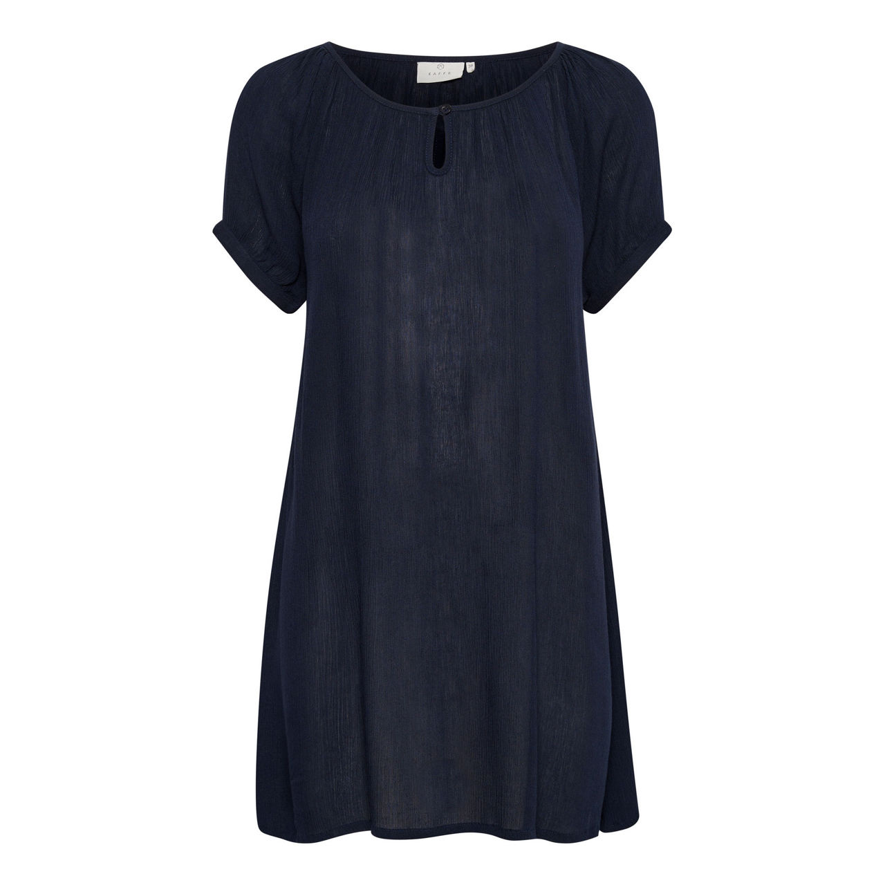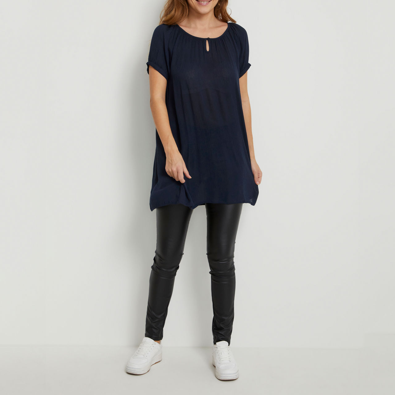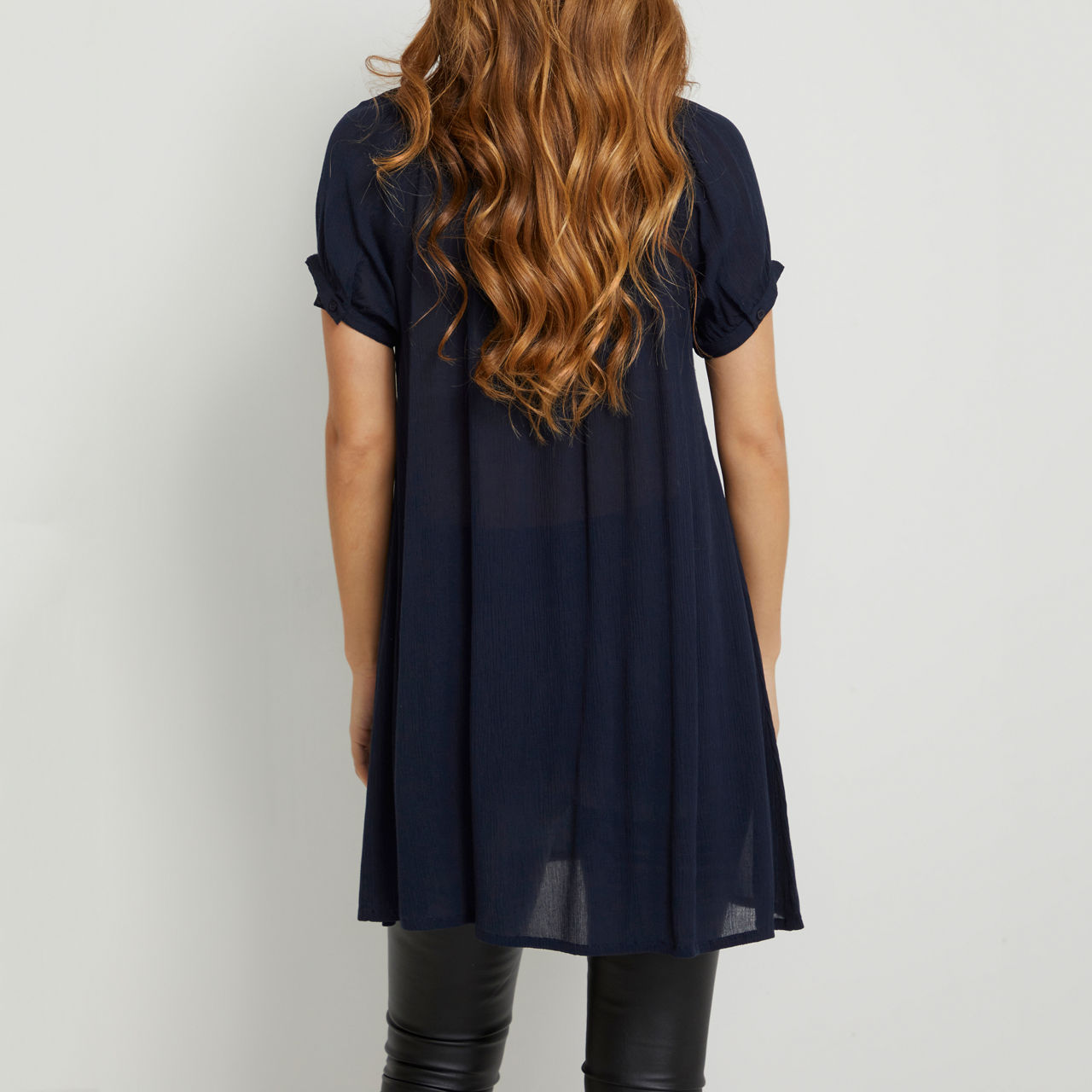• Longline, short sleeves, round keyhole neckline with button fastening, buttoned cuffs