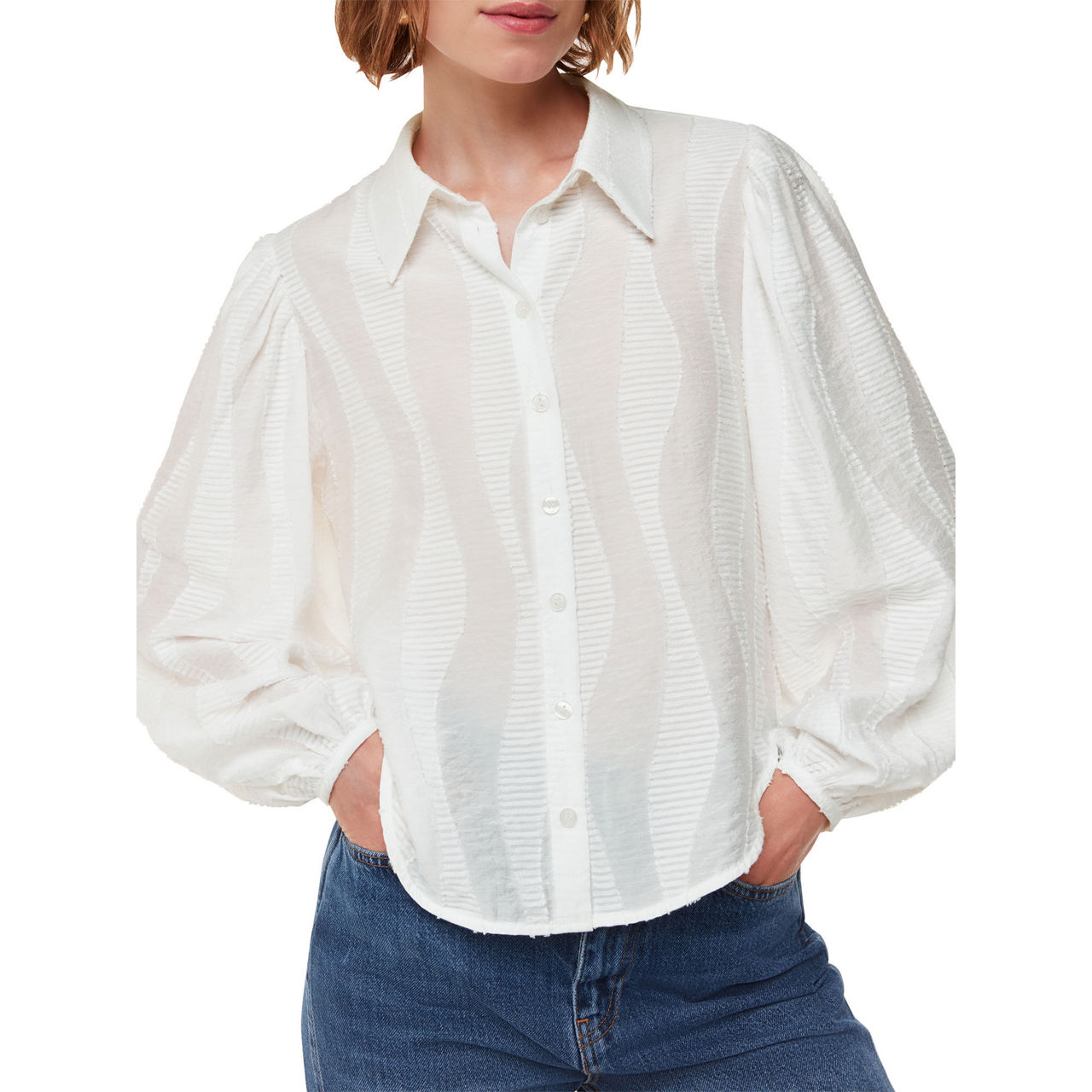 - Classic collar, long balloon sleeves, front button fastenings, gathered details