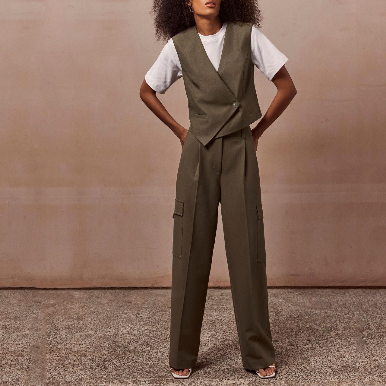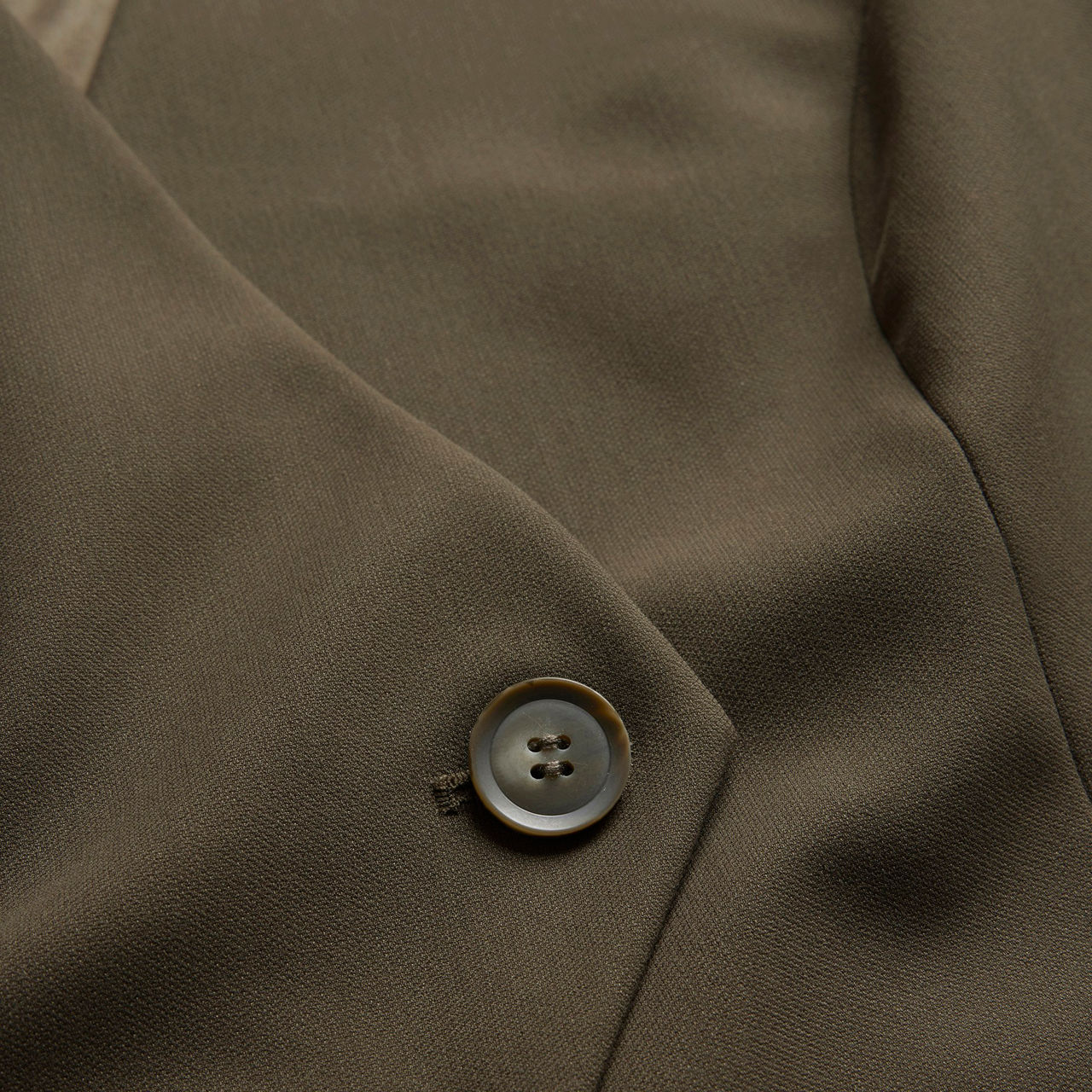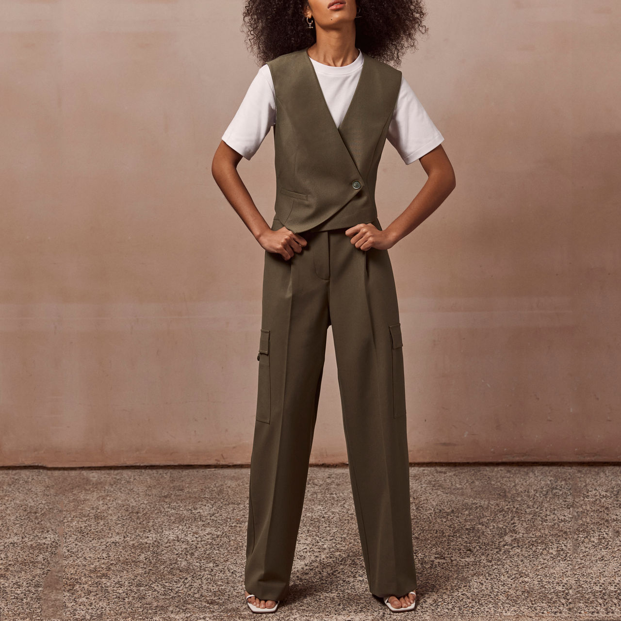 - Asymmetric silhouette, V-neckline, single-button fastening, pocket, sleeveless