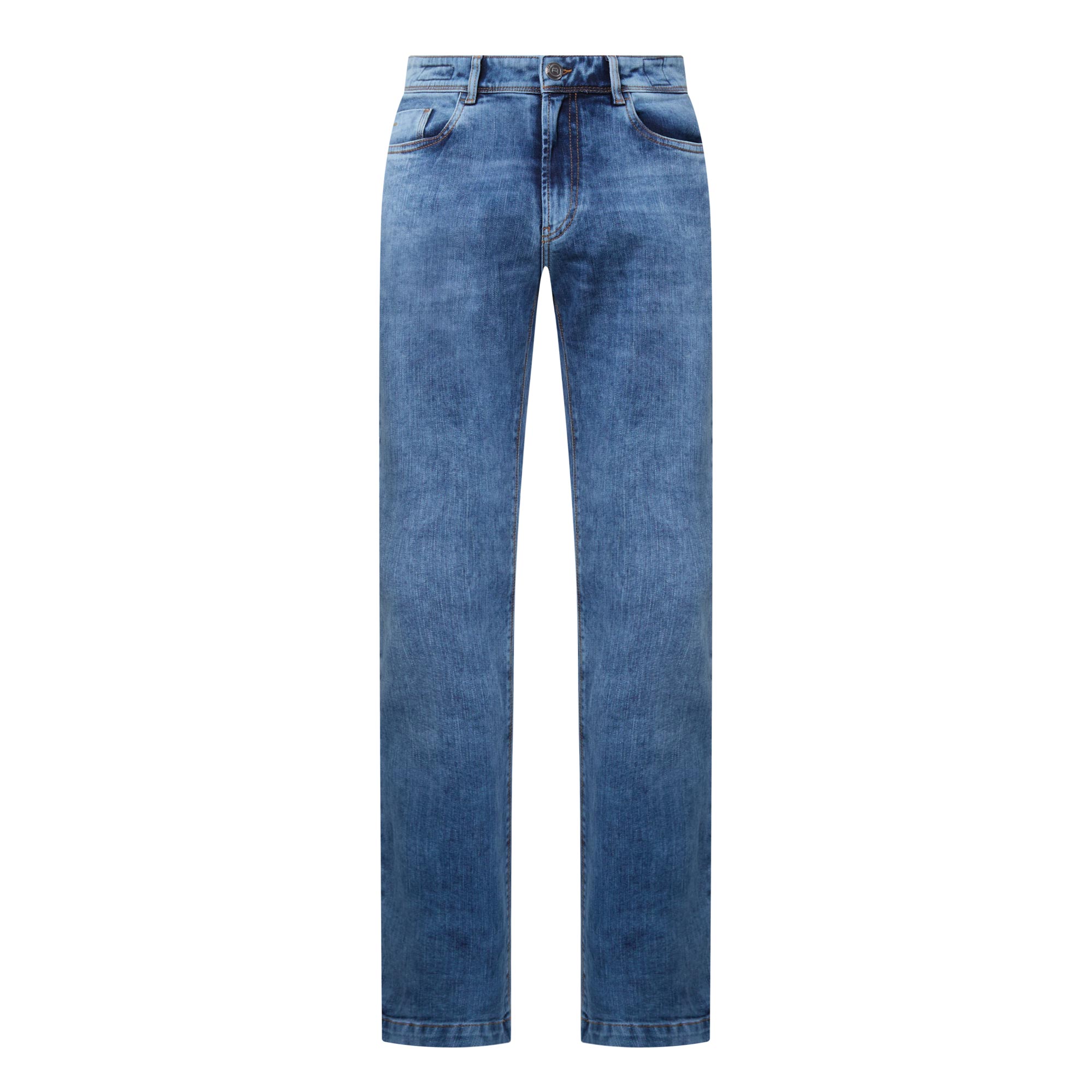 - Mid-rise, straight leg, five pockets, belt loops, logo patch